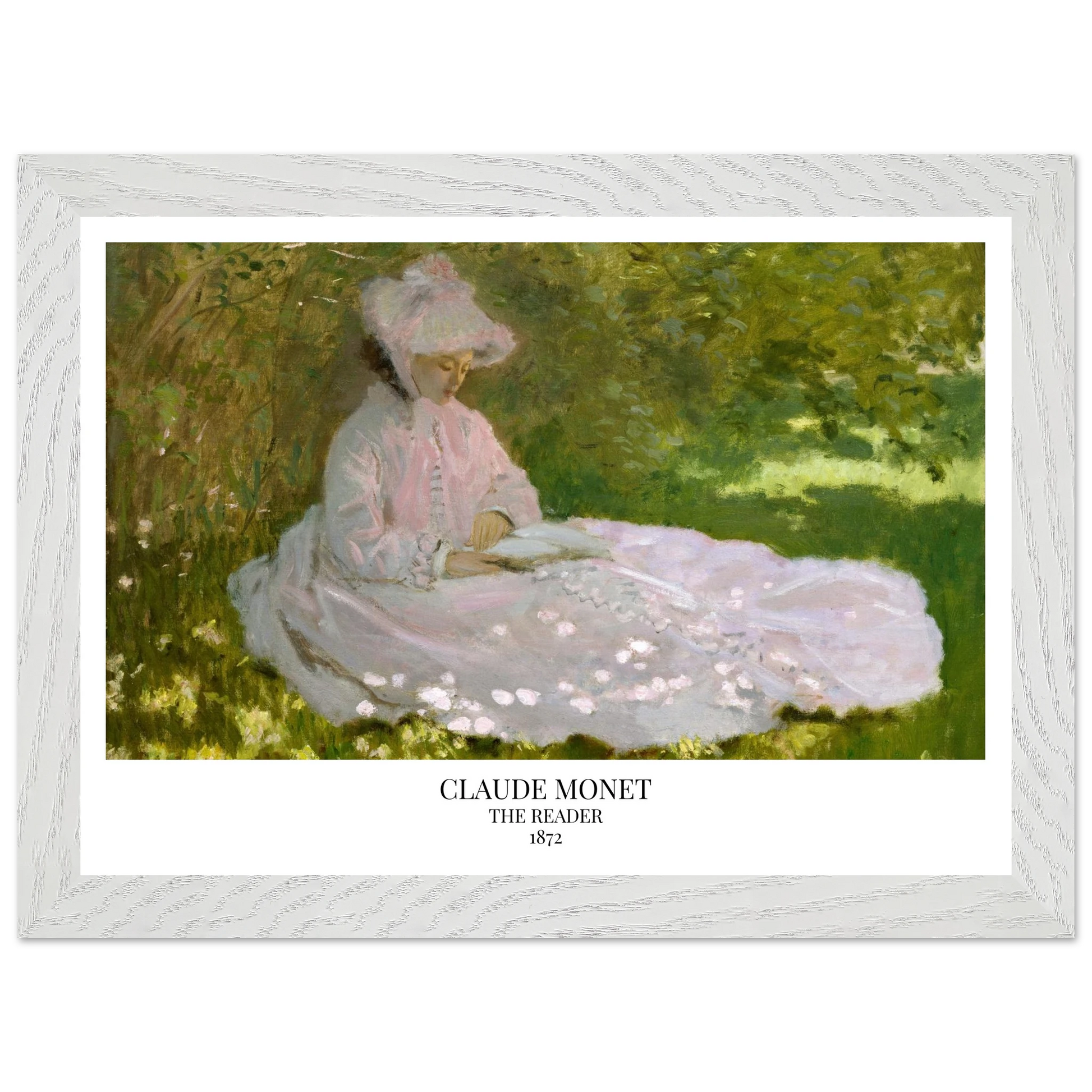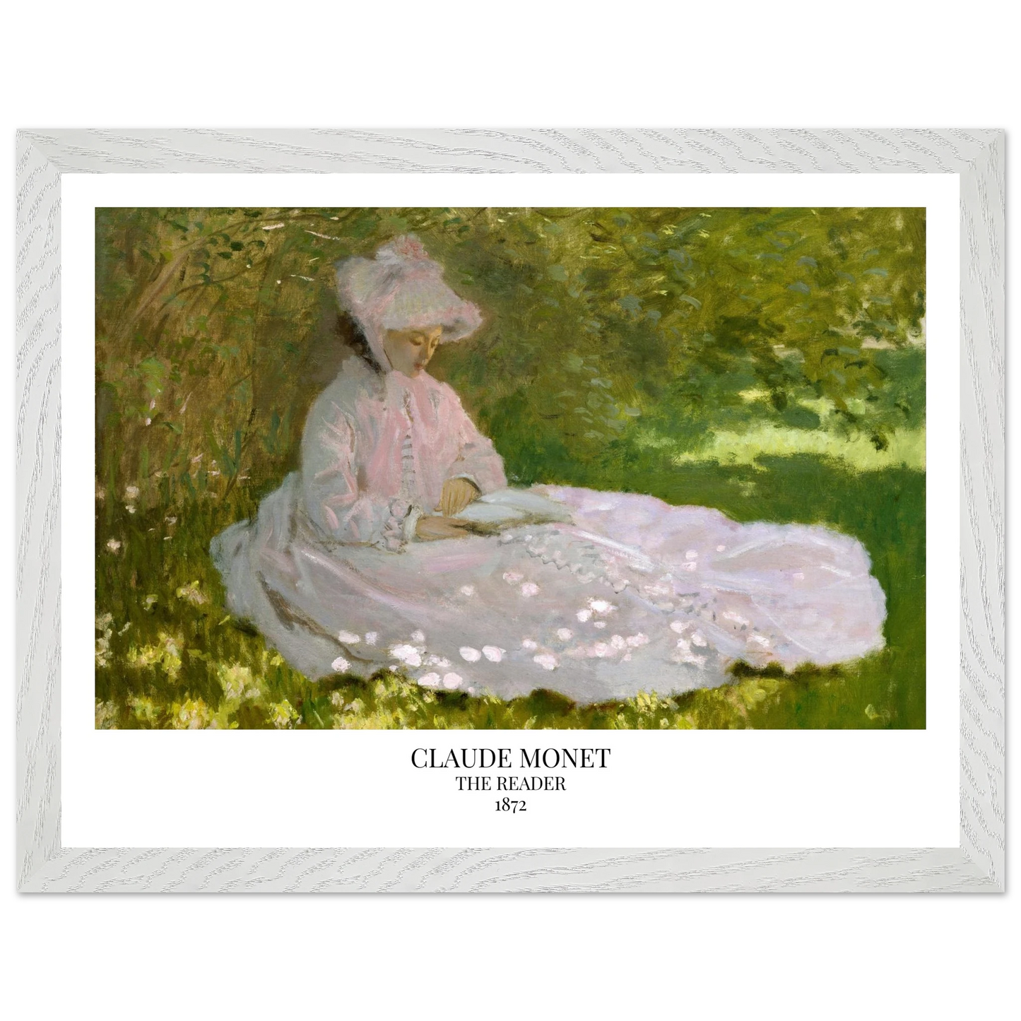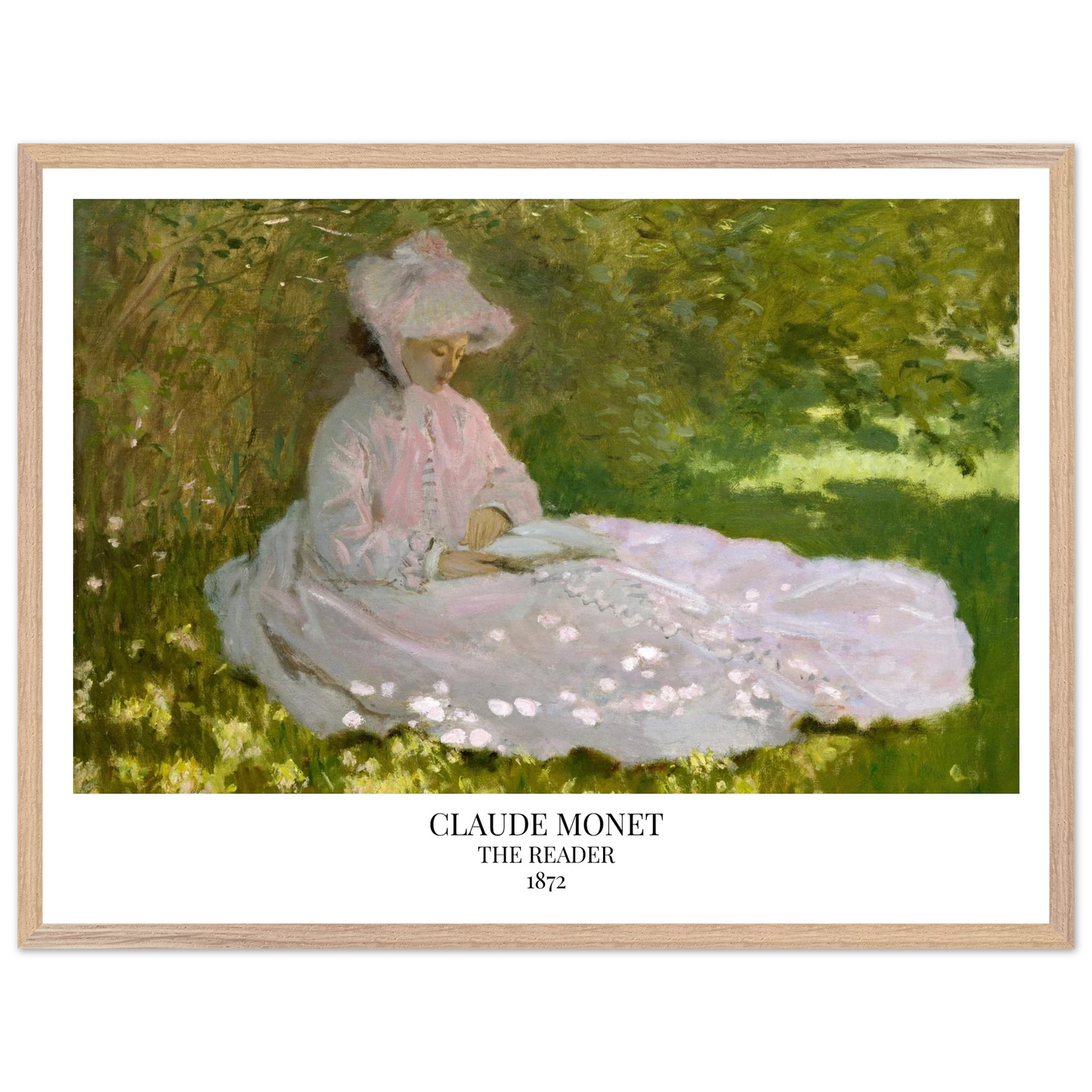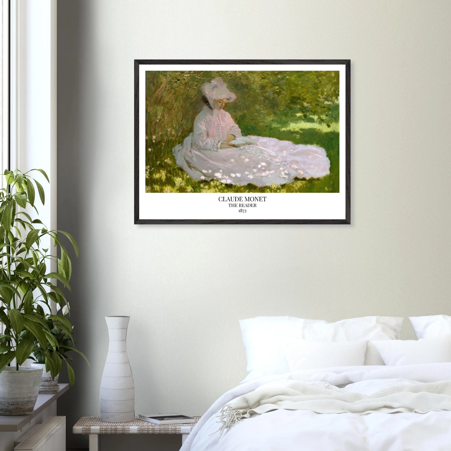 The Reader (1872) von Claude Monet zeigt Camille Monet in einem weißen Kleid, vertieft in ein Buch, umgeben von blühender Gartenvegetation. In zarten Farben und weichem Licht fängt das Gemälde einen stillen Moment der Konzentration und Ruhe ein – ein intimes Porträt des Alltagslebens.