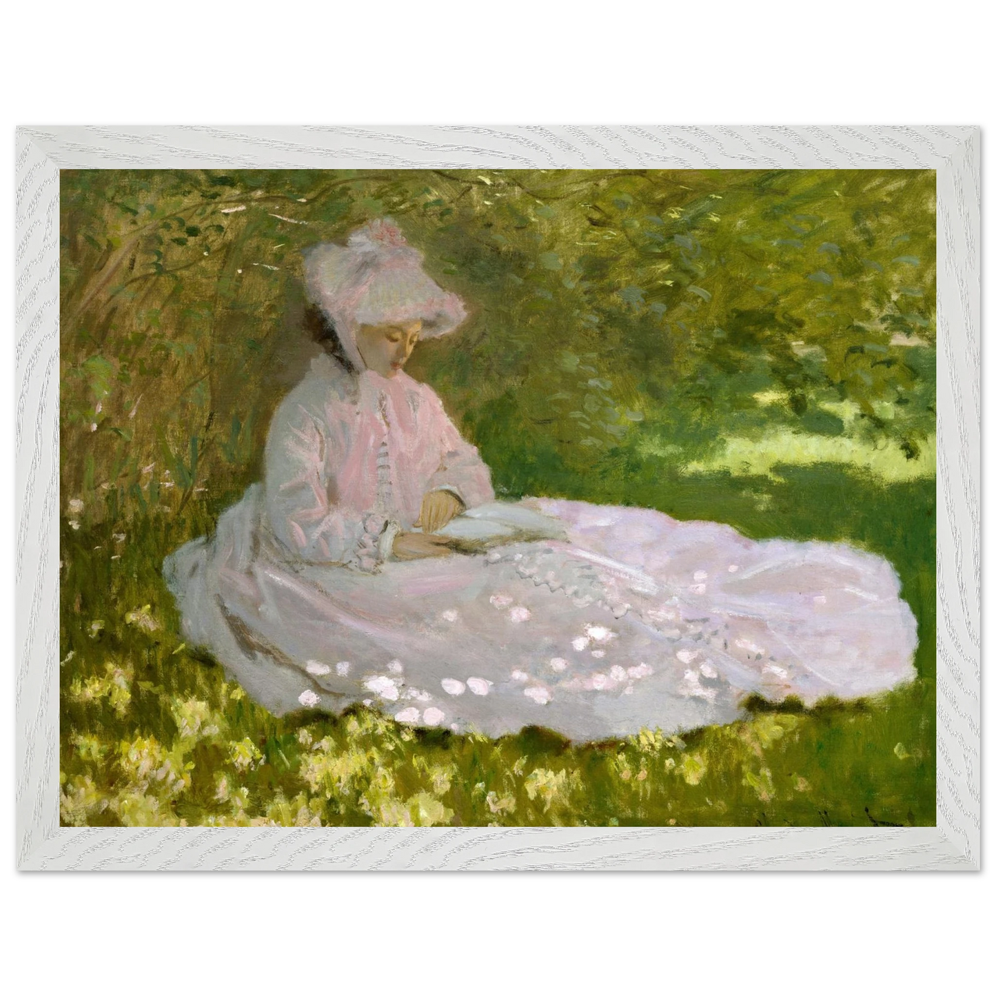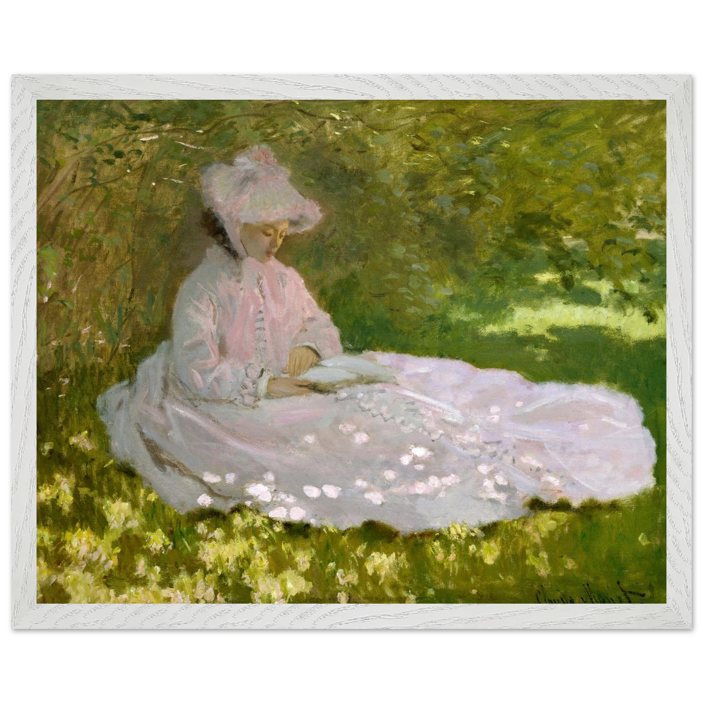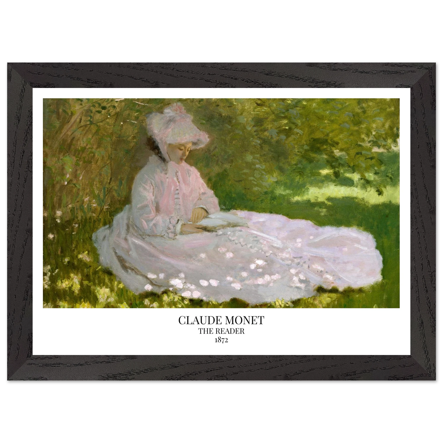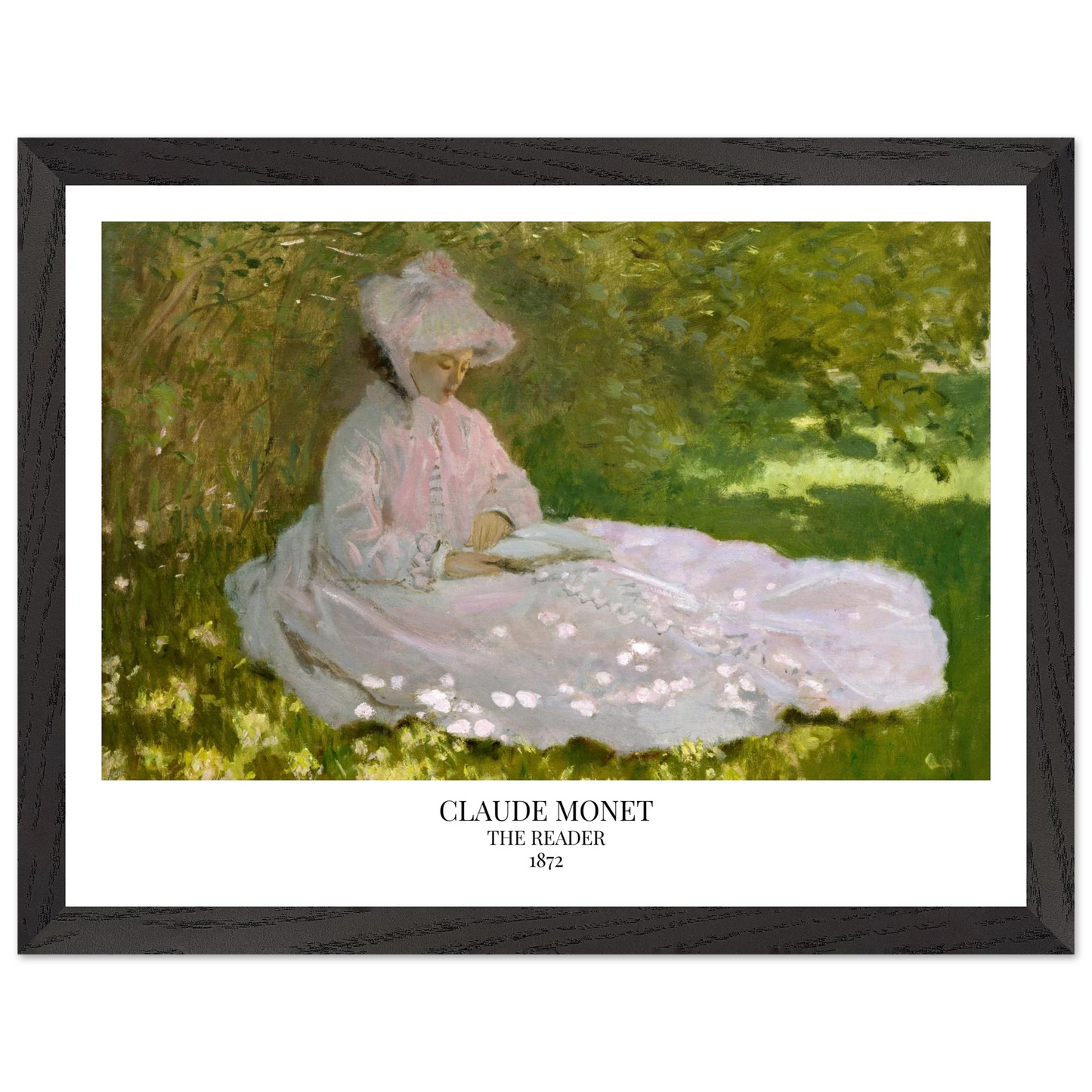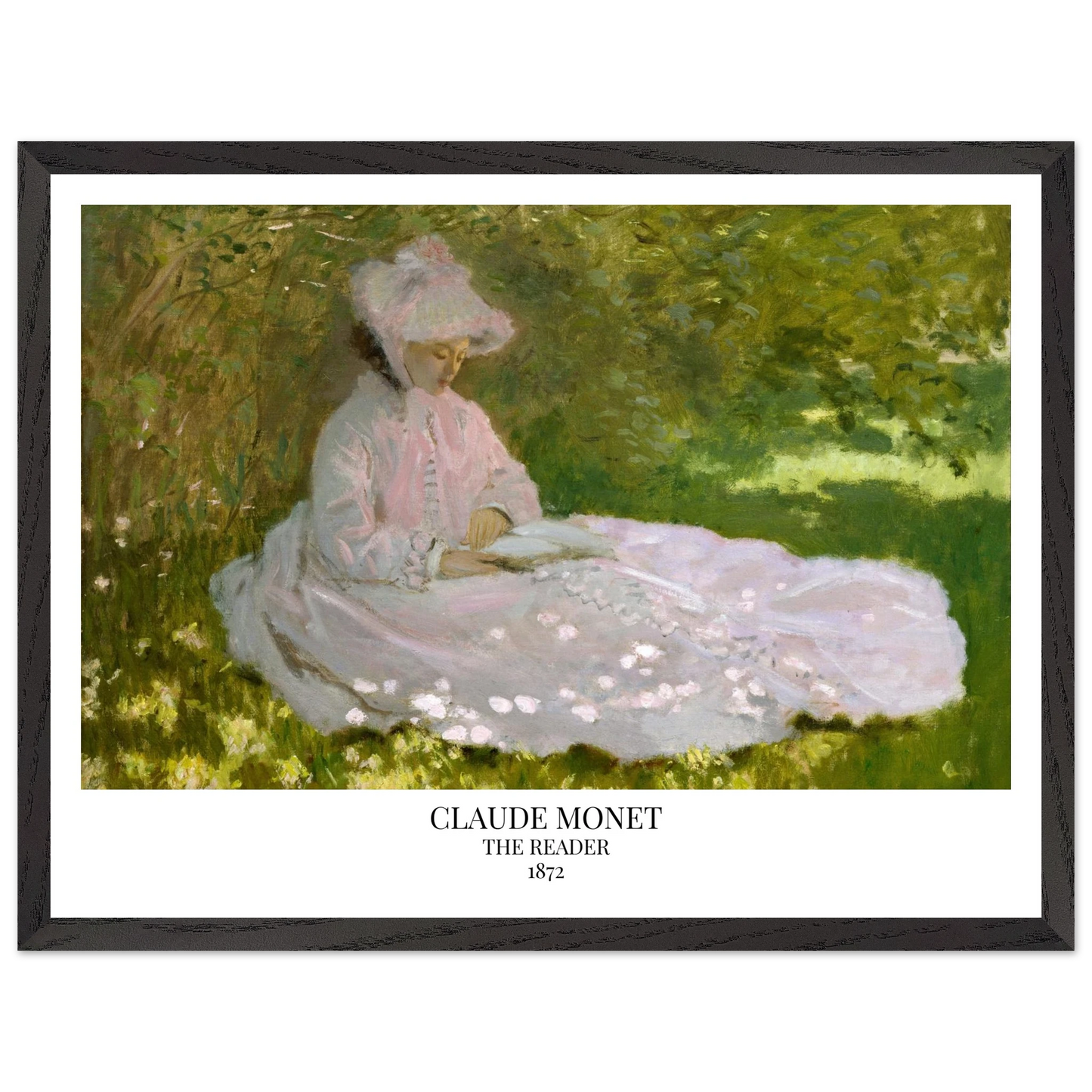 The Reader (1872) von Claude Monet zeigt Camille Monet in einem weißen Kleid, vertieft in ein Buch, umgeben von blühender Gartenvegetation. In zarten Farben und weichem Licht fängt das Gemälde einen stillen Moment der Konzentration und Ruhe ein – ein intimes Porträt des Alltagslebens.