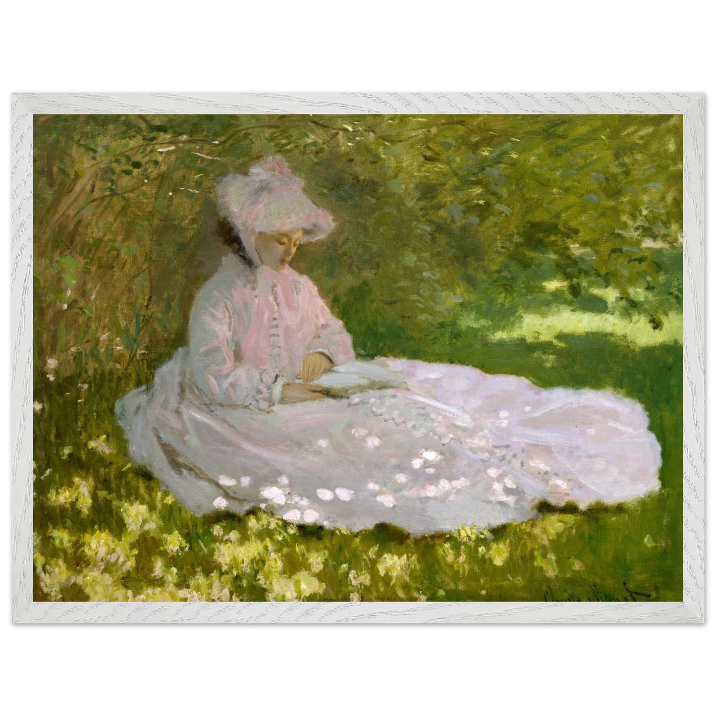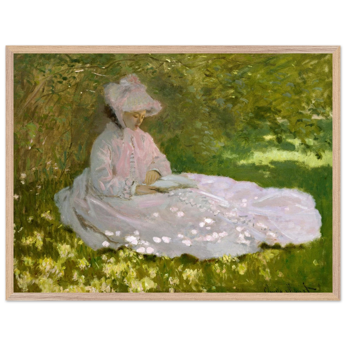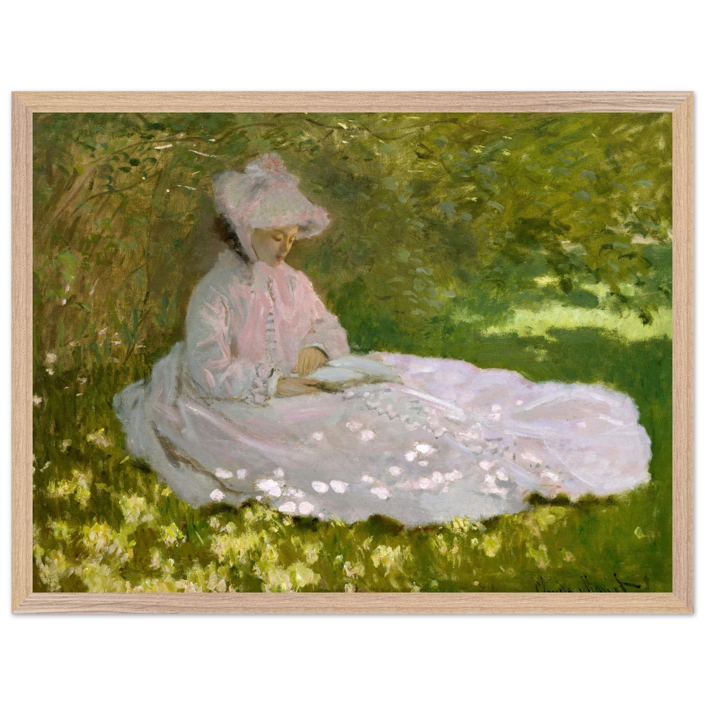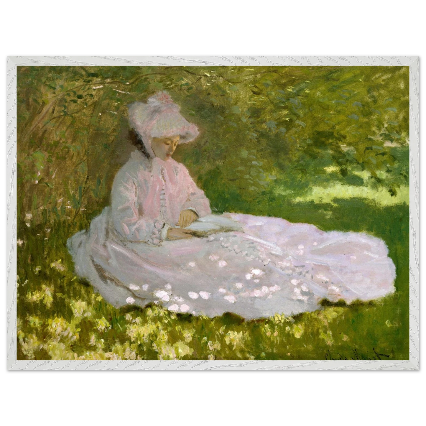 The Reader (1872) von Claude Monet zeigt Camille Monet in einem weißen Kleid, vertieft in ein Buch, umgeben von blühender Gartenvegetation. In zarten Farben und weichem Licht fängt das Gemälde einen stillen Moment der Konzentration und Ruhe ein – ein intimes Porträt des Alltagslebens.