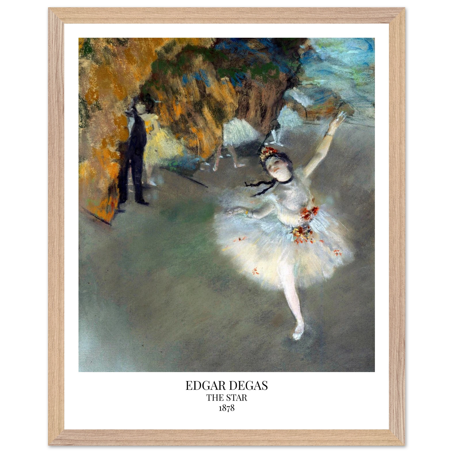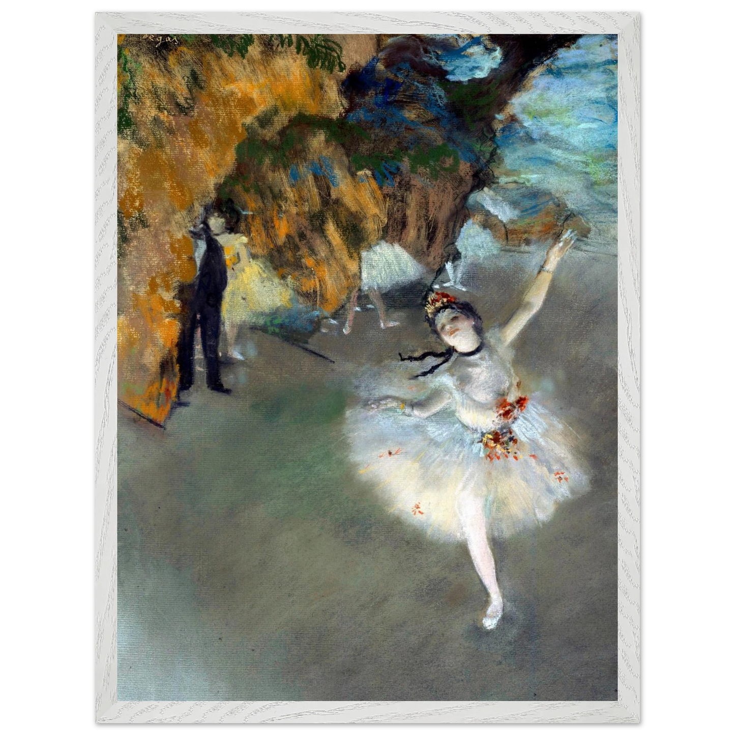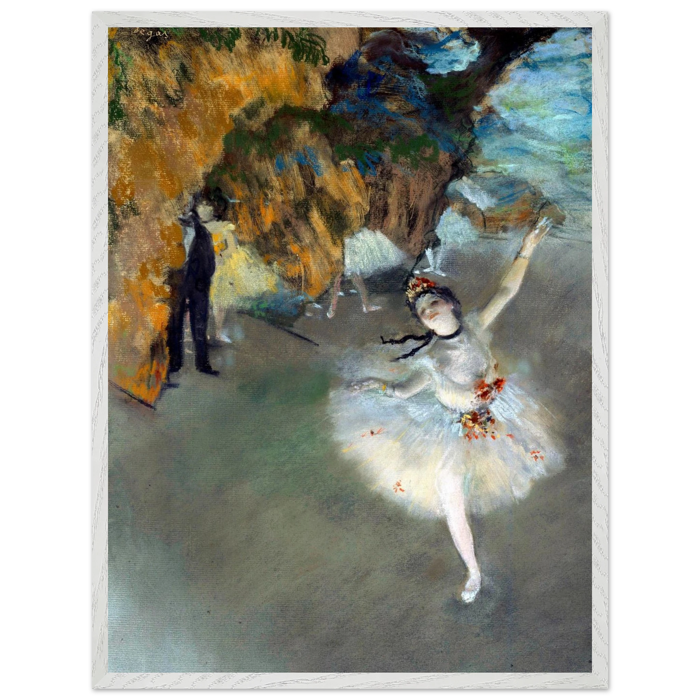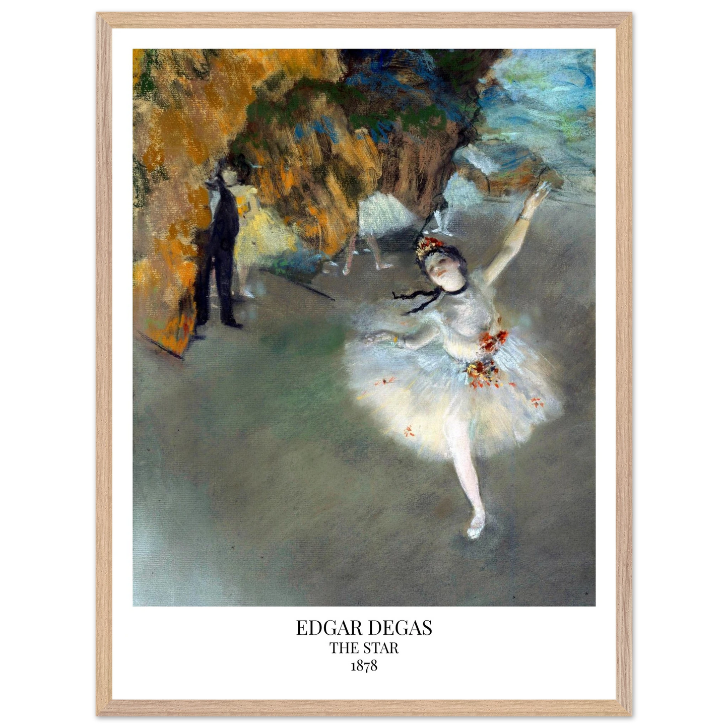 The Star (L'Étoile, ca. 1878) von Edgar Degas zeigt eine Primaballerina inmitten ihres Auftritts auf der Bühne, im vollen Rampenlicht. Mit feinem Gespür für Bewegung, Perspektive und Licht fängt Degas den magischen Moment der Aufführung ebenso ein wie die verborgene Welt hinter den Kulissen.