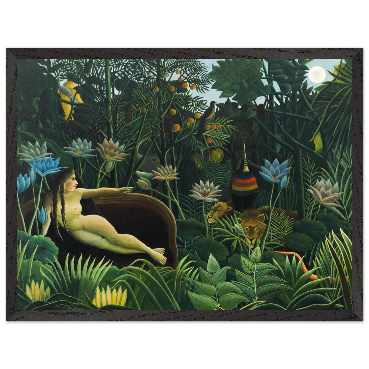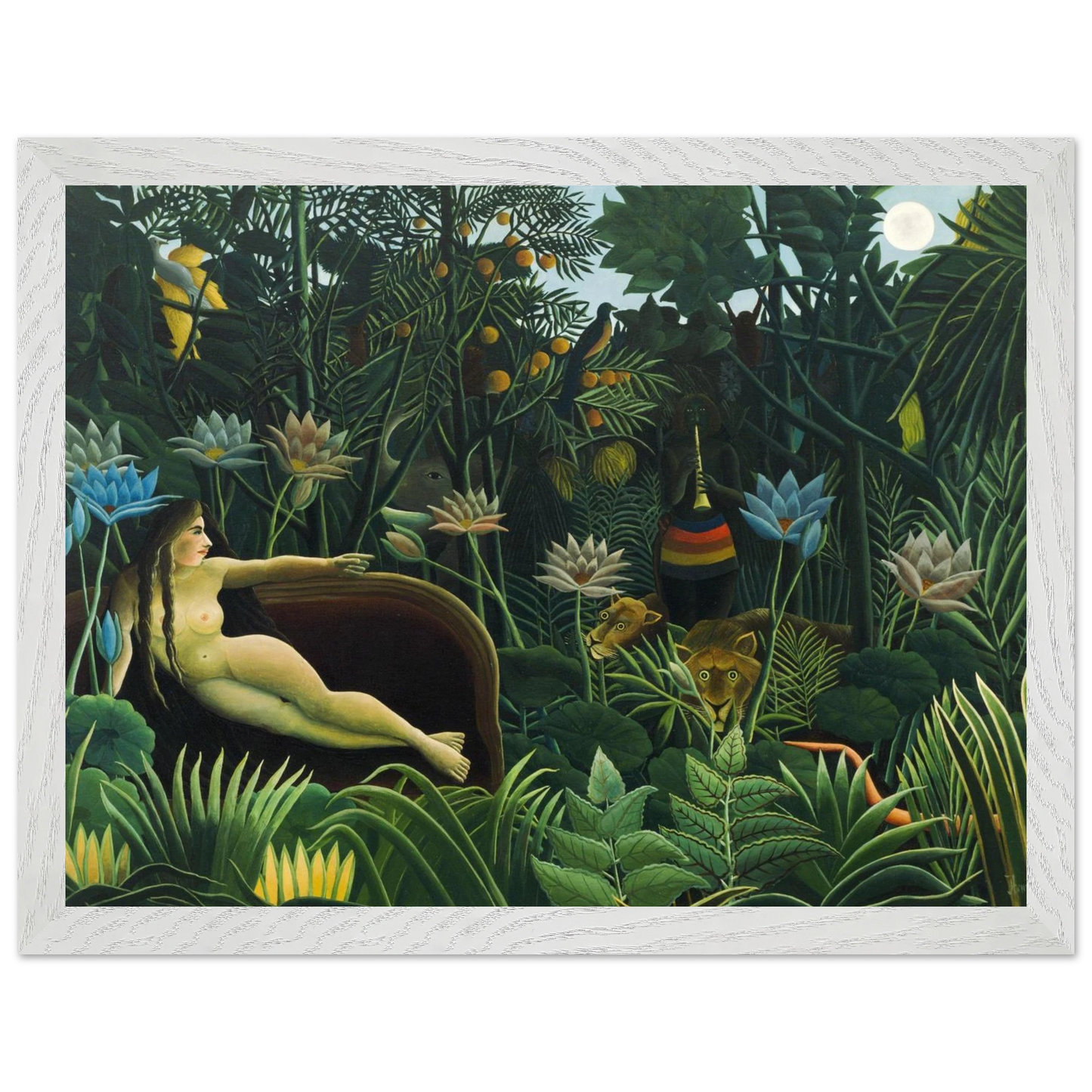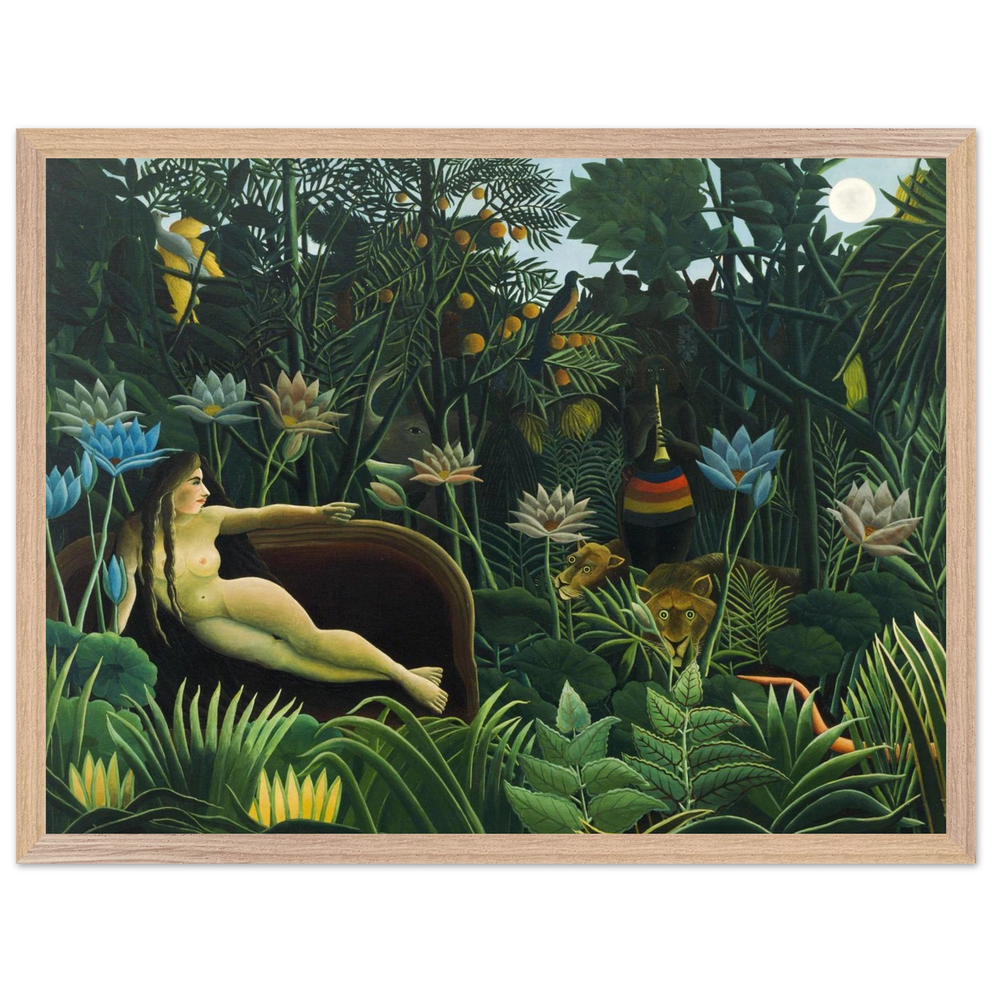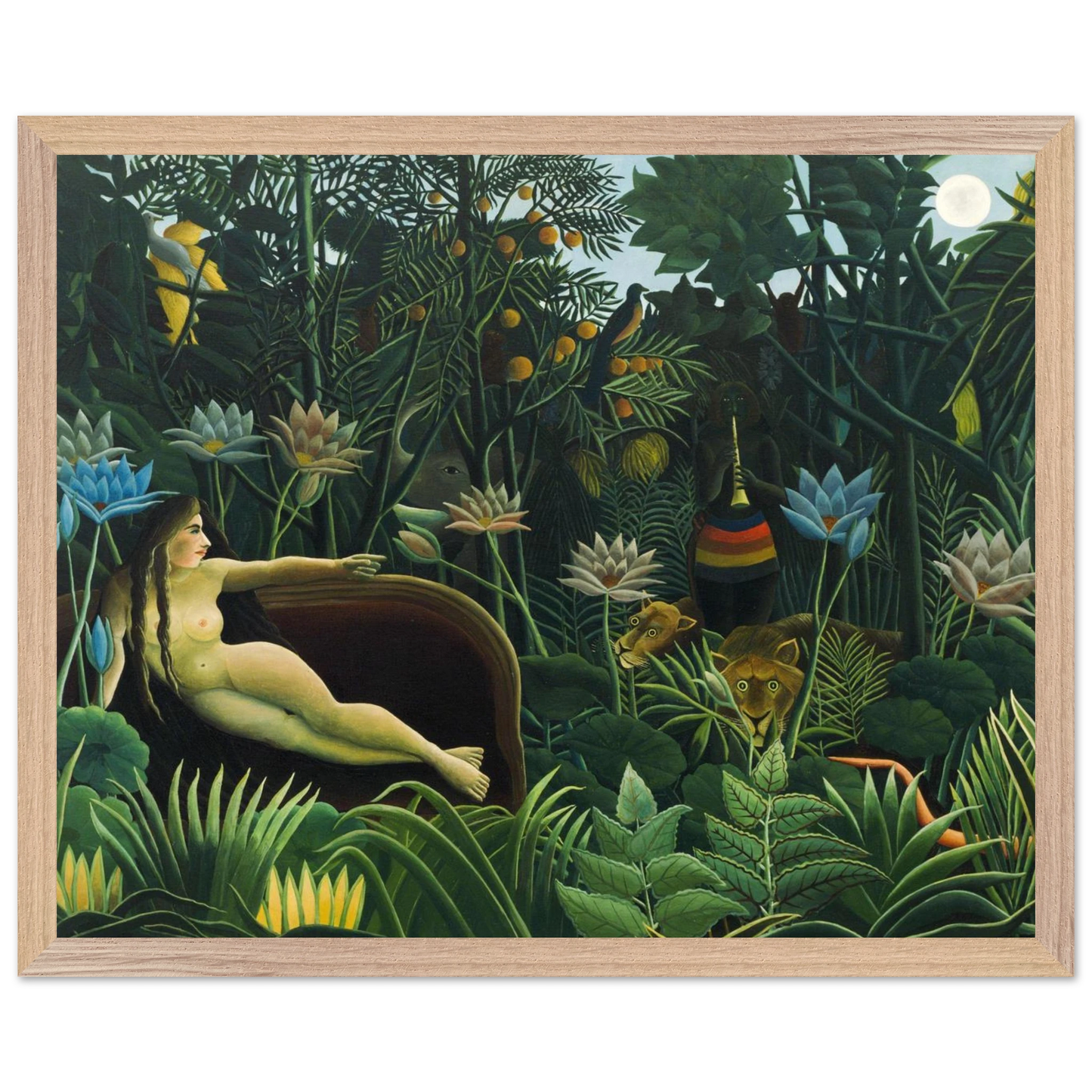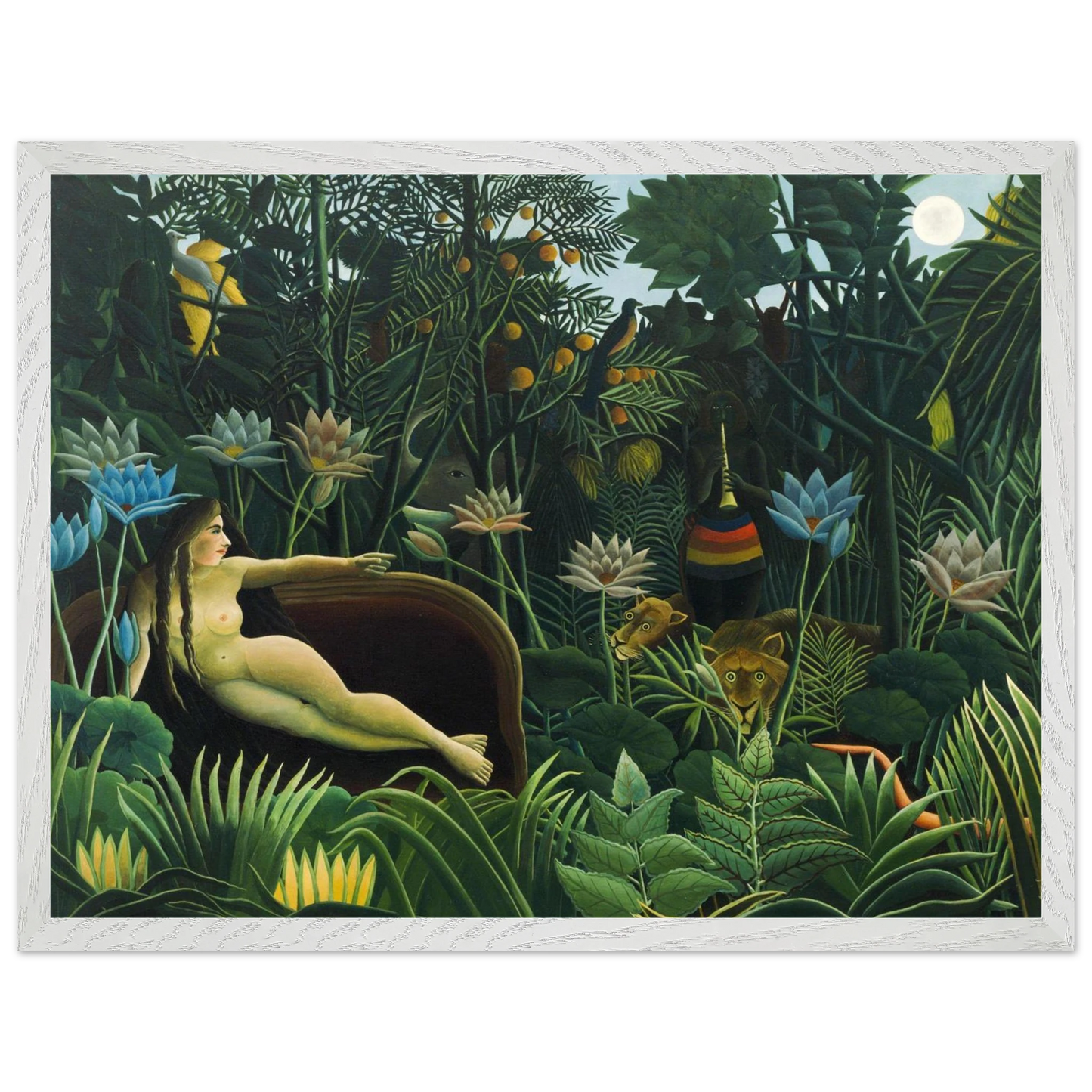 The Dream (1910) von Henri Rousseau zeigt eine verträumte, exotische Szene mit einer liegenden Frau inmitten eines üppigen, fantastischen Dschungels. Das Werk verbindet surreale Atmosphäre mit lebendigen Farben und detailreicher Pflanzenwelt.