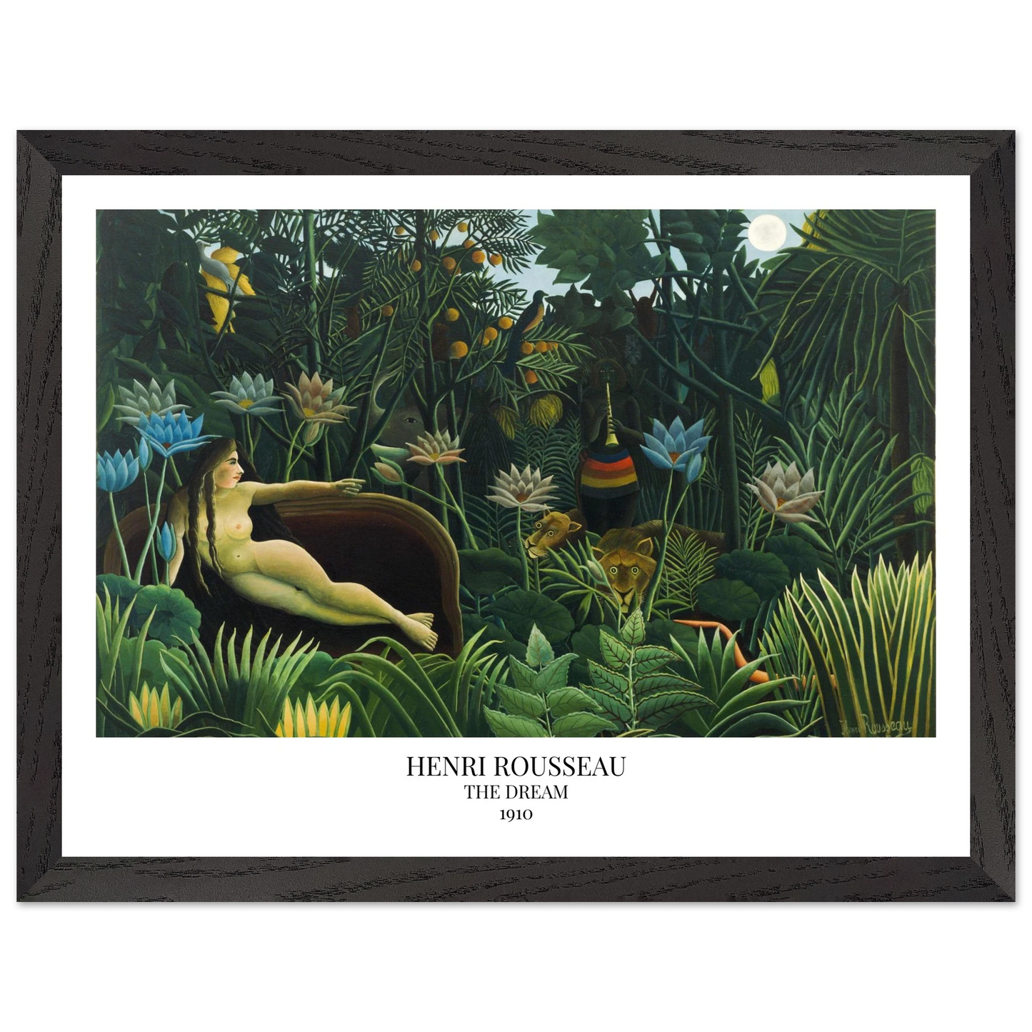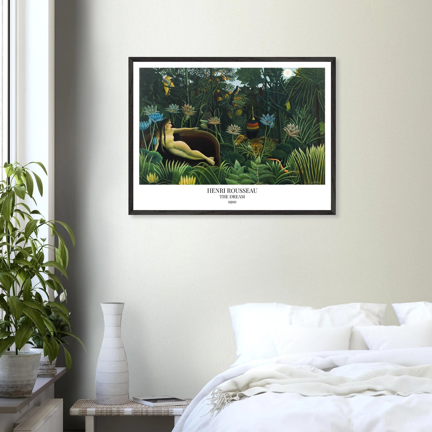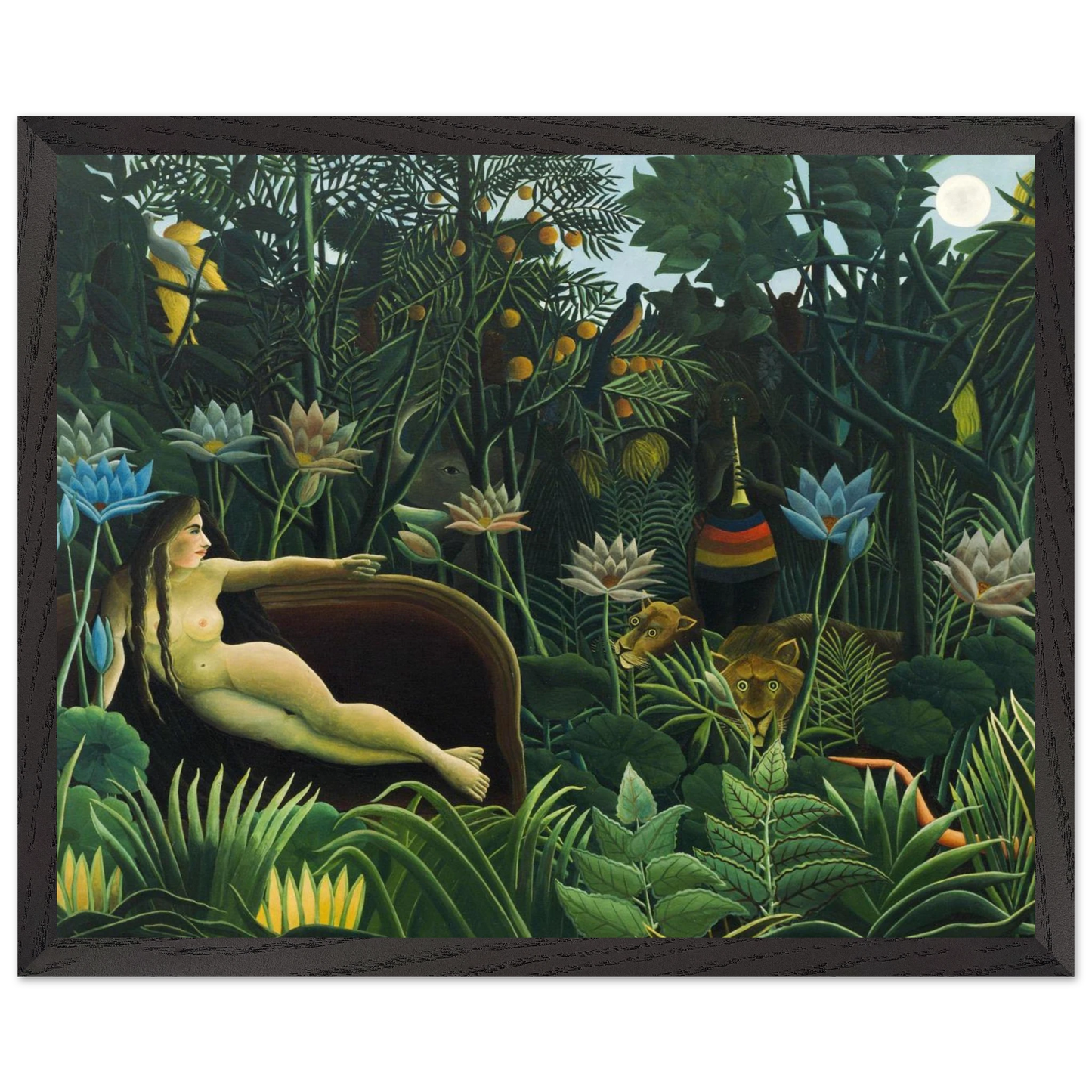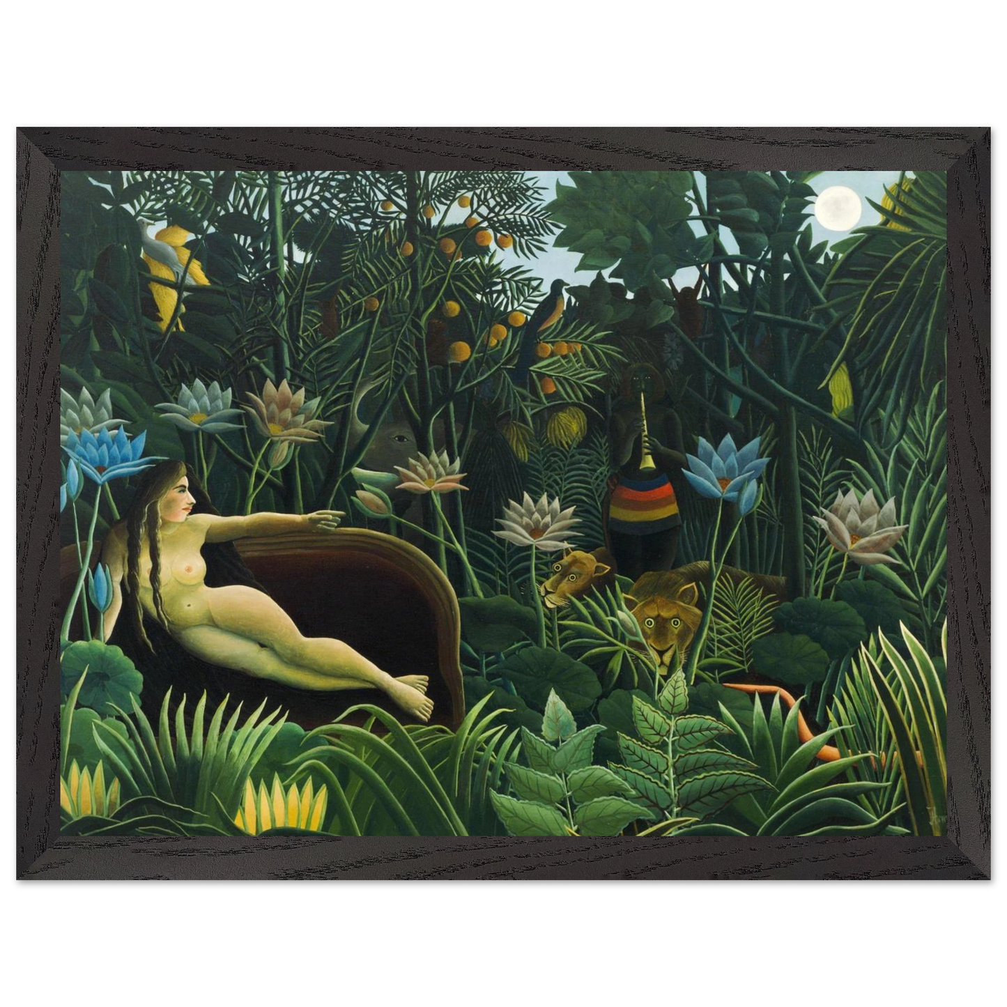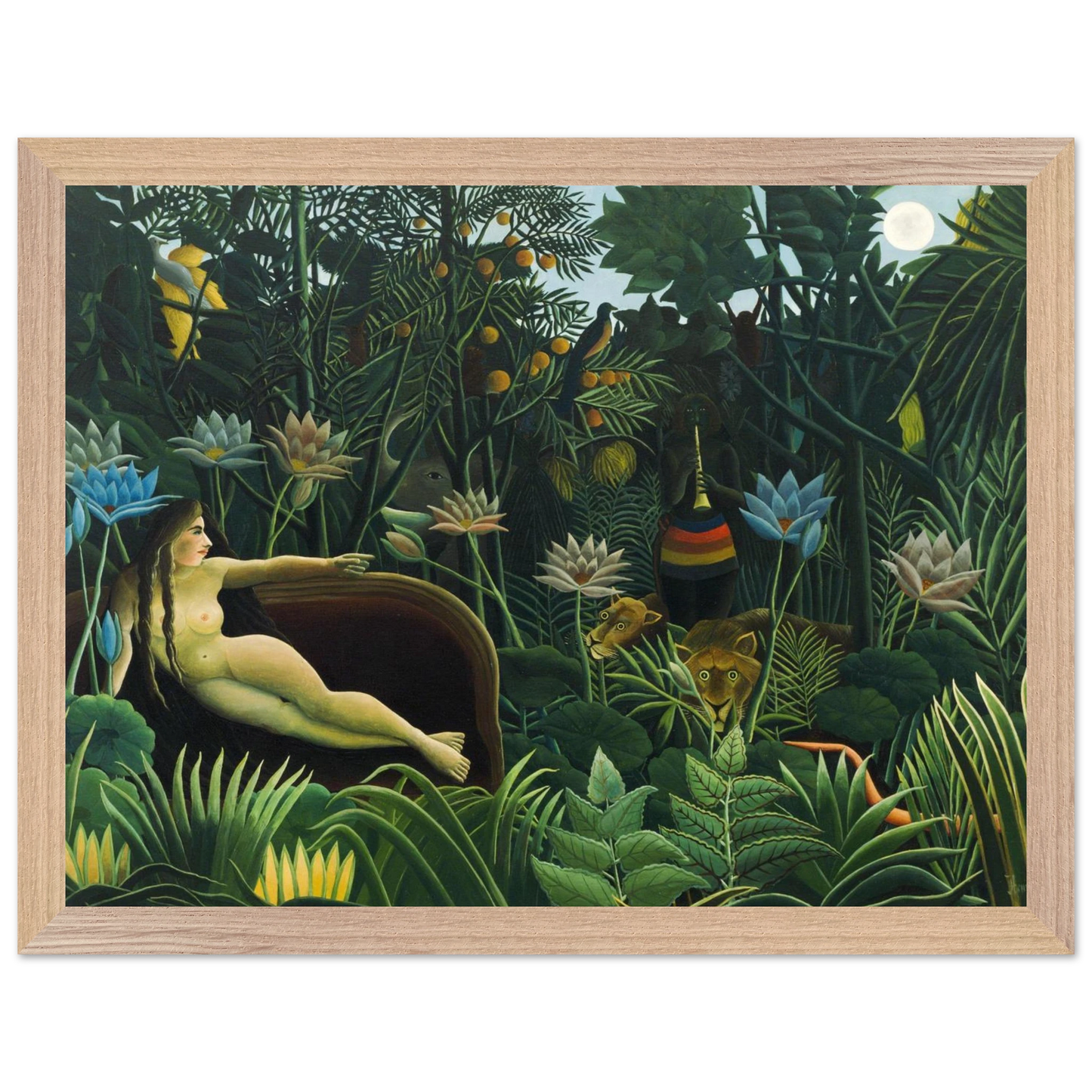 The Dream (1910) von Henri Rousseau zeigt eine verträumte, exotische Szene mit einer liegenden Frau inmitten eines üppigen, fantastischen Dschungels. Das Werk verbindet surreale Atmosphäre mit lebendigen Farben und detailreicher Pflanzenwelt.