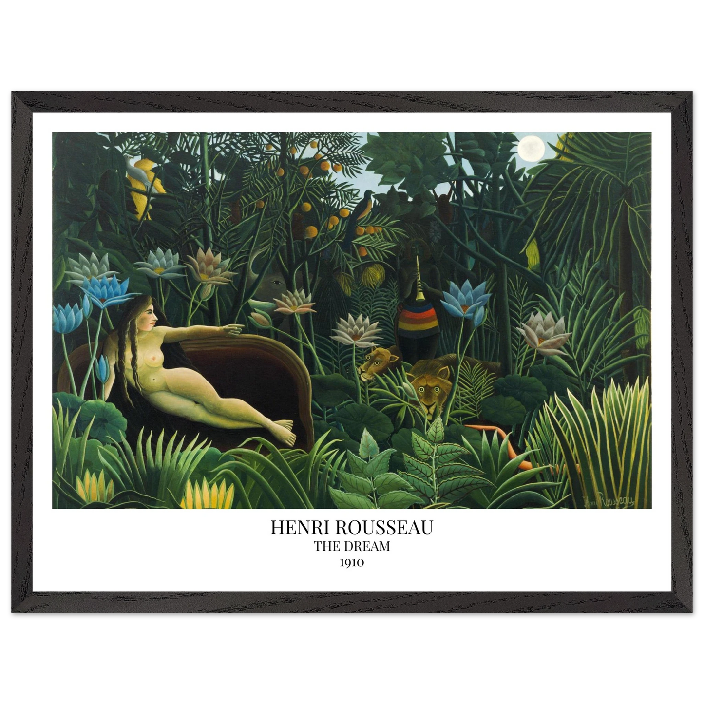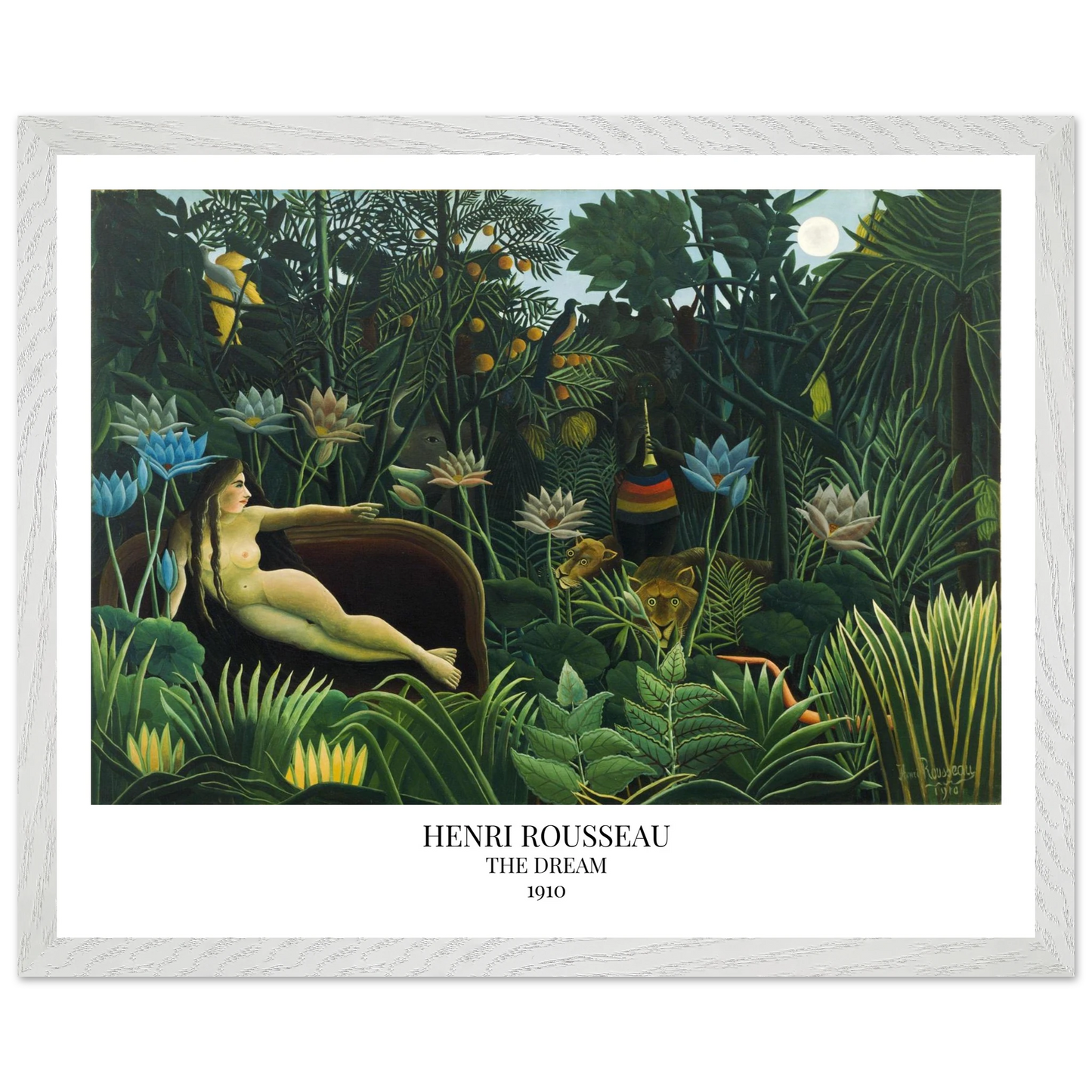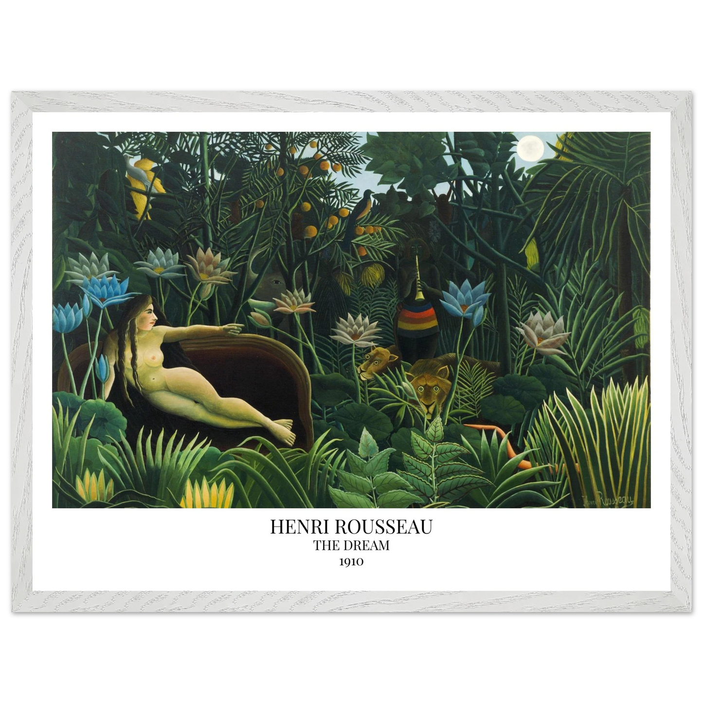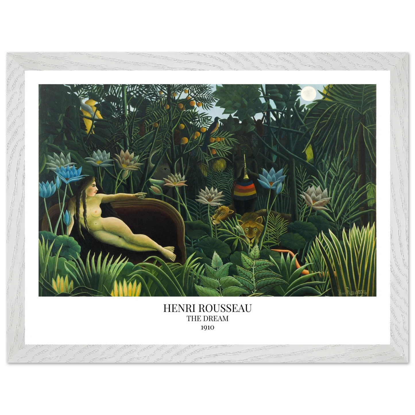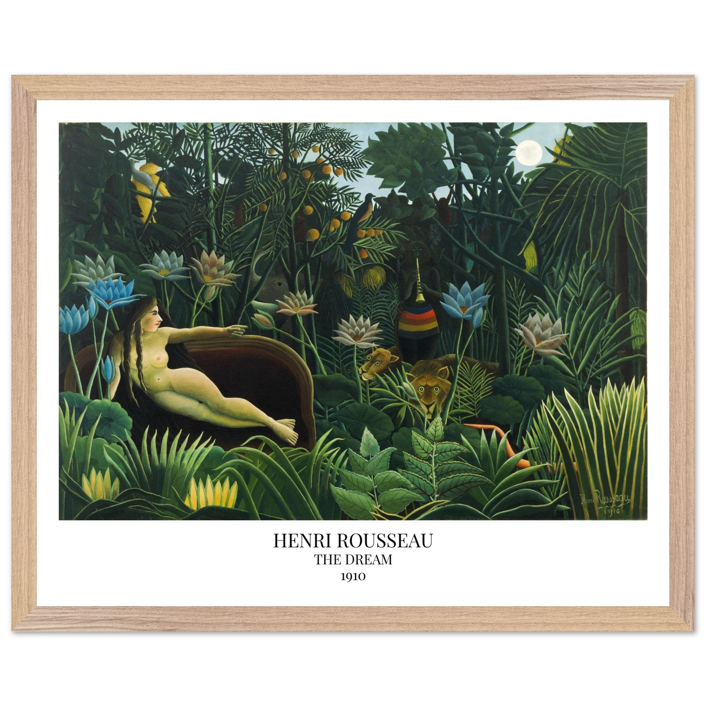 The Dream (1910) von Henri Rousseau zeigt eine verträumte, exotische Szene mit einer liegenden Frau inmitten eines üppigen, fantastischen Dschungels. Das Werk verbindet surreale Atmosphäre mit lebendigen Farben und detailreicher Pflanzenwelt.