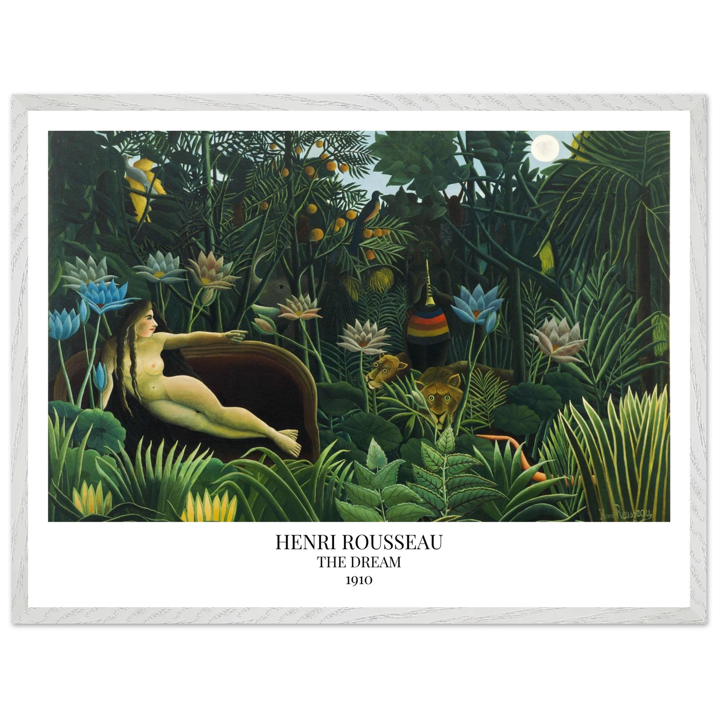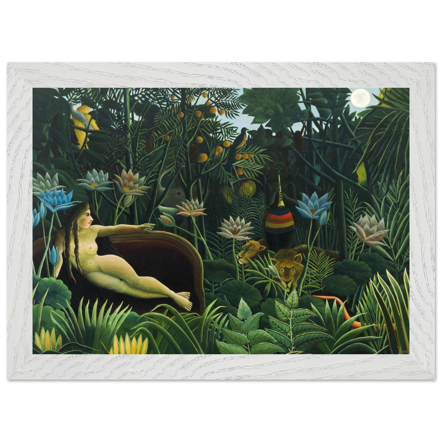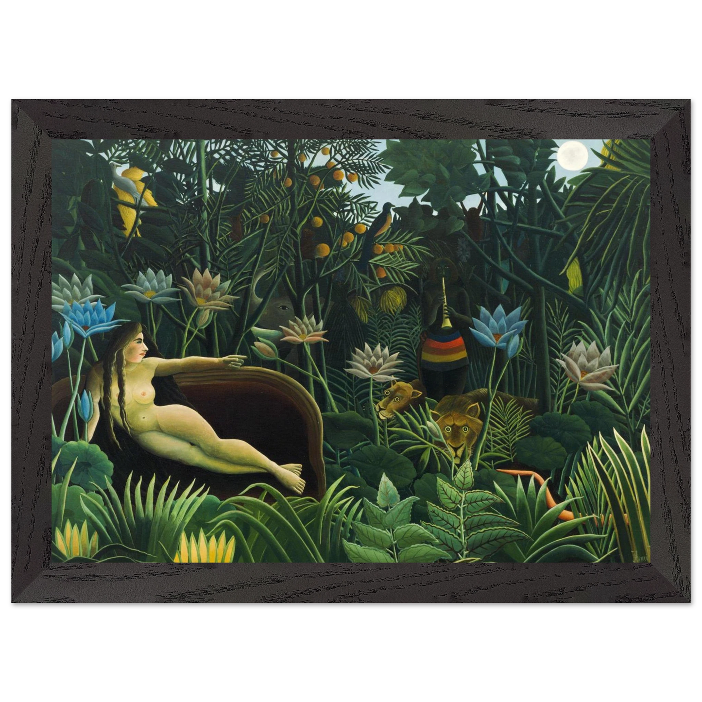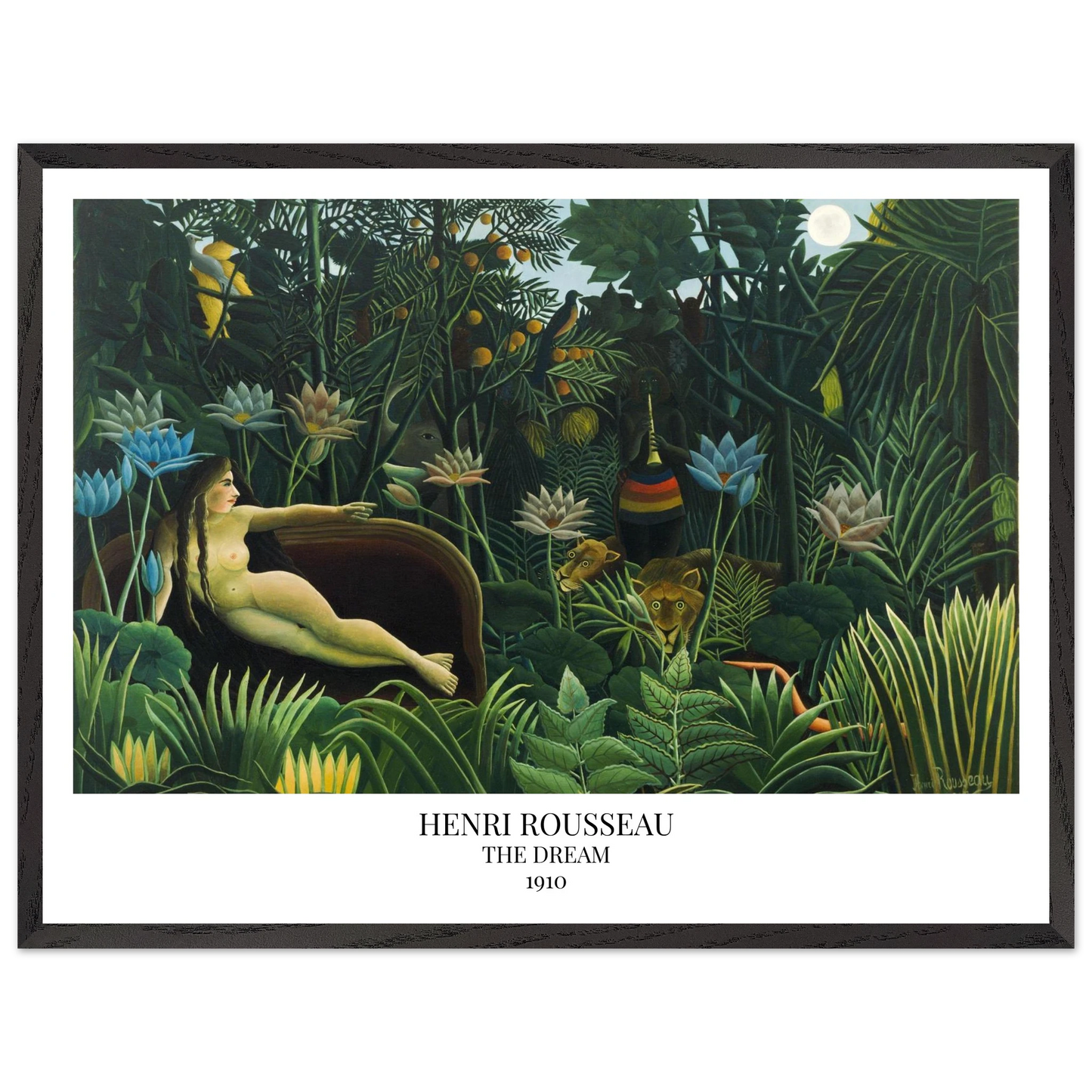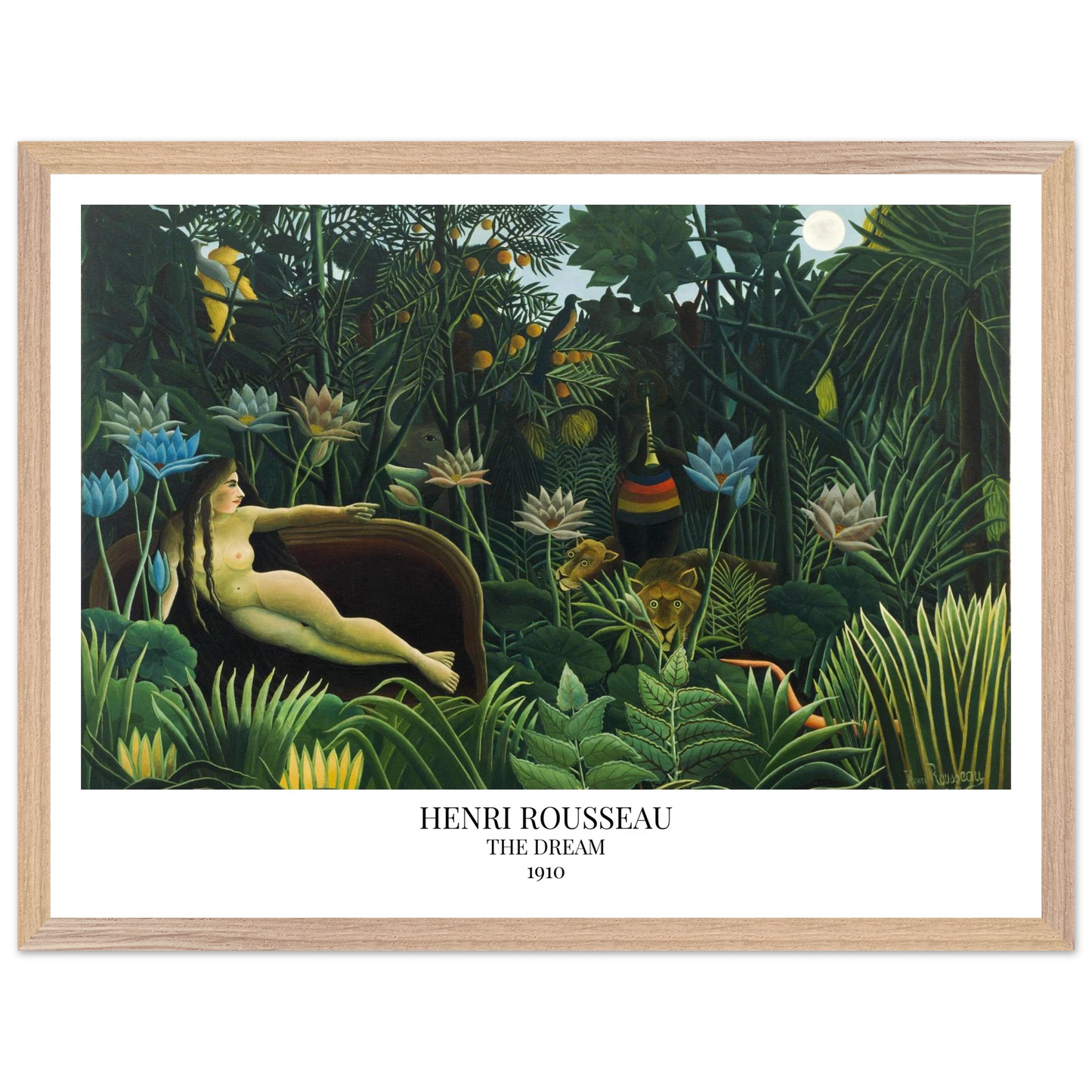 The Dream (1910) von Henri Rousseau zeigt eine verträumte, exotische Szene mit einer liegenden Frau inmitten eines üppigen, fantastischen Dschungels. Das Werk verbindet surreale Atmosphäre mit lebendigen Farben und detailreicher Pflanzenwelt.