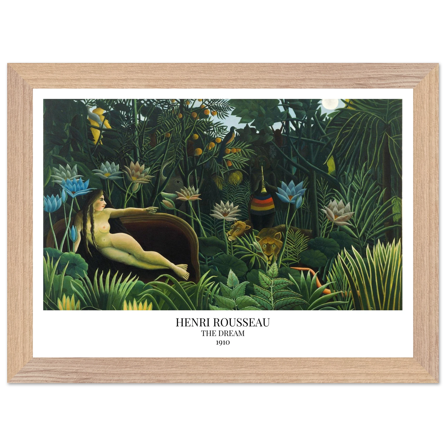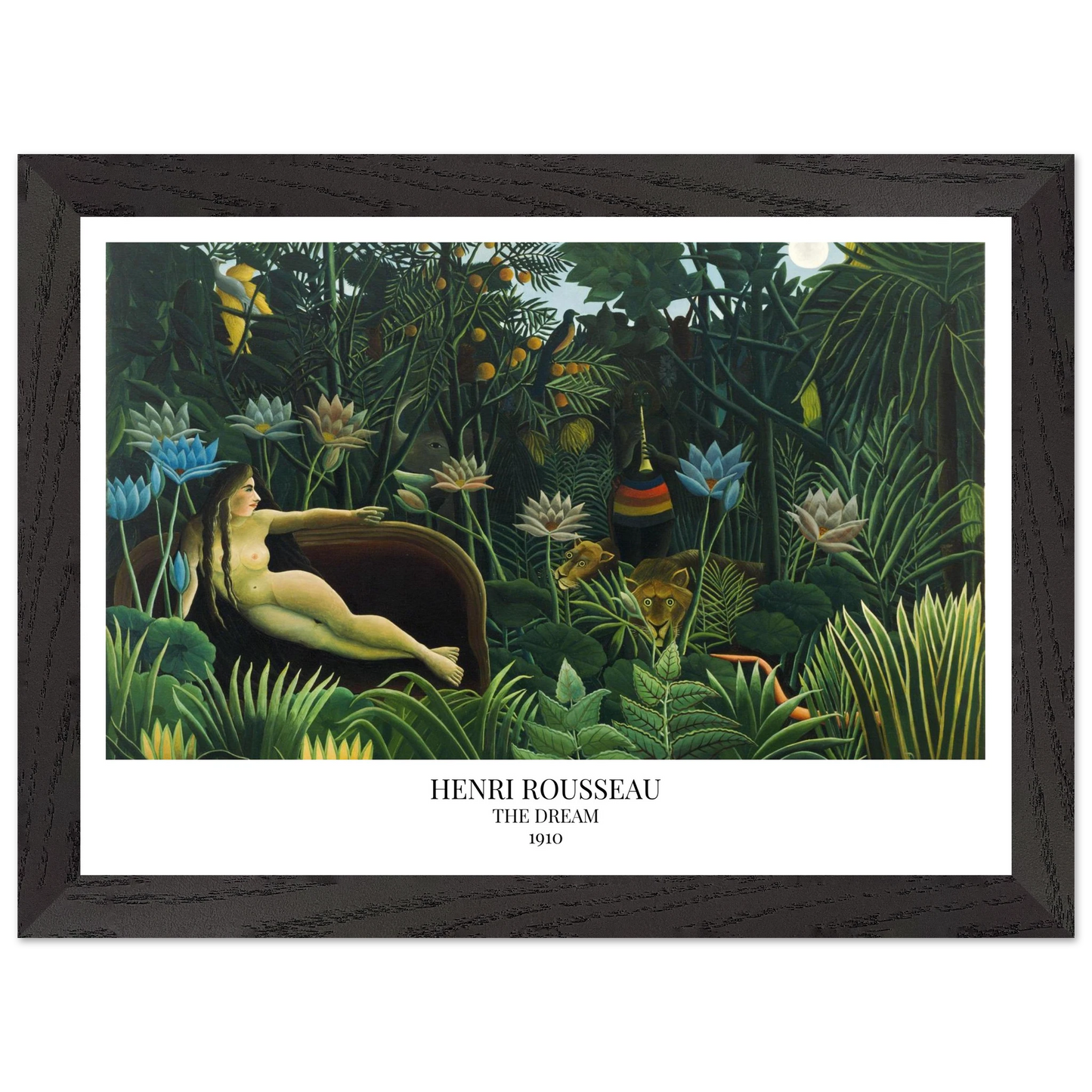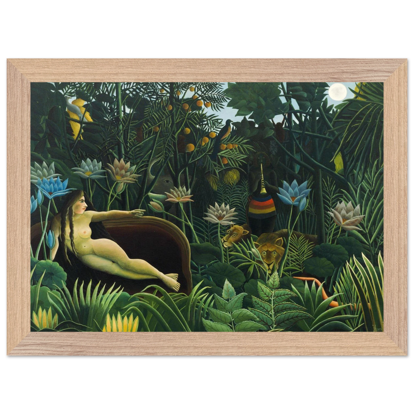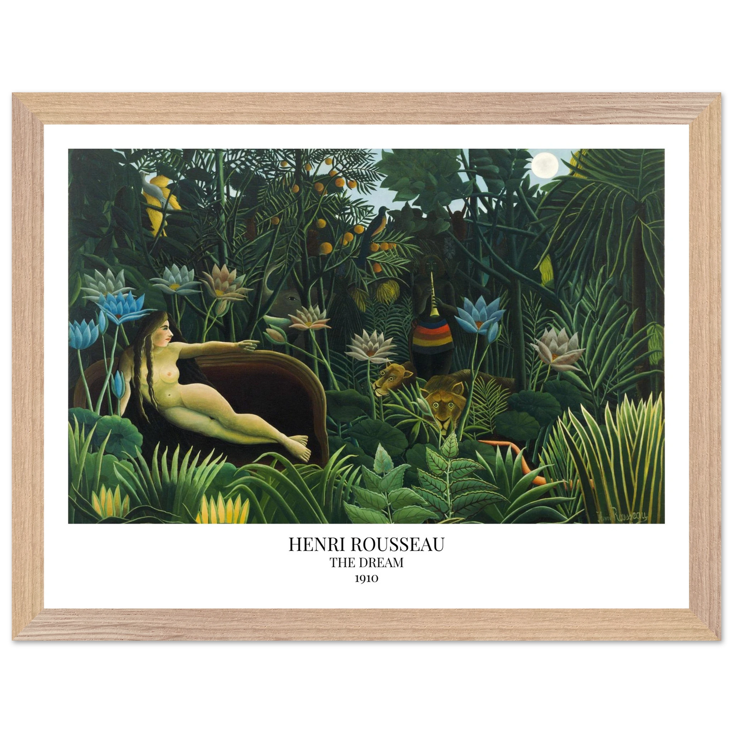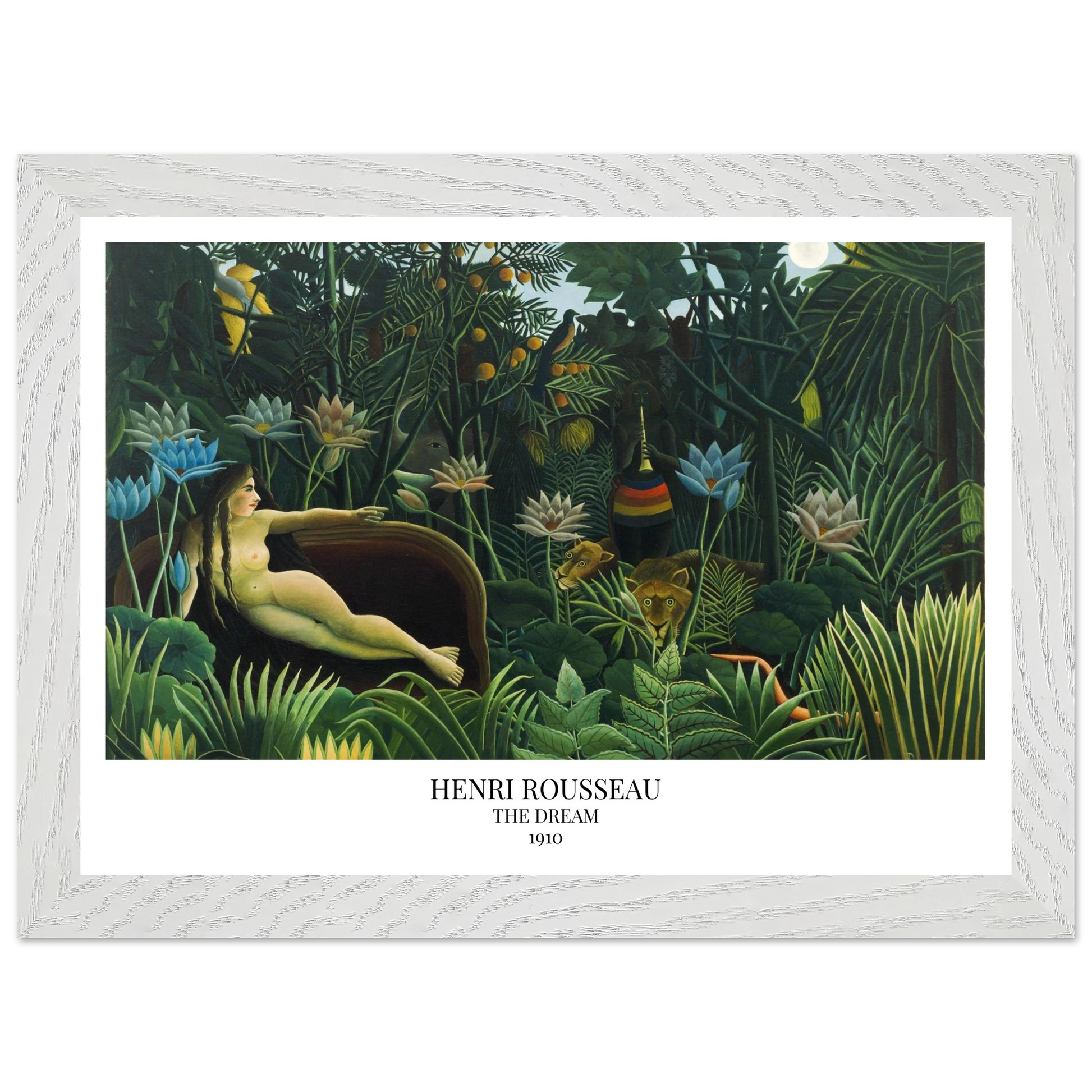 The Dream (1910) von Henri Rousseau zeigt eine verträumte, exotische Szene mit einer liegenden Frau inmitten eines üppigen, fantastischen Dschungels. Das Werk verbindet surreale Atmosphäre mit lebendigen Farben und detailreicher Pflanzenwelt.