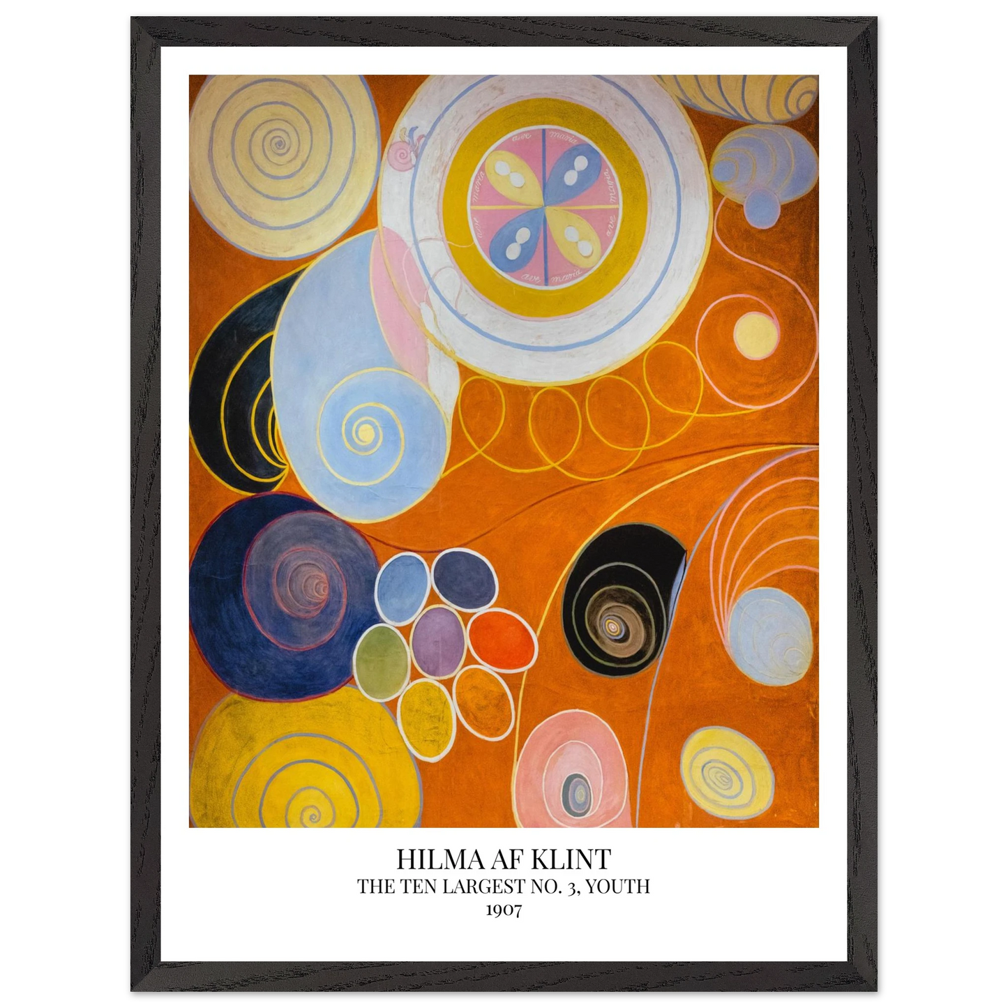 The Ten Largest No. 3, Youth (1907) ist das dritte Gemälde aus der monumentalen Serie The Ten Largest von Hilma af Klint. Es steht für die Lebensphase der Jugend – voller Energie, Bewegung und emotionaler Entfaltung. Dynamische Linien, kräftige Farben und spiralartige Formen symbolisieren das Erwachen des Selbst und die Suche nach Identität. Af Klint verbindet abstrakte Komposition mit spiritueller Tiefe und erschafft so ein Werk von zeitloser Ausdruckskraft.