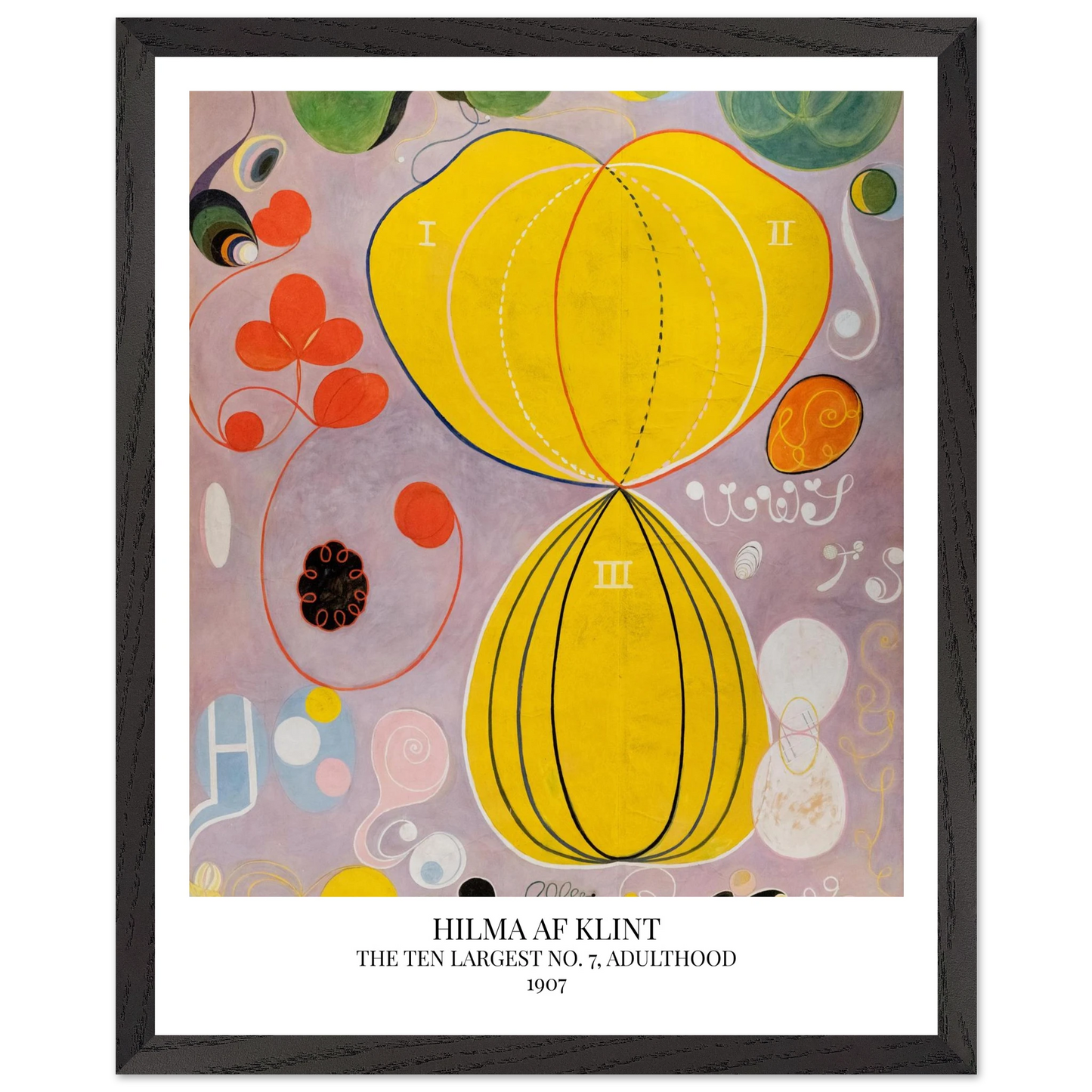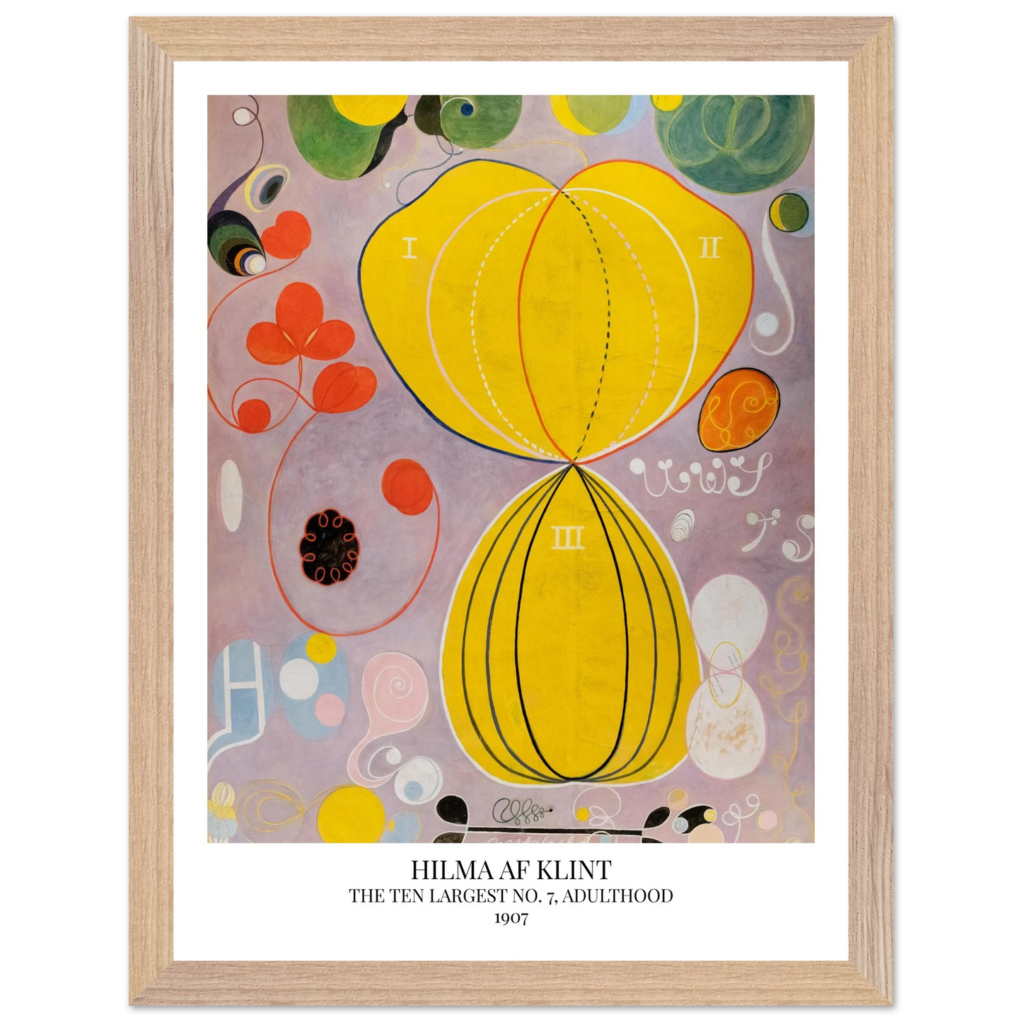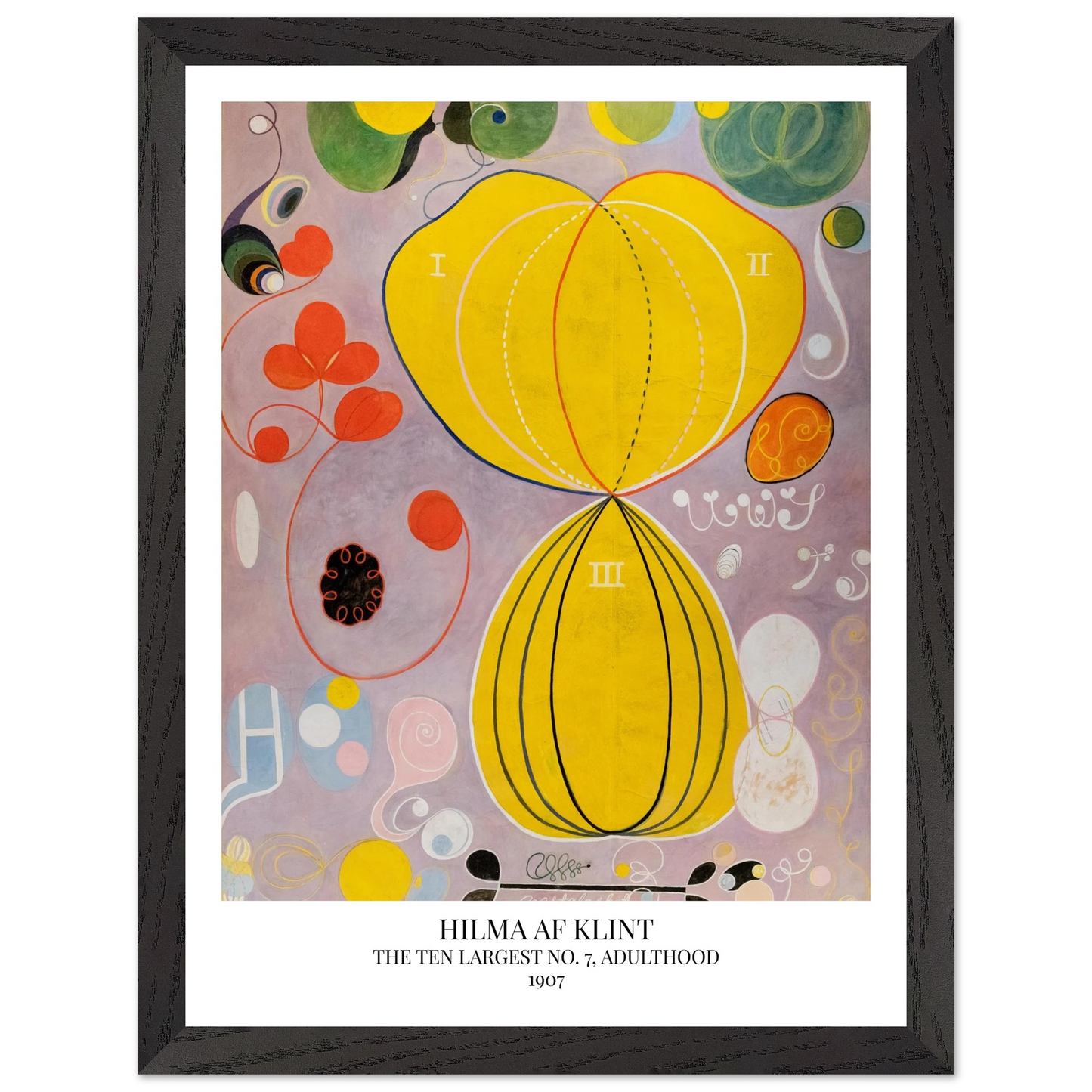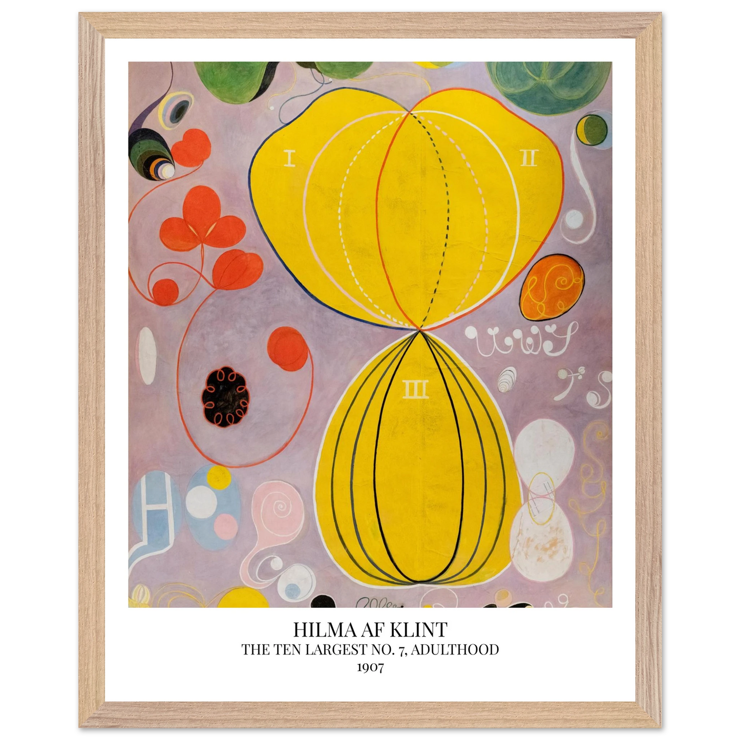 The Ten Largest No. 7, Adulthood (1907) ist das dritte von vier Gemälden in der Erwachsenen-Phase innerhalb von Hilma af Klints Serie The Ten Largest. Es vereint kräftige Farben, florale Ornamente und dynamische Linien, die auf ein reifes, zugleich aktives und schöpferisches Lebensstadium verweisen. Die Komposition wirkt lebendig und komplex – ein Ausdruck von Gleichgewicht zwischen innerem Wachstum und äußerer Gestaltungskraft.