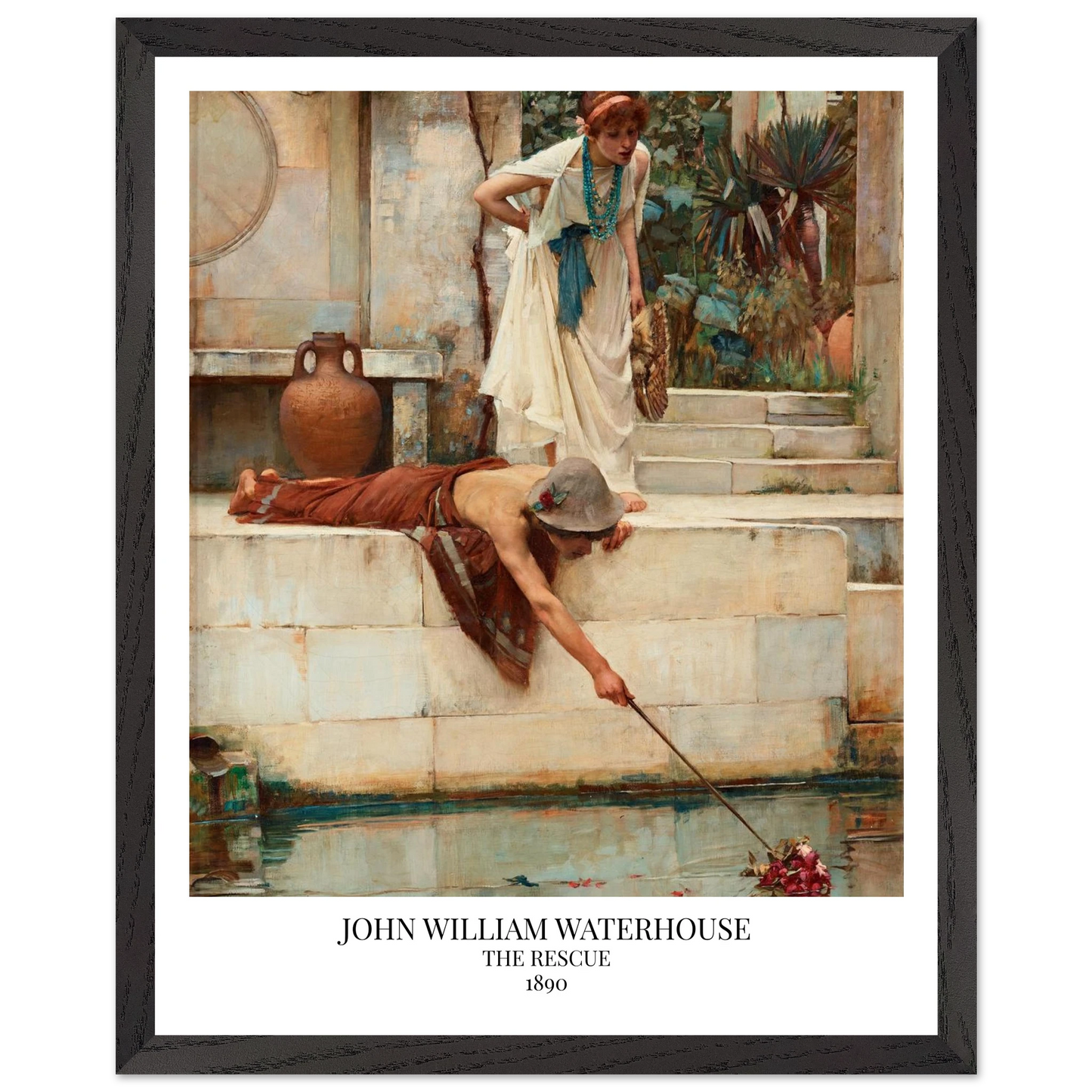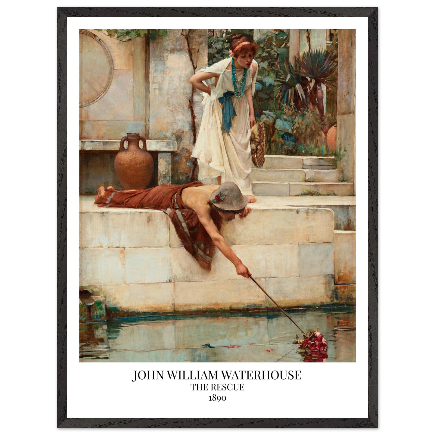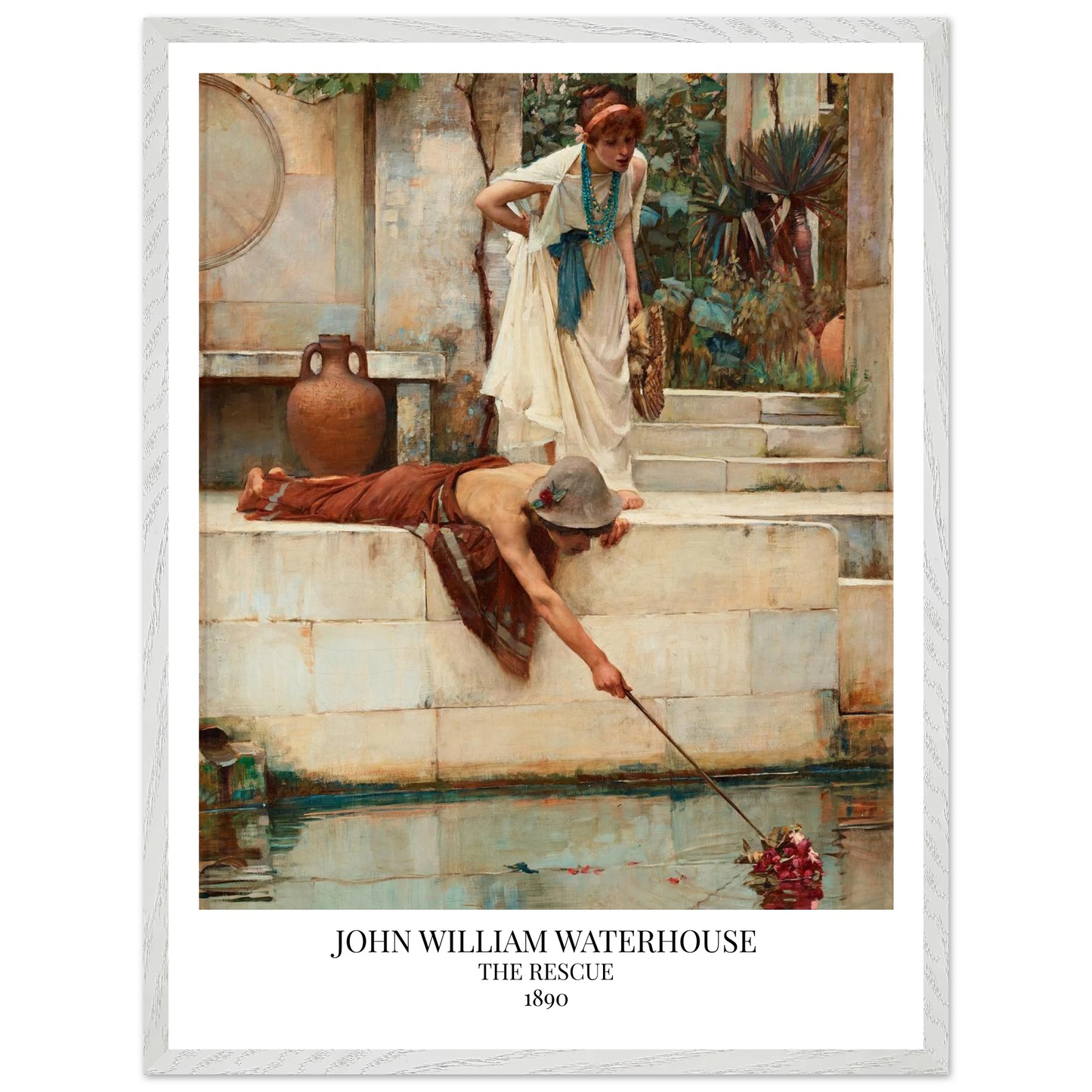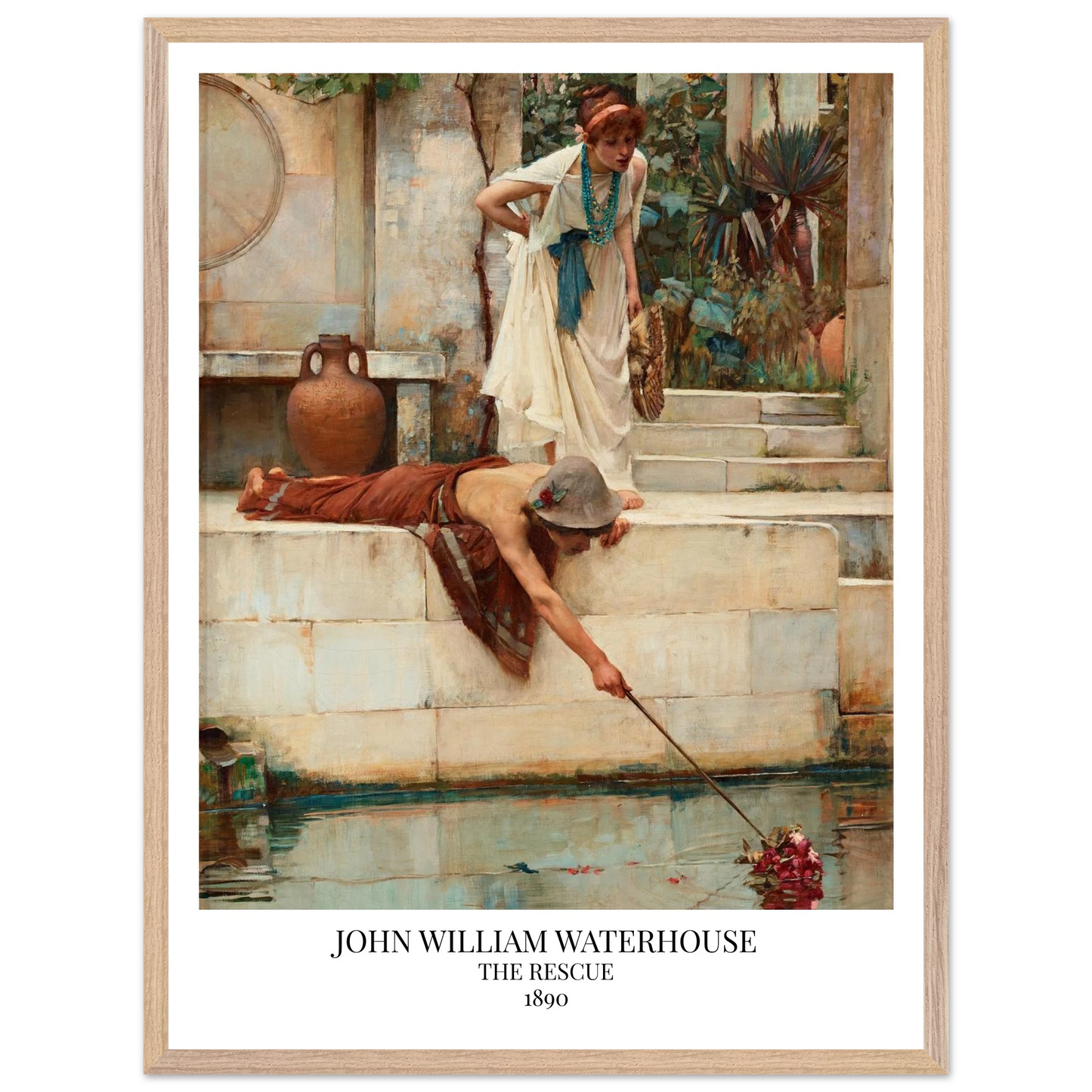 The Rescue (1890) von John William Waterhouse zeigt eine dramatische Szene voller Gefühl und Bewegung. Ein junger Mann rettet eine Frau aus stürmischer See – ein Motiv, das Heldentum, Romantik und mythologische Anklänge miteinander verbindet. Die fließenden Stoffe, die dynamische Komposition und das Spiel von Licht und Wasser sind typisch für Waterhouses Stil. Das Gemälde vereint klassische Erzählkunst mit präraffaelitischer Detailverliebtheit und emotionaler Tiefe.
