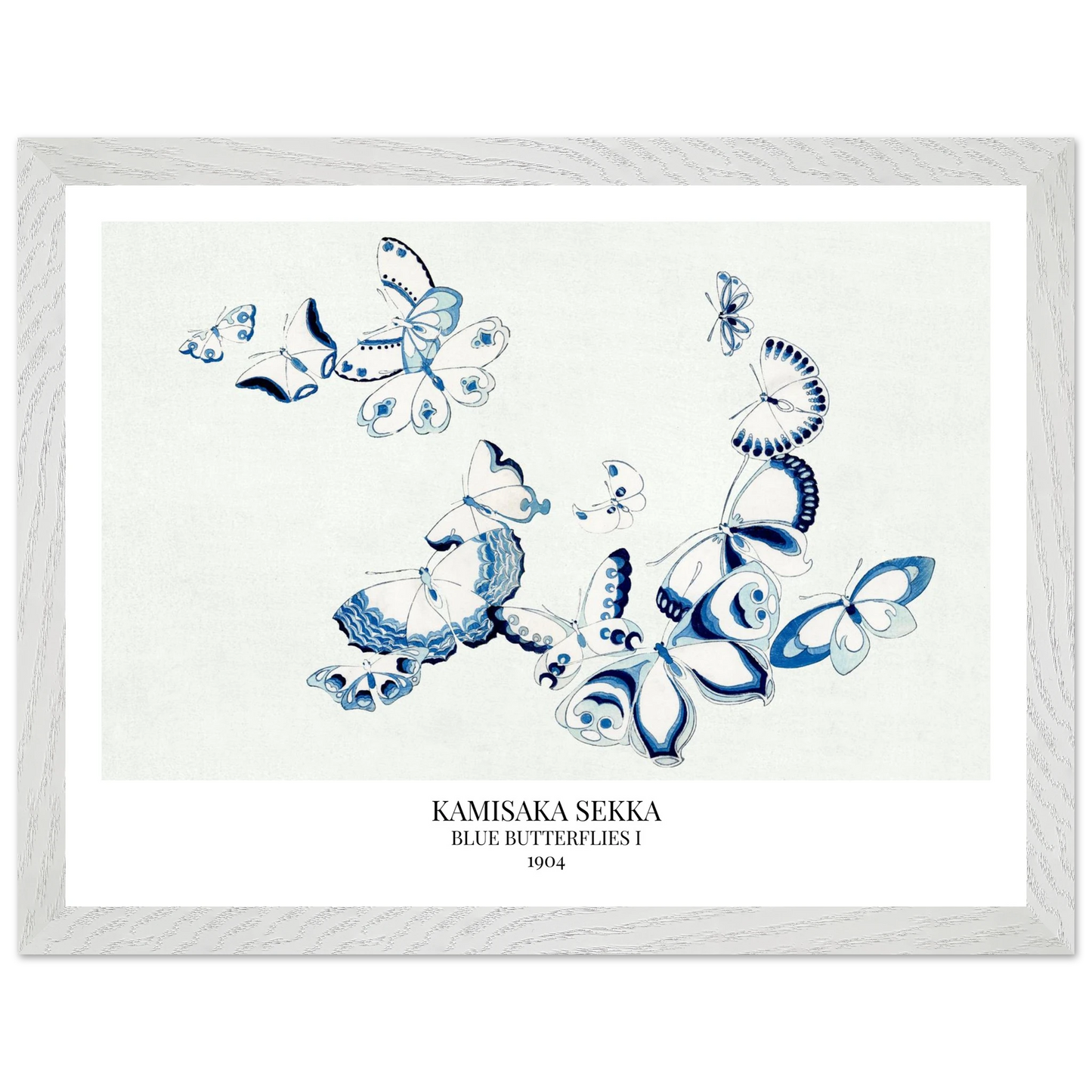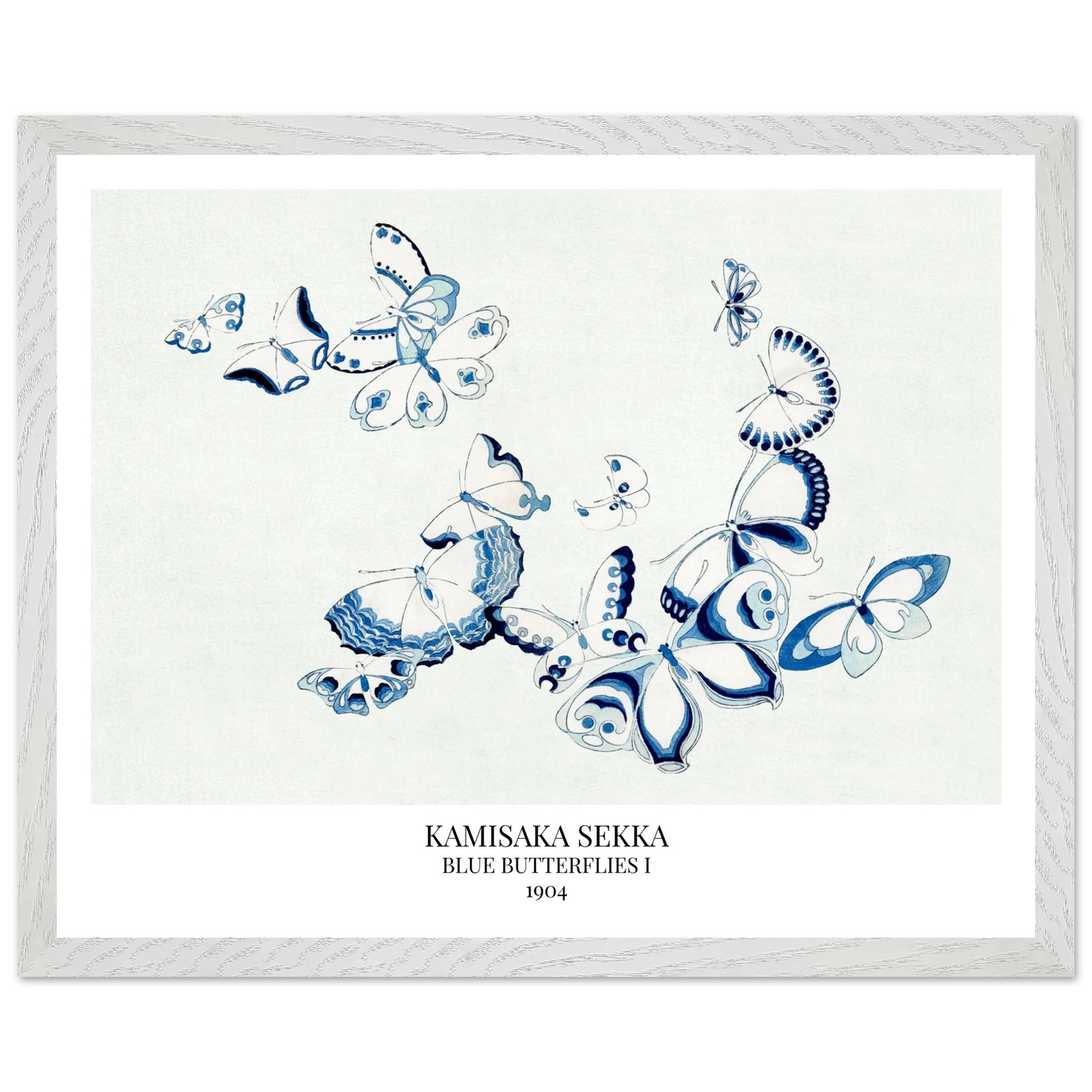 Blue Butterflies I (1904) aus Kamisaka Sekkas Serie 'Chō Senshū' - im Deutschen 'Tausend Schmetterlinge', zeigt eine Gruppe stilisierter, blauer Schmetterlinge in klarer, flächiger Komposition. Die reduzierte Formensprache und dekorative Anordnung verbinden traditionelle japanische Ästhetik mit modernem Design – ein zartes, grafisch wirkendes Naturmotiv mit großer Eleganz.