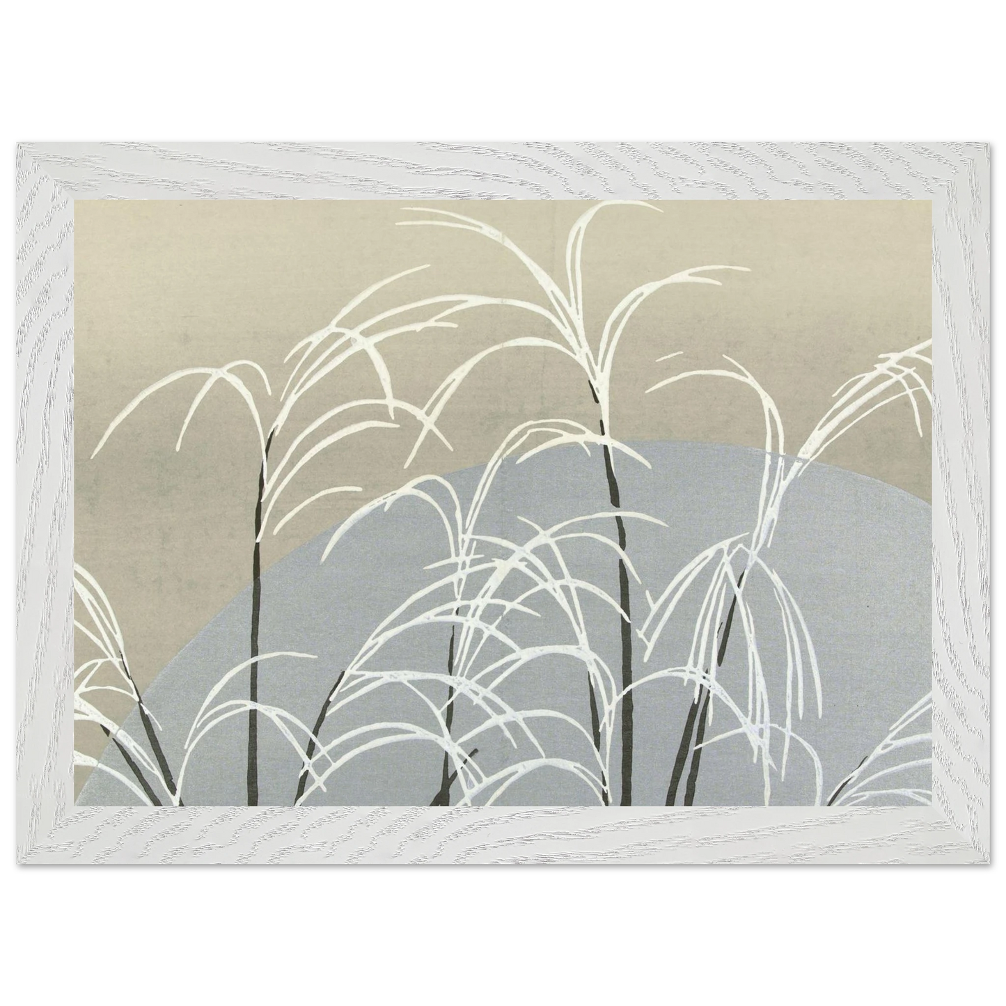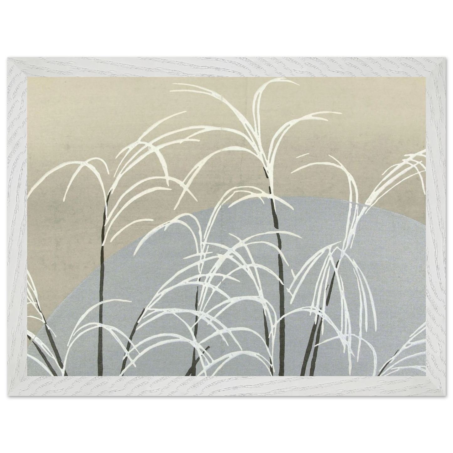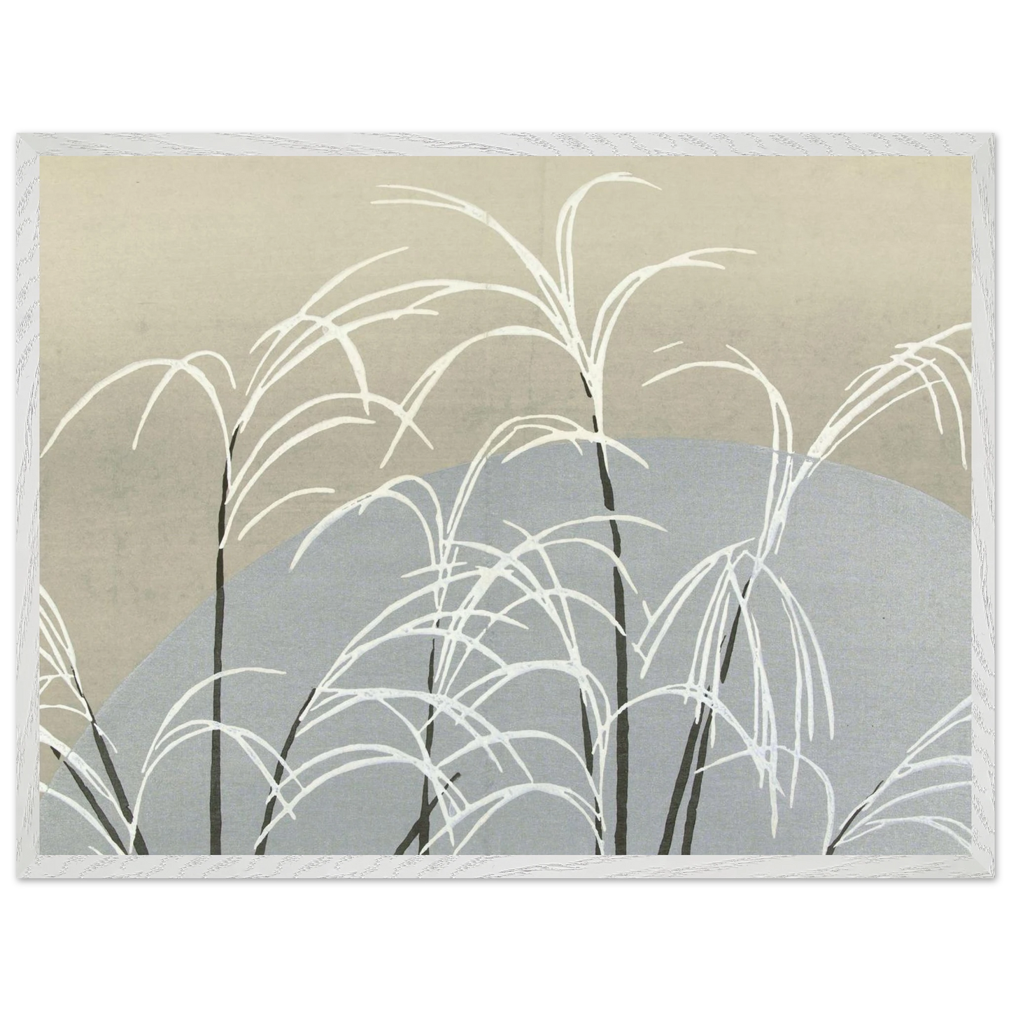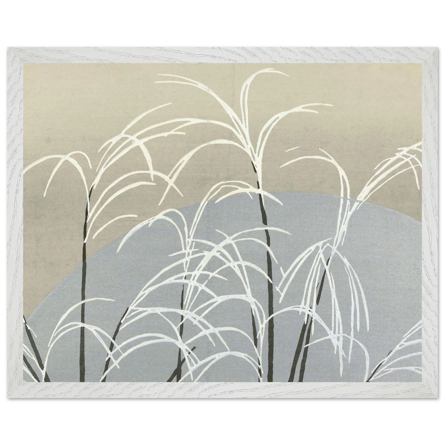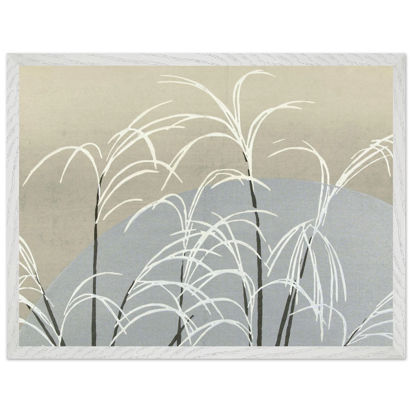 Moon and Grasses (1910) von Kamisaka Sekka ist ein stimmungsvoller Farbholzschnitt aus der Serie 'Momoyogusa' - im Deutschen 'Blumen aus hundert Welten'. Das Werk zeigt silberne Gräser unter einem leuchtenden Mond in minimalistischer Komposition – eine poetische Verbindung aus Naturbeobachtung, Stille und traditioneller japanischer Ästhetik.