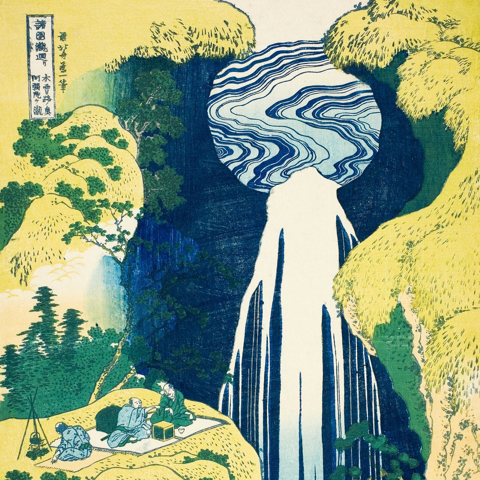Amida Falls in the Far Reaches of the Kisokaidō Road (1832) von Katsushika Hokusai ist ein eindrucksvoller Farbholzschnitt aus der Serie 'Shokoku Taki Meguri' - im Deutschen 'Eine Reise zu den Wasserfällen der Provinzen'. Das Werk zeigt den Amida-Wasserfall in einer abgelegenen Region der alten Handelsstraße Kisokaidō, dessen Fall in bogenförmigem Schwung an die Silhouette der buddhistischen Amida-Figur erinnert. Mit fließenden Linien, kraftvoller Naturdarstellung und kleinen Menschenfiguren im Vordergrund betont Hokusai die spirituelle Größe und Erhabenheit der Landschaft.