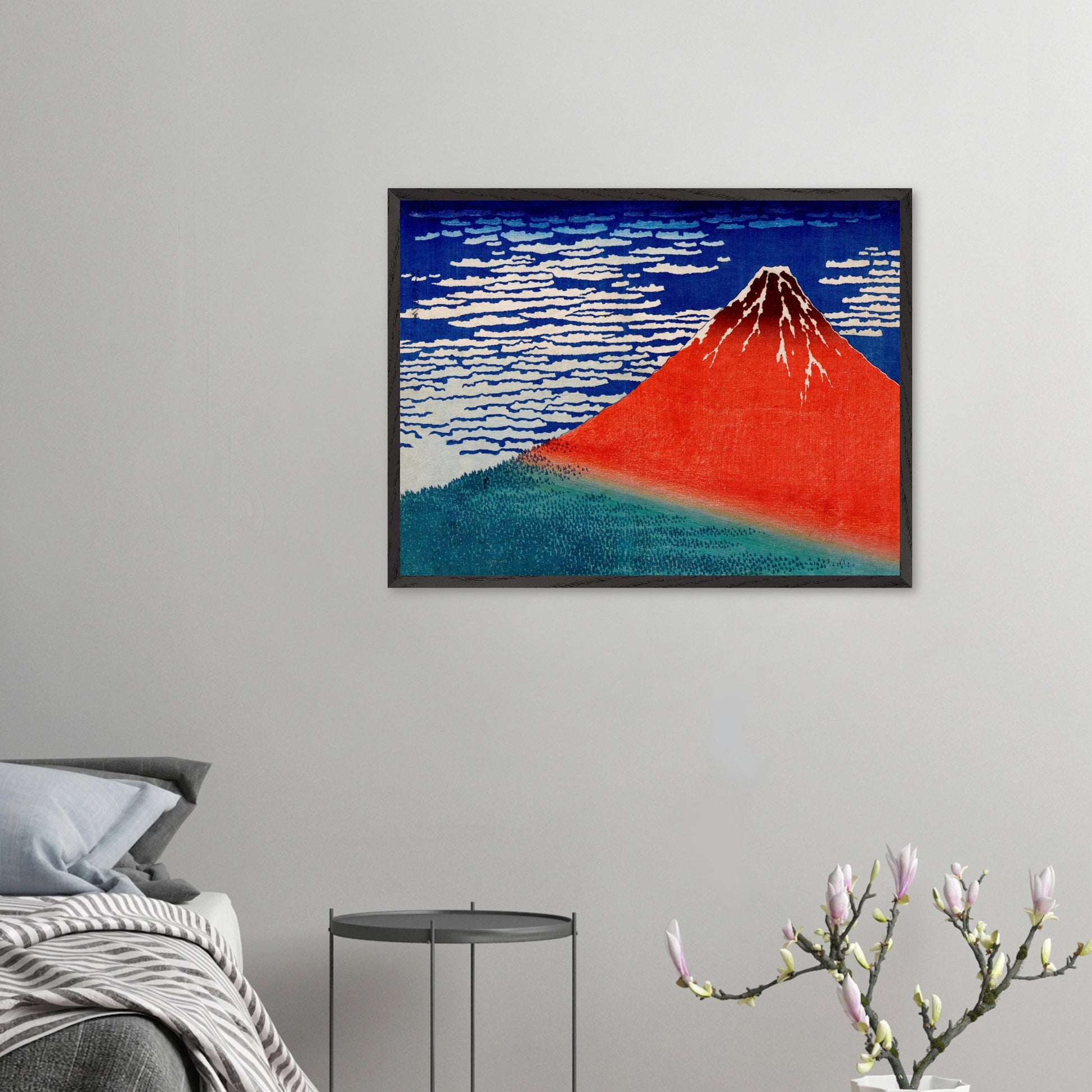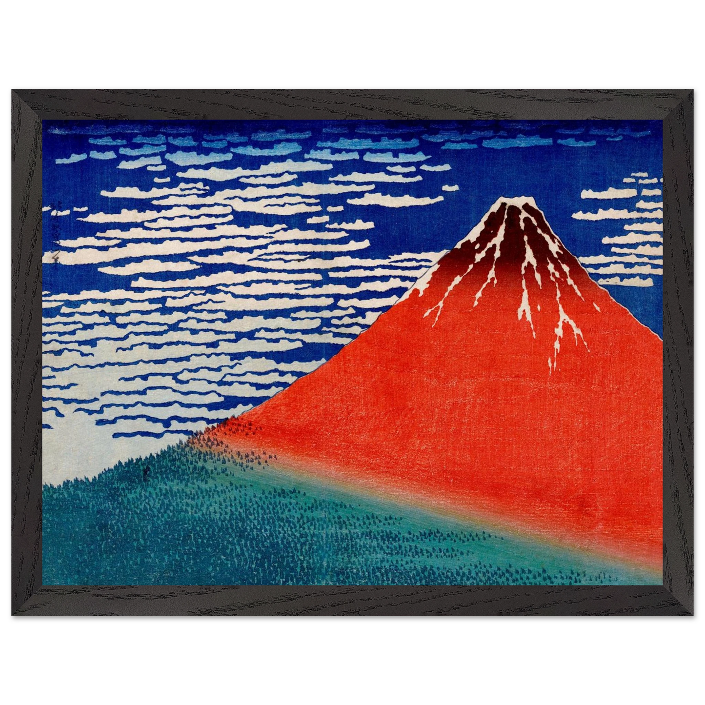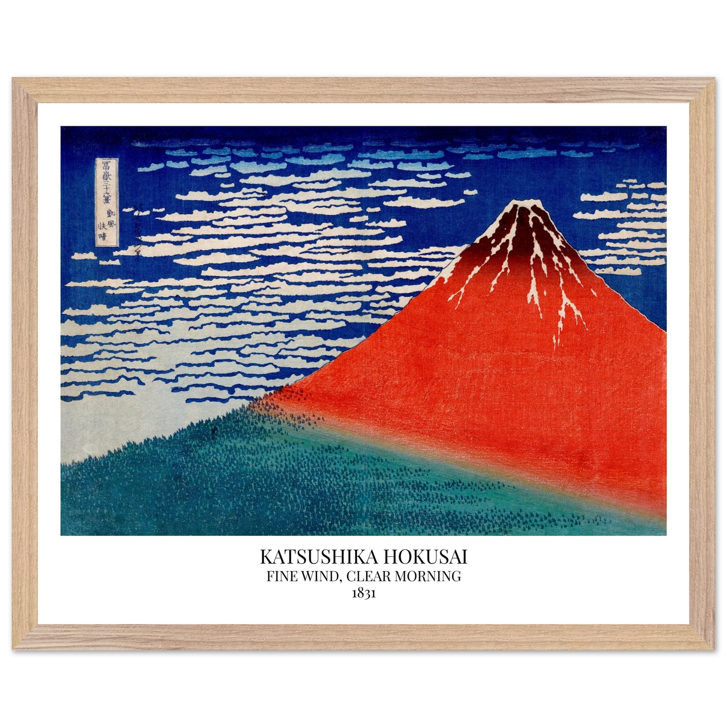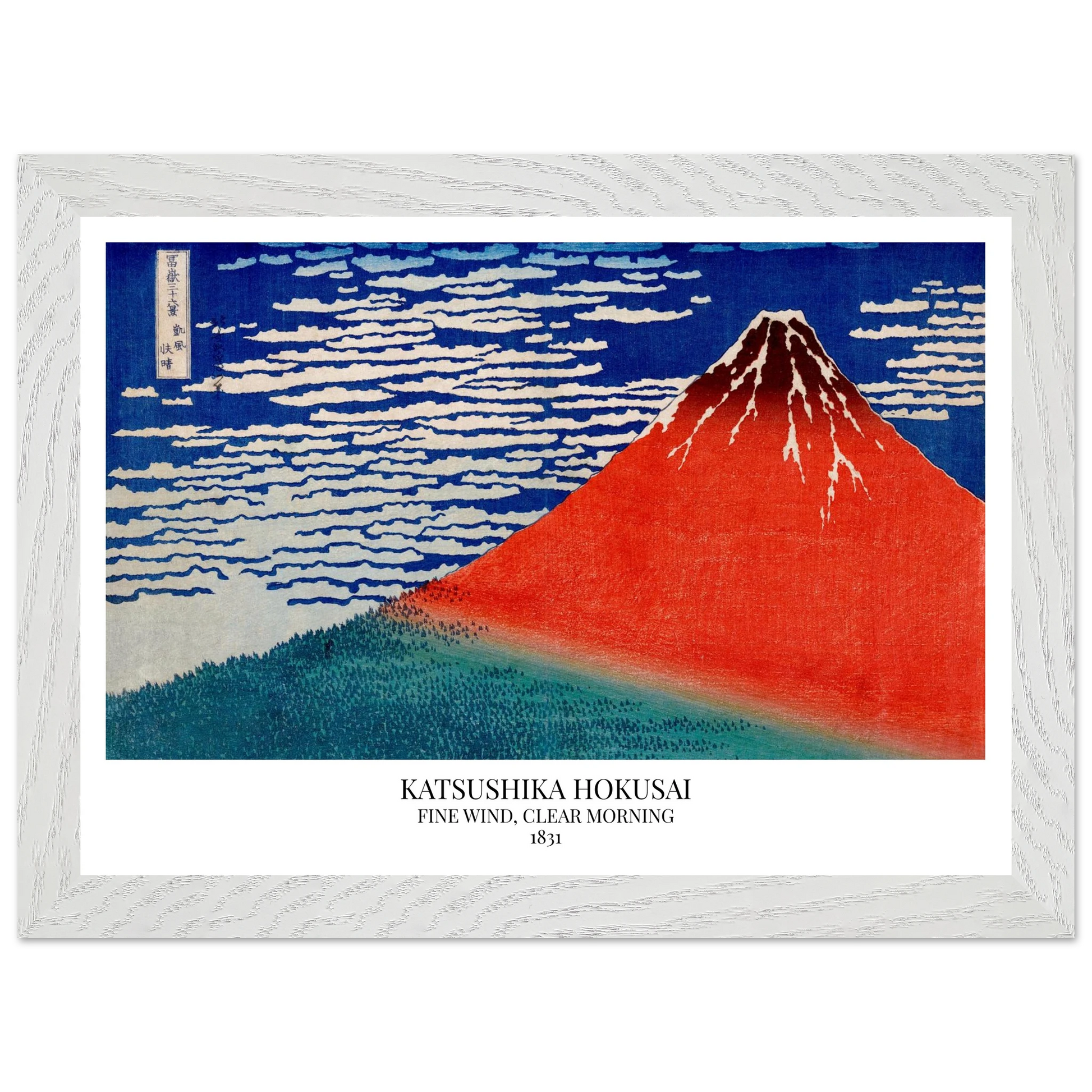 Fine Wind, Clear Morning (ca. 1831), auch bekannt als Red Fuji, ist eines der berühmtesten Werke von Katsushika Hokusai aus der Serie Thirty-Six Views of Mount Fuji. Das Bild zeigt den Berg Fuji an einem klaren Herbstmorgen, dessen Hänge in rötlichem Sonnenlicht leuchten. Die reduzierte Komposition mit dem ruhig aufragenden Vulkan vor tiefblauem Himmel verkörpert Harmonie, Naturverehrung und grafische Meisterschaft.