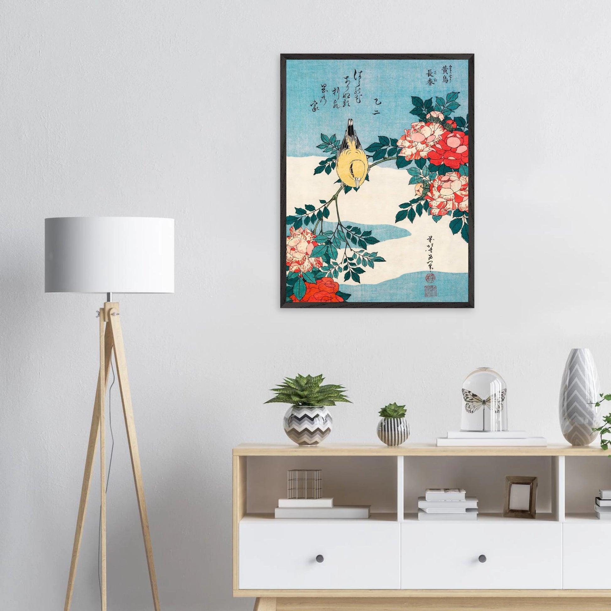 Katsushika Hokusai - Warbler and Roses - gerahmter Druck