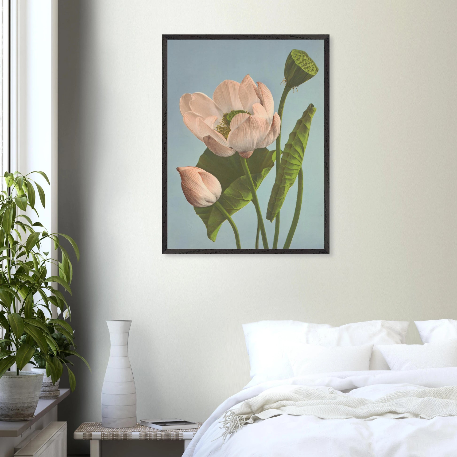 Nelumbo nucifera (1896) zeigt eine elegante Lotusblüte in sanften Rosa- und Grüntönen, meisterhaft festgehalten in feiner fotografischer Technik. Die Darstellung strahlt Ruhe, Reinheit und natürliche Harmonie aus.