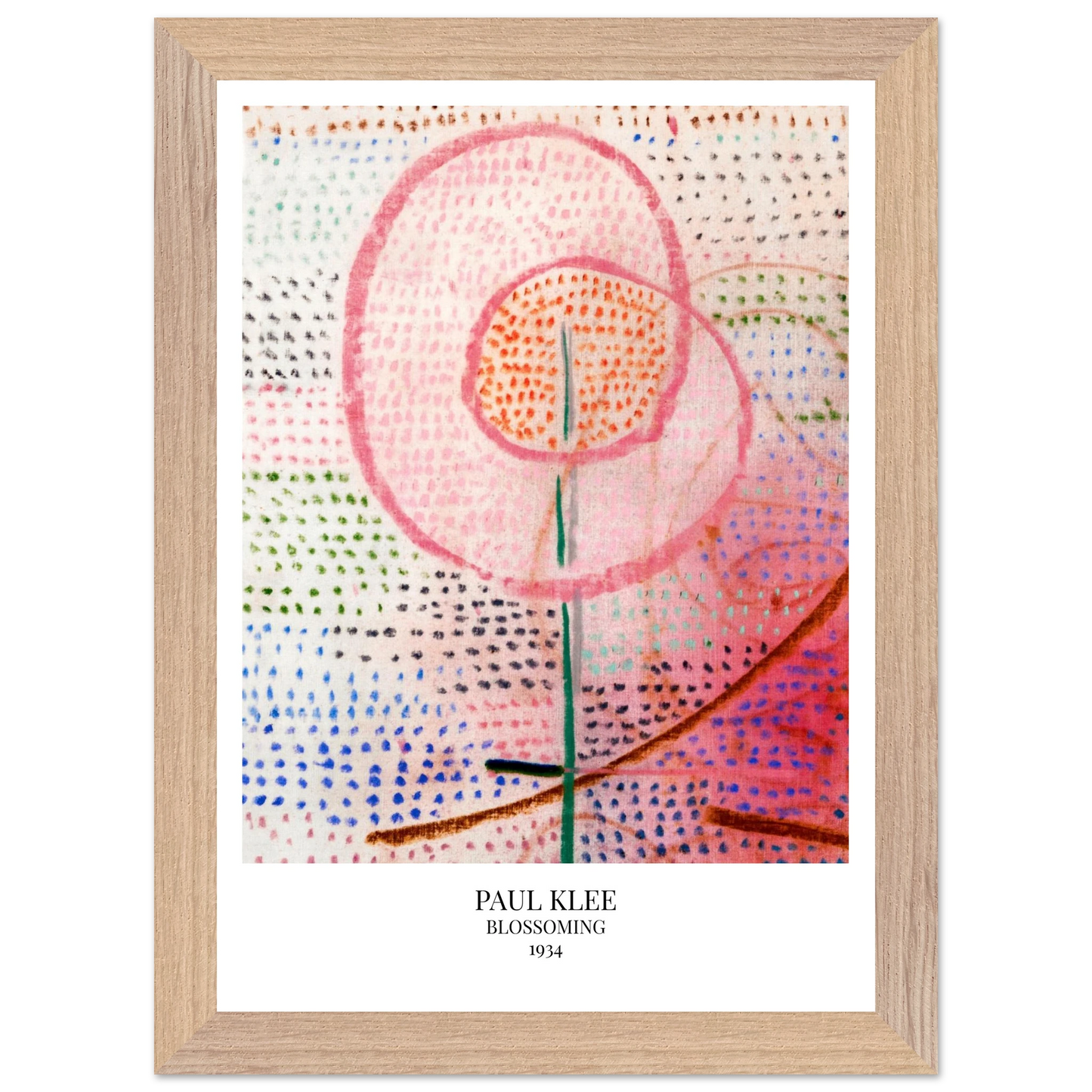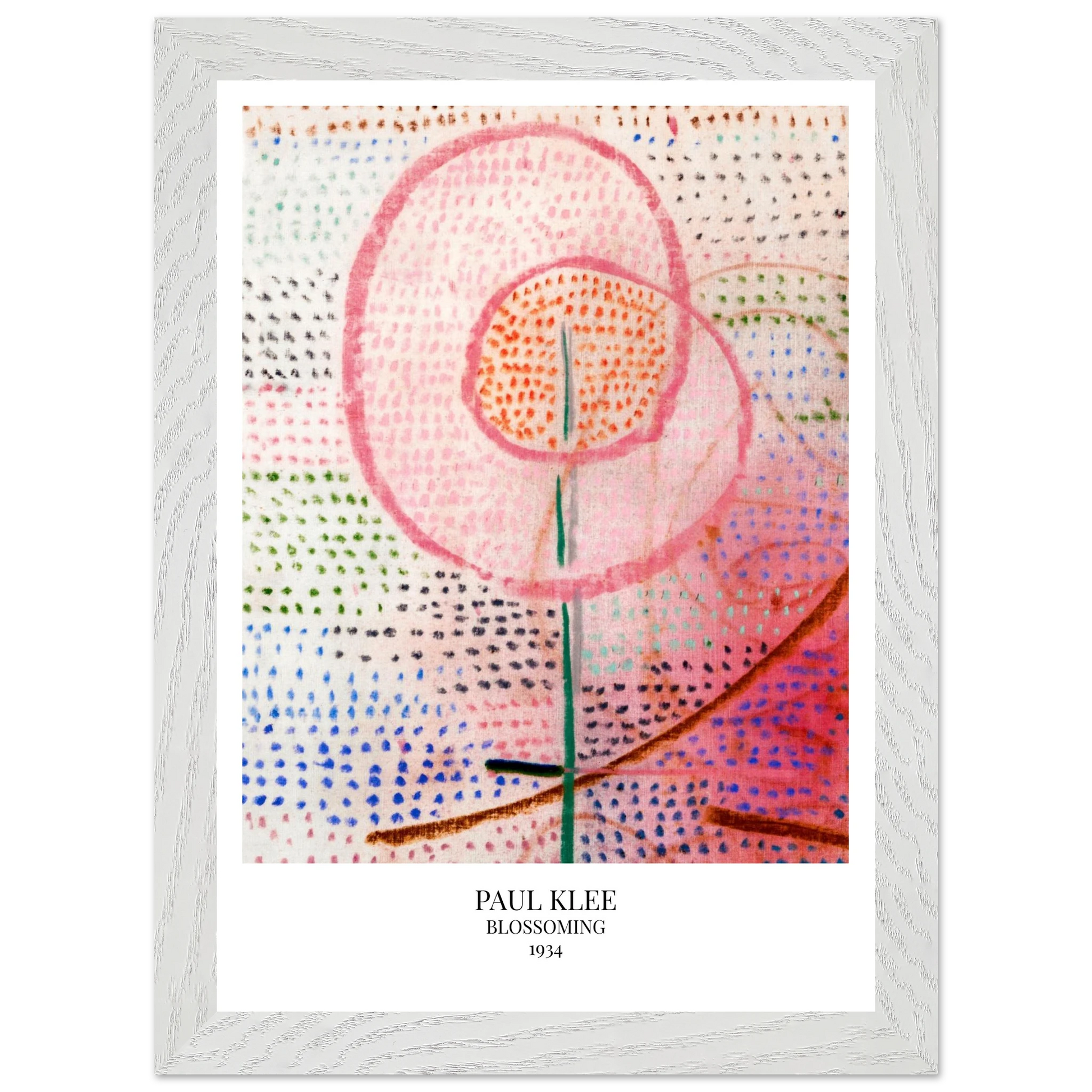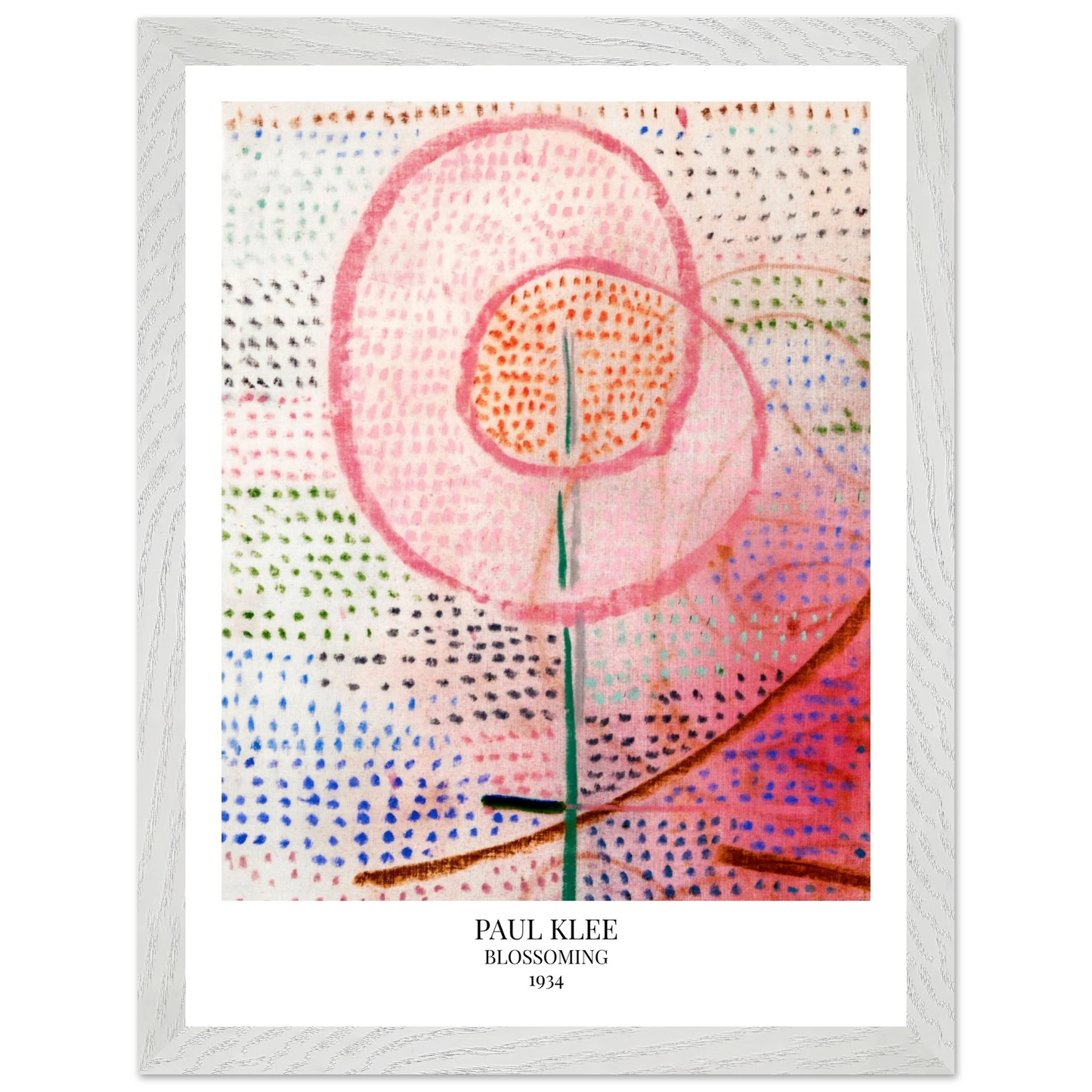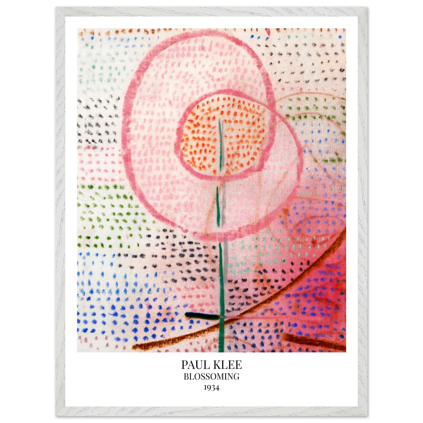 Blossoming (1934) von Paul Klee zeigt eine stilisierte, abstrakte Pflanzenform, die inmitten eines strukturierten, farblich fein abgestuften Hintergrunds zu blühen scheint. Das Werk vereint Naturmotivik mit konstruktiver Ordnung und symbolischer Tiefe – ein leises Sinnbild für Wachstum, Wandlung und inneres Leben in Klee’s später Schaffensphase.