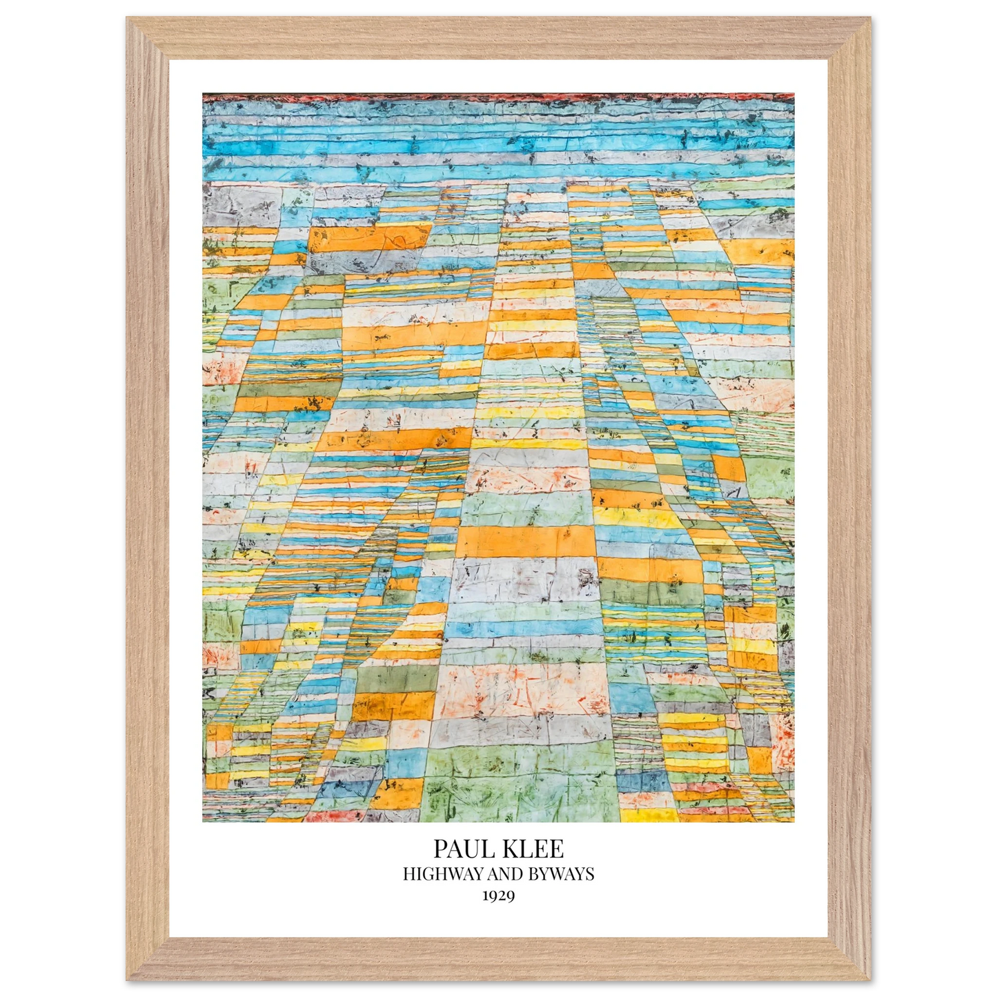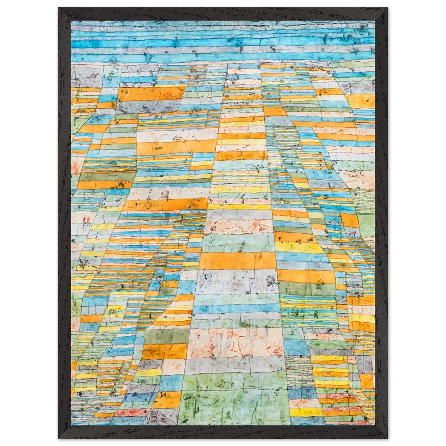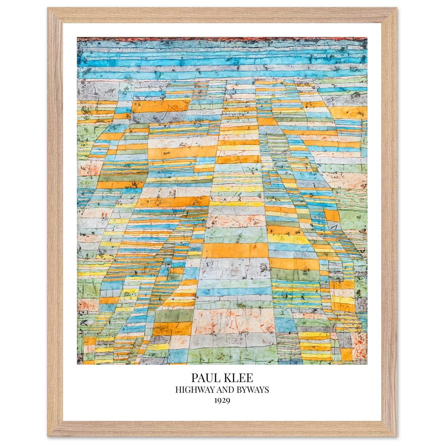 Highway and Byways (1929) von Paul Klee zeigt ein feingliedriges Arrangement aus Linien, Farbstreifen und Rasterflächen, in dem Wege und Achsen ein abstraktes Netz formen. Das Werk verbindet technische Präzision mit poetischer Abstraktion, indem es Wege, Bewegung und Struktur in harmonischer Farbkomposition entfaltet – typisch für Klees späte Phase.