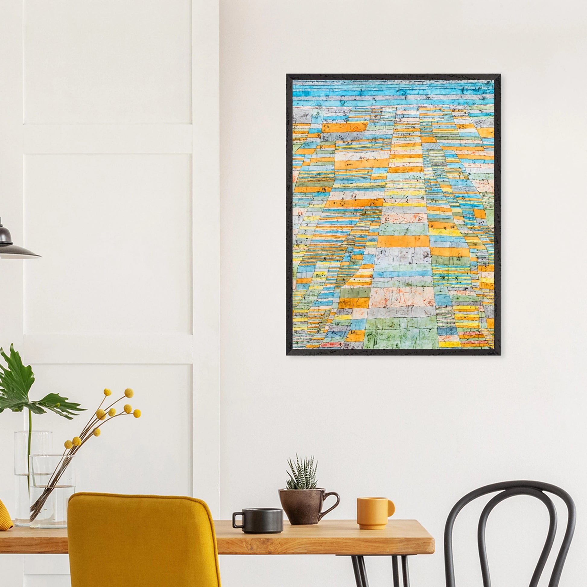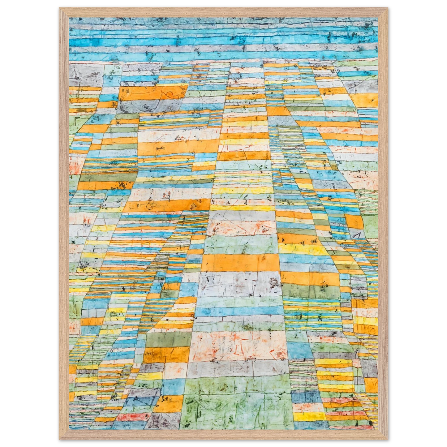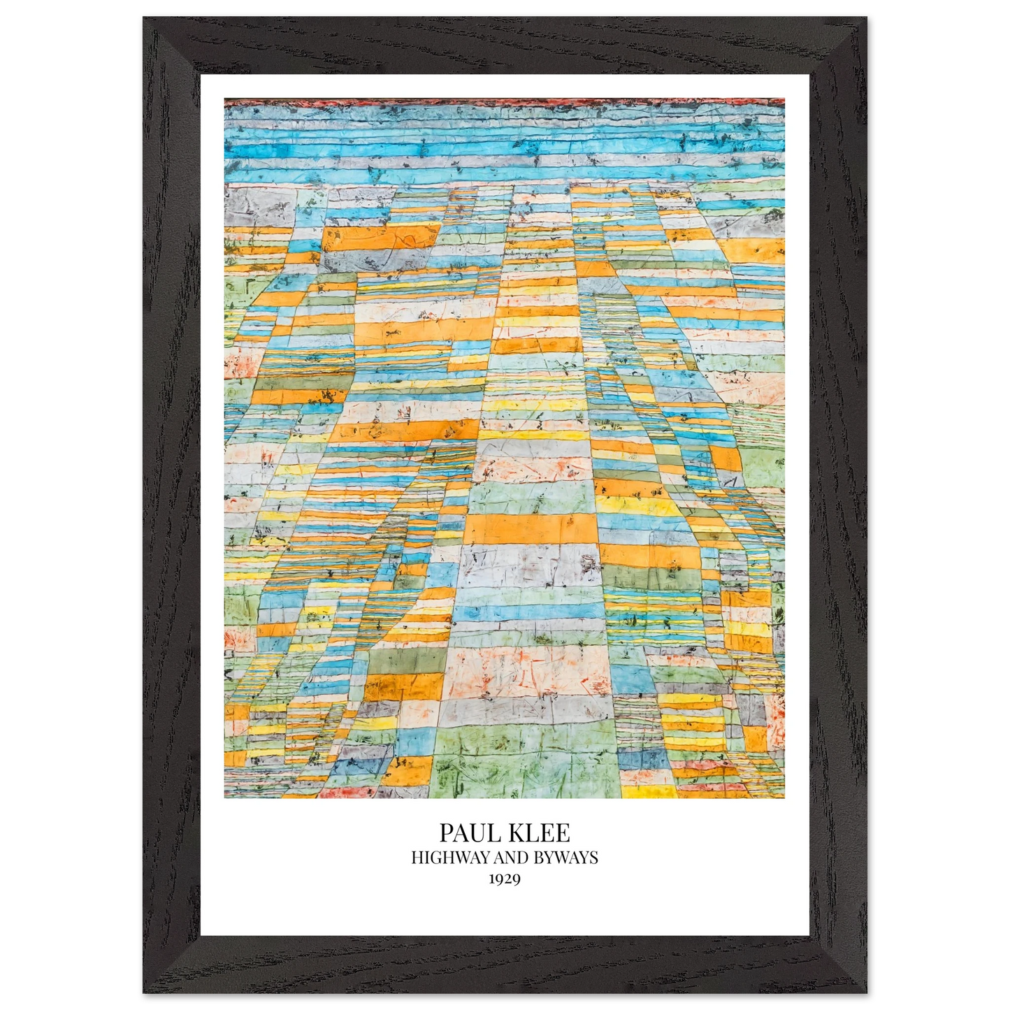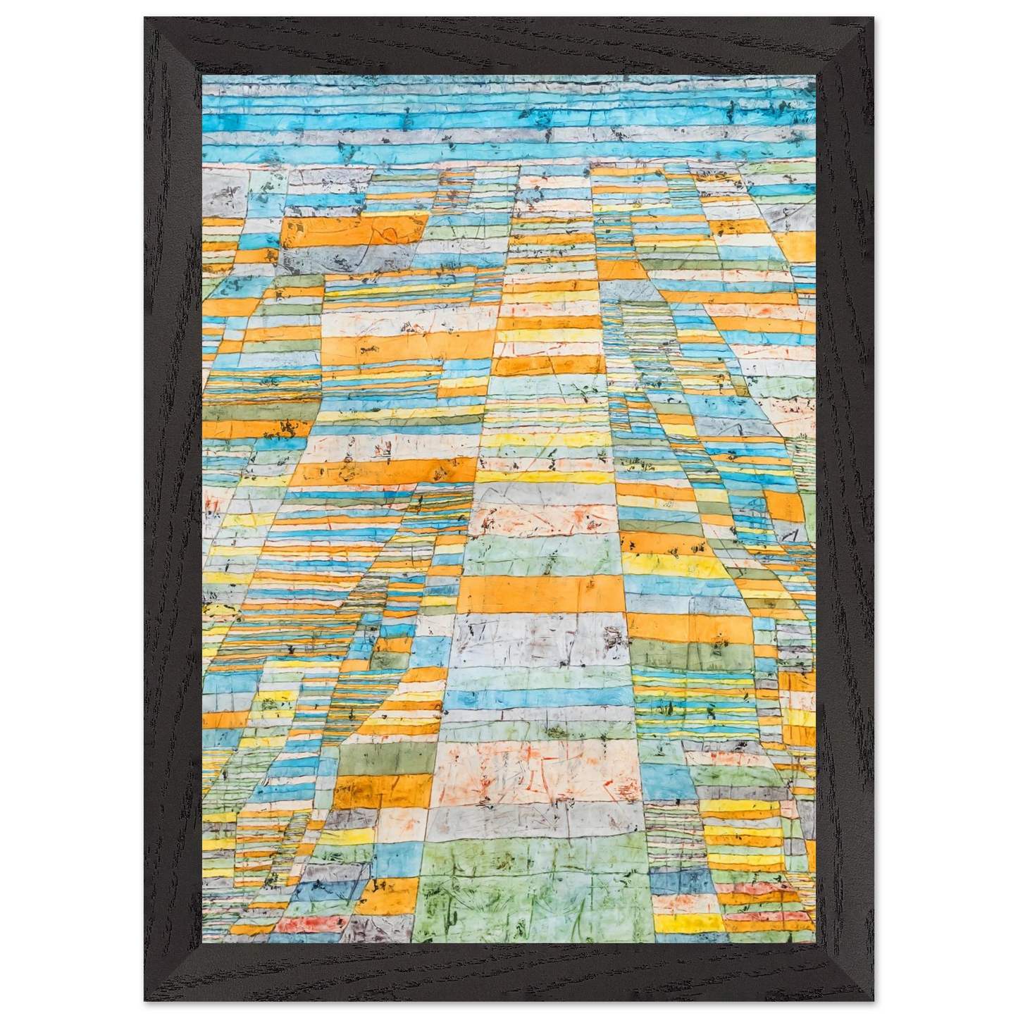 Highway and Byways (1929) von Paul Klee zeigt ein feingliedriges Arrangement aus Linien, Farbstreifen und Rasterflächen, in dem Wege und Achsen ein abstraktes Netz formen. Das Werk verbindet technische Präzision mit poetischer Abstraktion, indem es Wege, Bewegung und Struktur in harmonischer Farbkomposition entfaltet – typisch für Klees späte Phase.