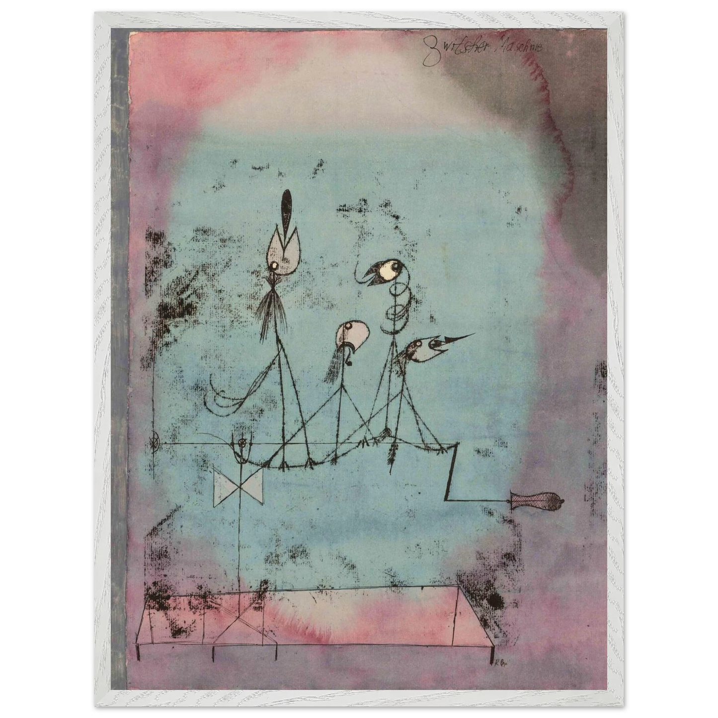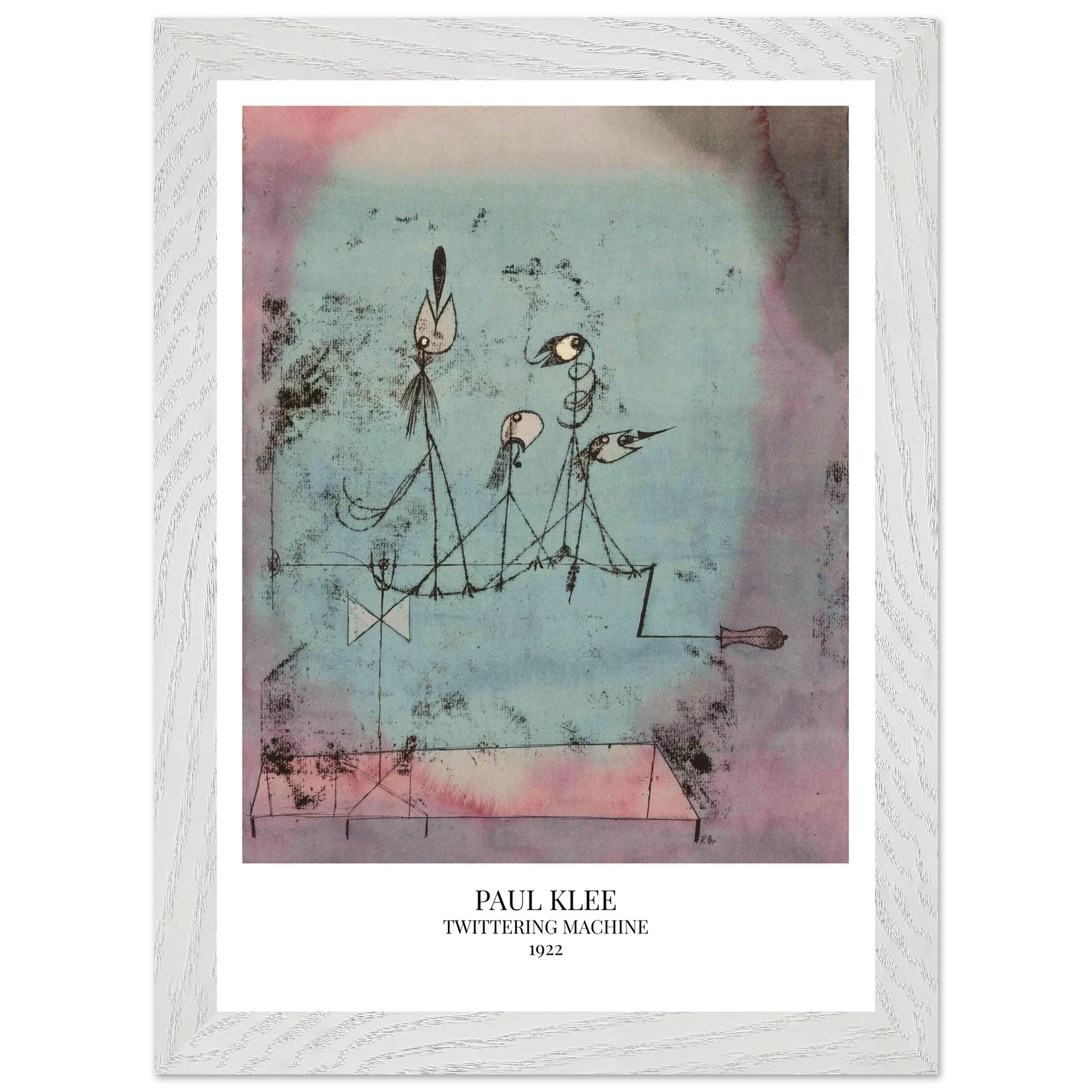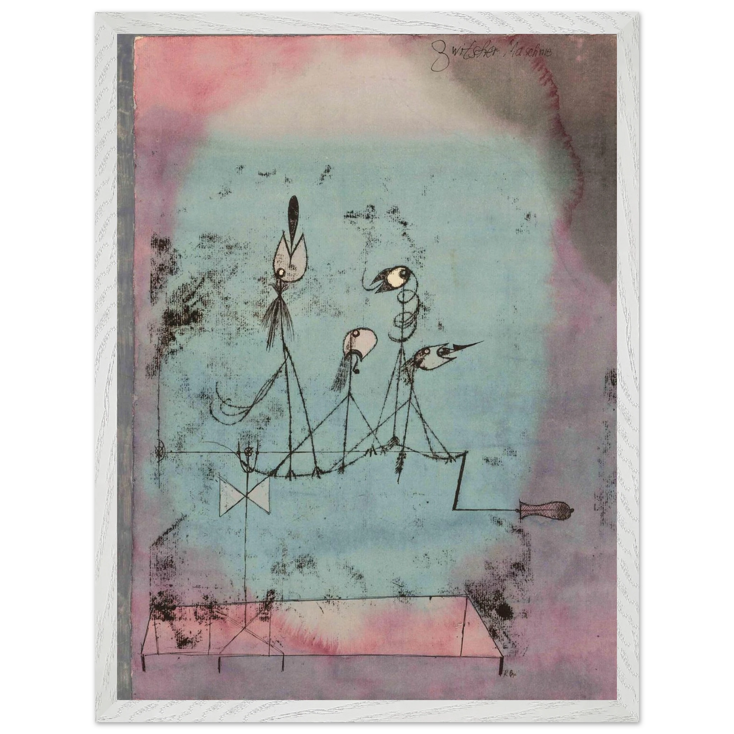 Twittering Machine (1922) von Paul Klee zeigt eine Reihe skurriler, vogelähnlicher Figuren, mechanisch verbunden auf einer Drahtstange, die in eine Kurbel übergeht. In feiner Linienführung und surrealer Anmutung verbindet das Werk Technik und Natur, Spiel und Abgründigkeit – ein ironisch-poetisches Sinnbild der Moderne.