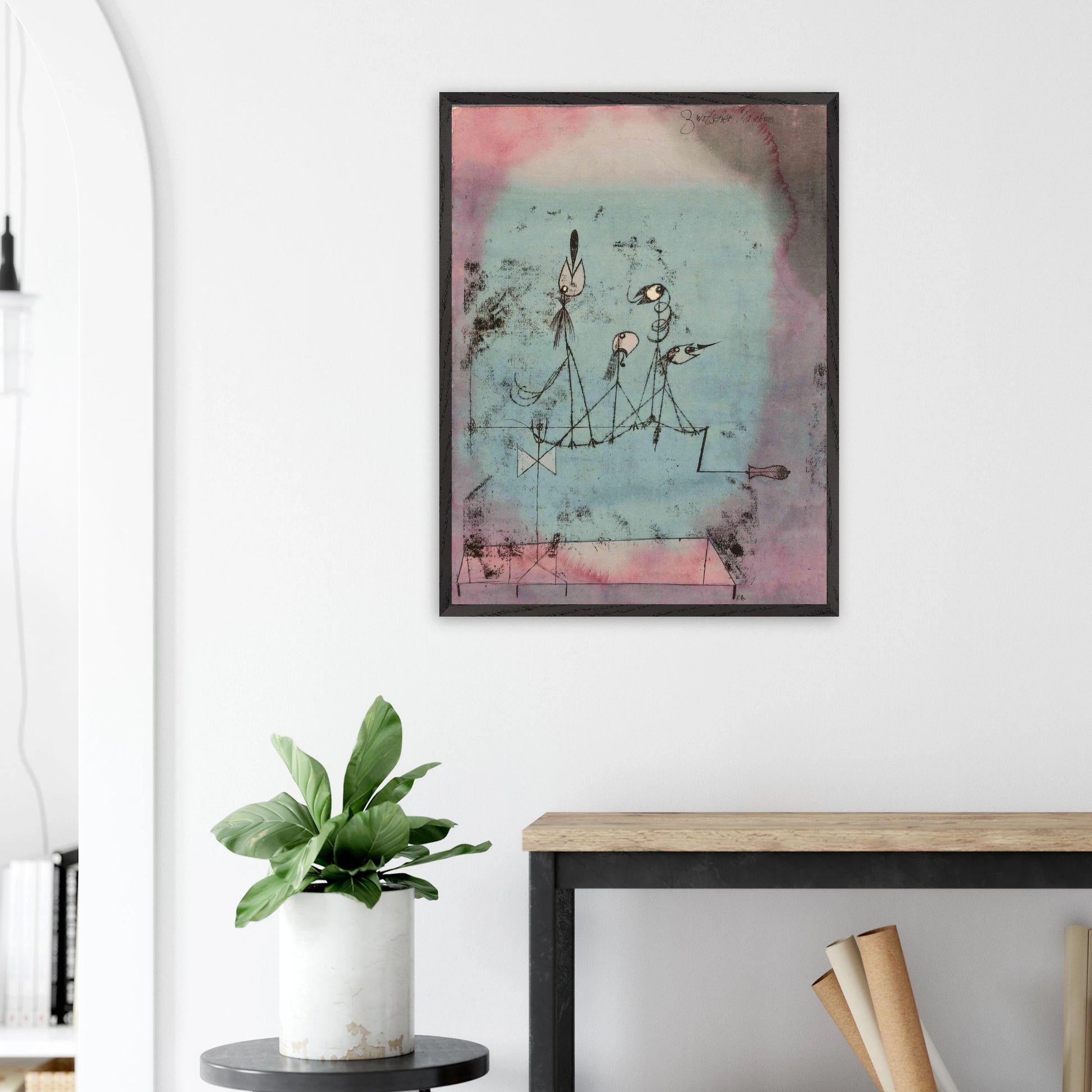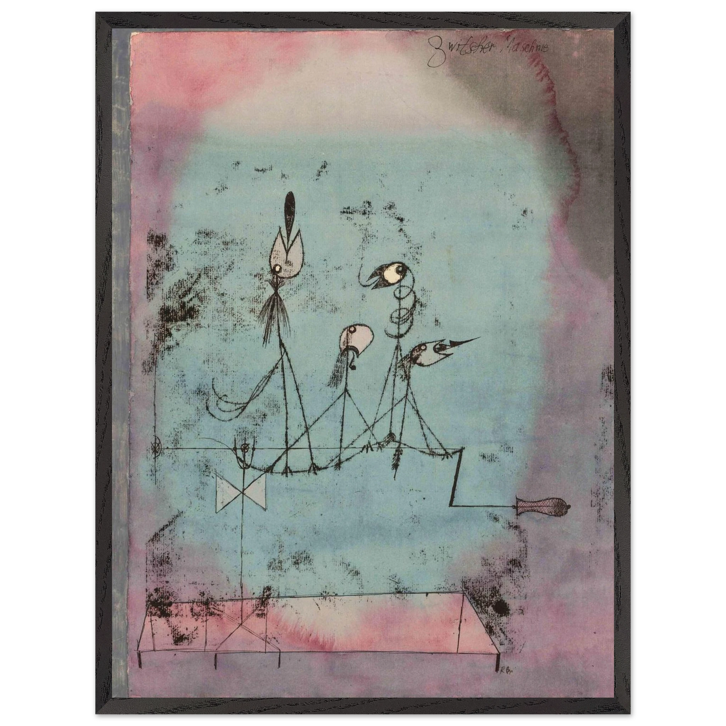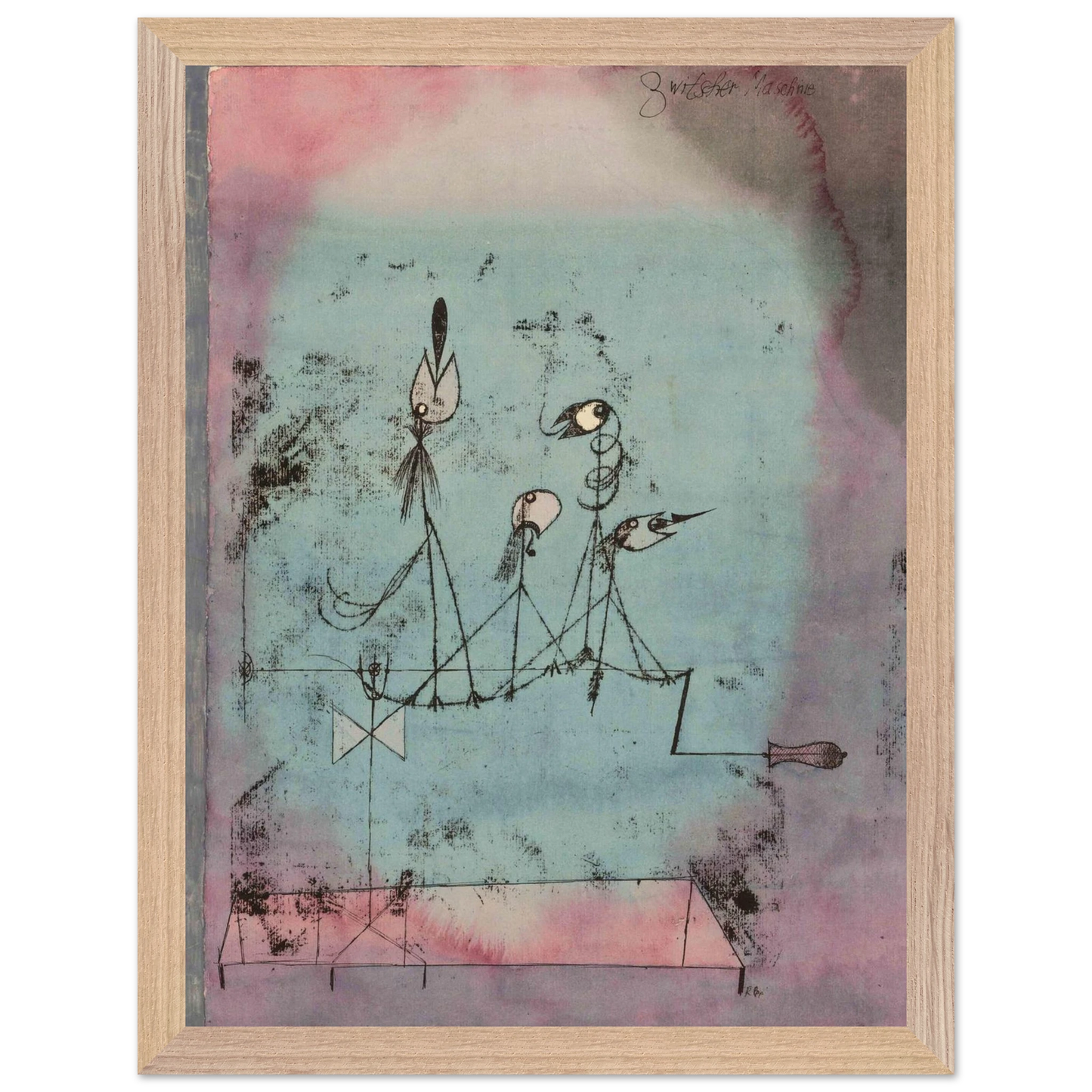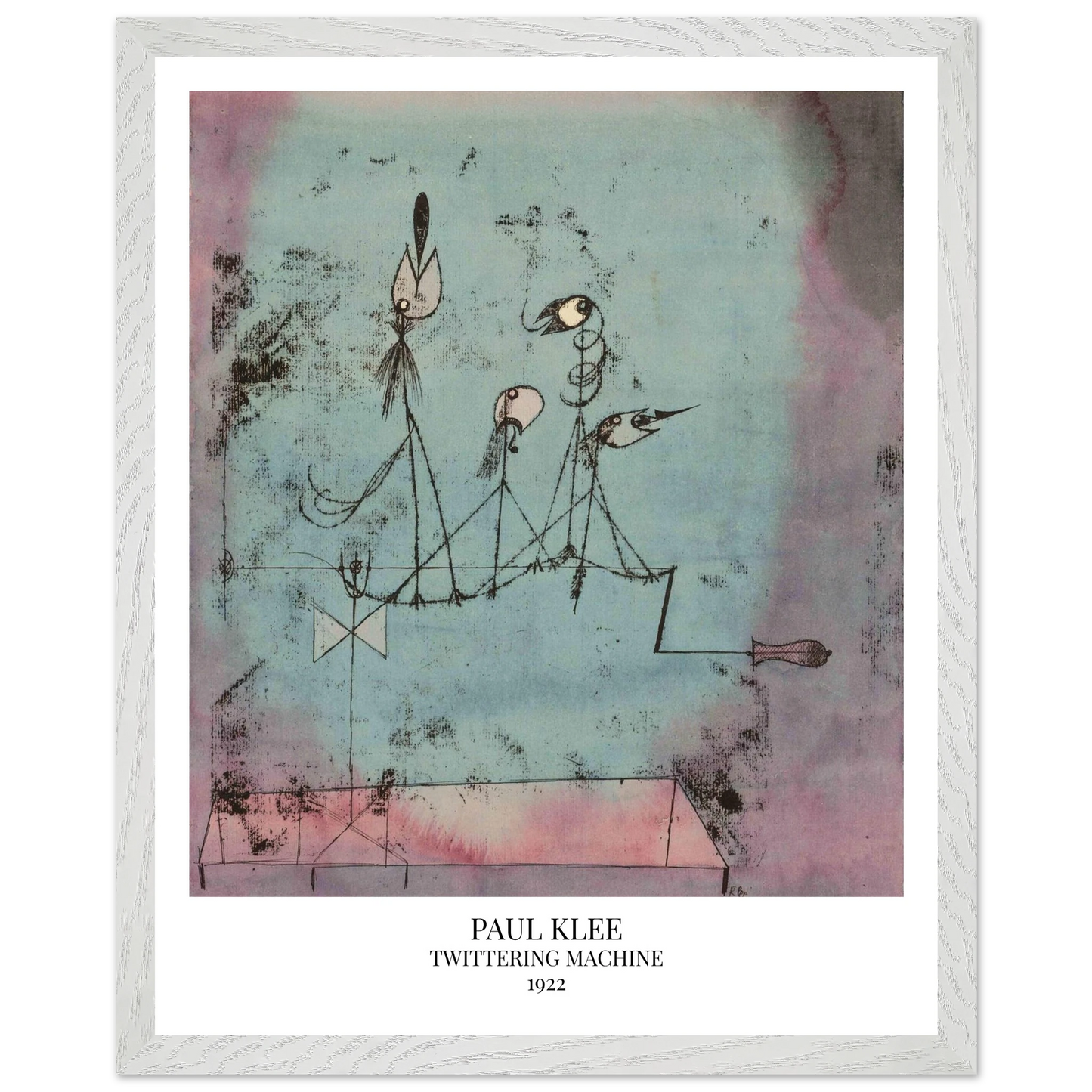 Twittering Machine (1922) von Paul Klee zeigt eine Reihe skurriler, vogelähnlicher Figuren, mechanisch verbunden auf einer Drahtstange, die in eine Kurbel übergeht. In feiner Linienführung und surrealer Anmutung verbindet das Werk Technik und Natur, Spiel und Abgründigkeit – ein ironisch-poetisches Sinnbild der Moderne.
