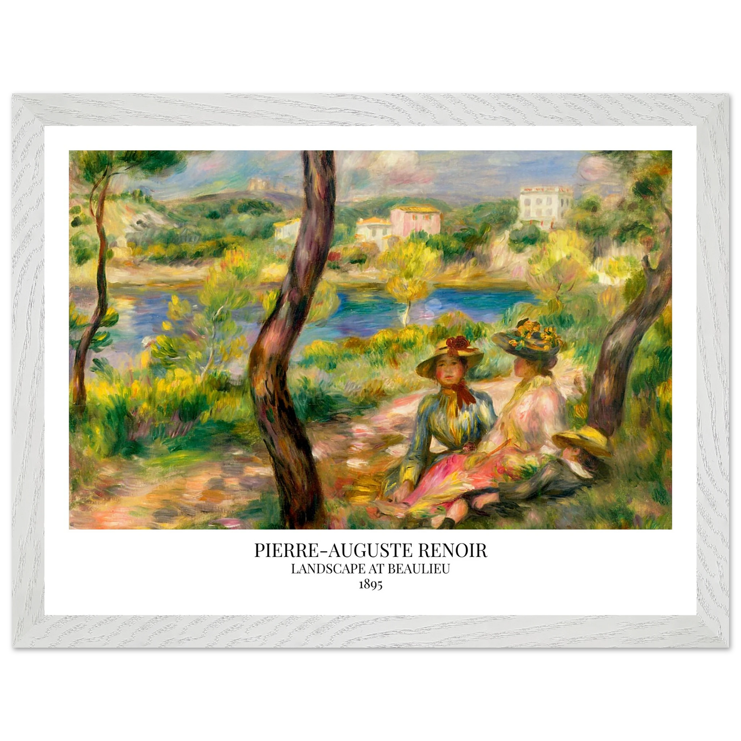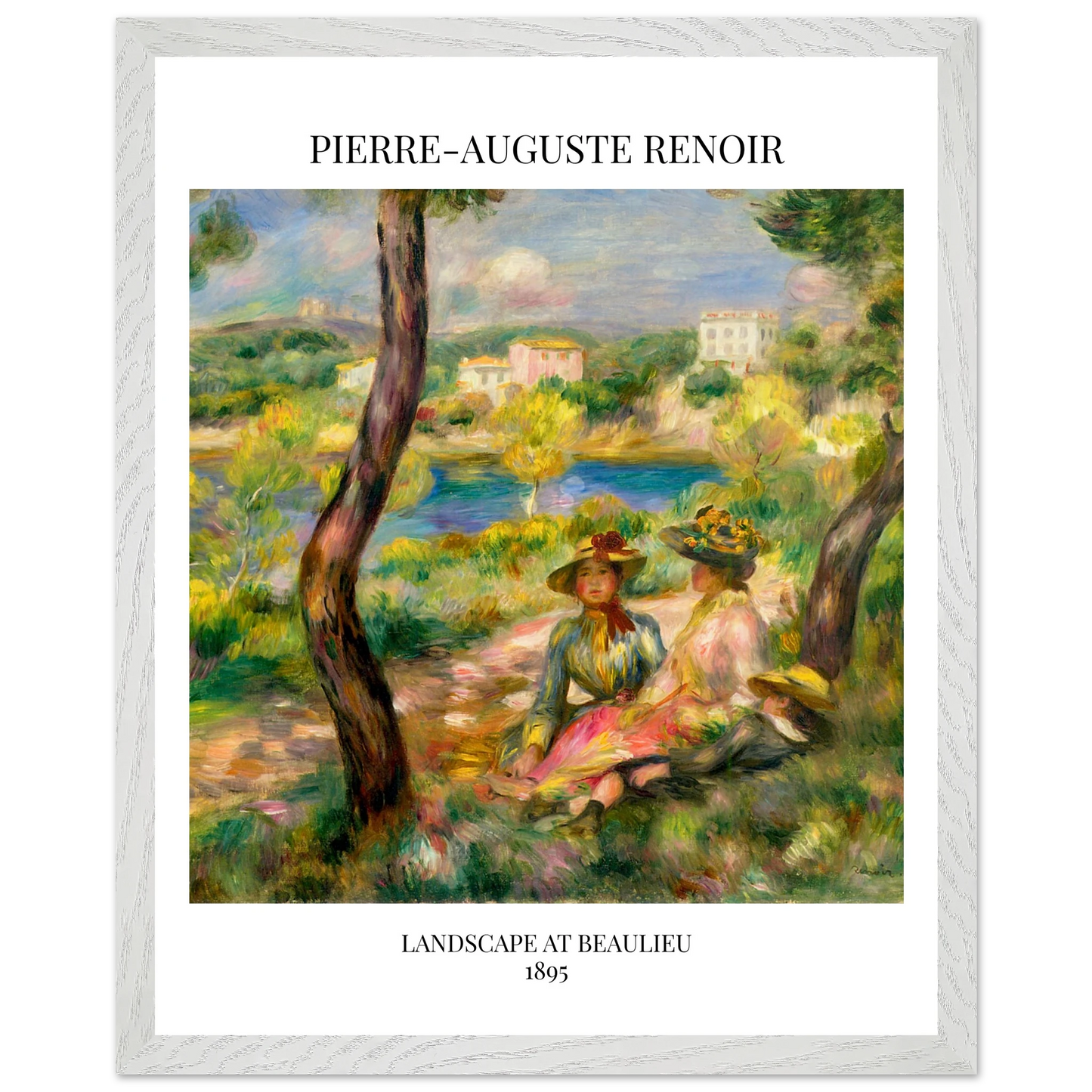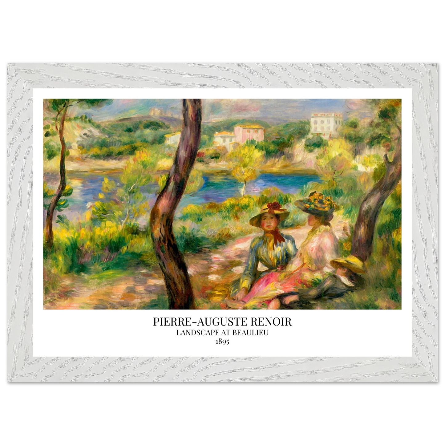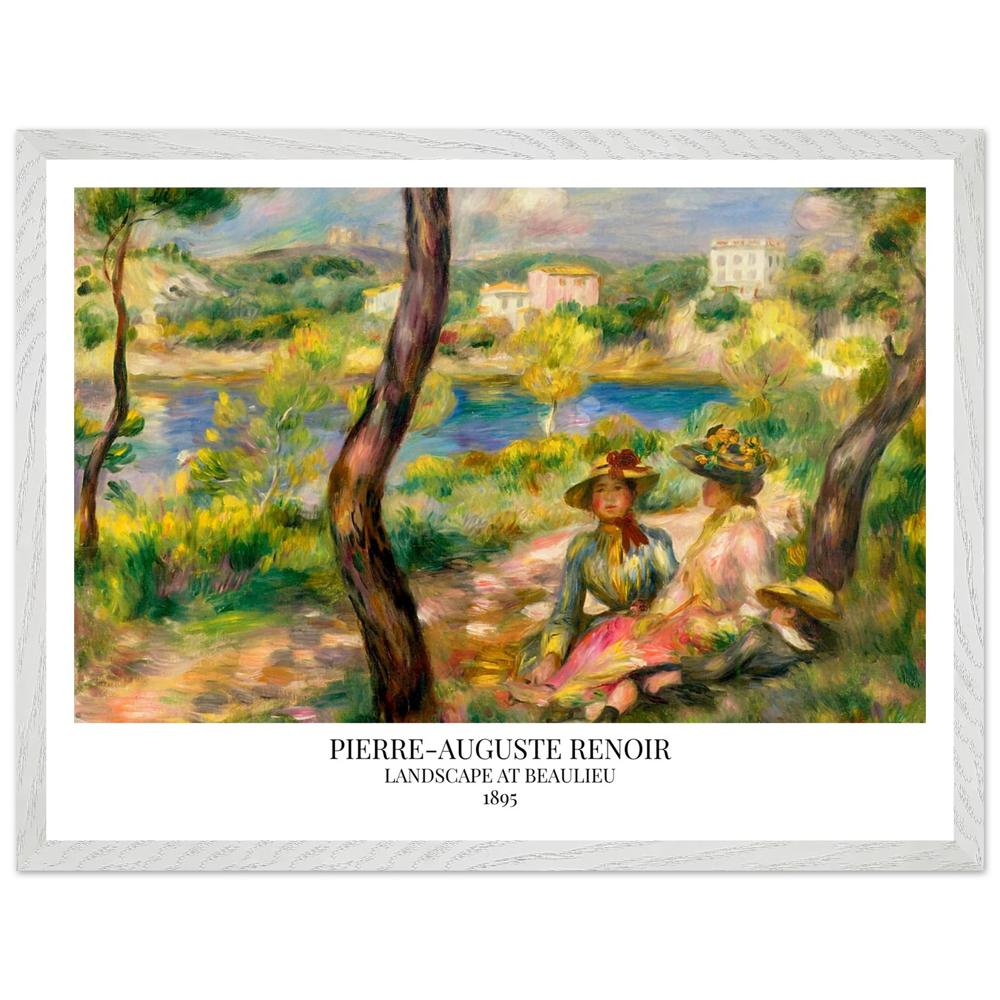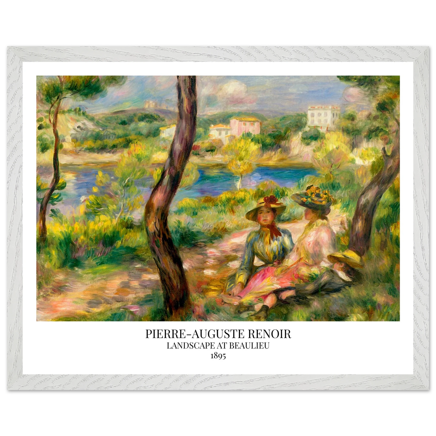 In Landscape at Beaulieu (1895) verbindet Pierre-Auguste Renoir meisterhaft Landschaft und Figurenmalerei. Zwei elegant gekleidete Frauen und ein Kind ruhen im Schatten eines Baumes am Ufer eines ruhigen Gewässers, eingebettet in die mediterrane Landschaft der Côte d’Azur. Die weichen Pinselstriche, das leuchtende Licht und die warme Farbpalette verleihen dem Gemälde eine träumerische, fast zeitlose Atmosphäre. Es spiegelt Renoirs Spätstil wider, in dem Natur und Mensch in harmonischer Einheit erscheinen.