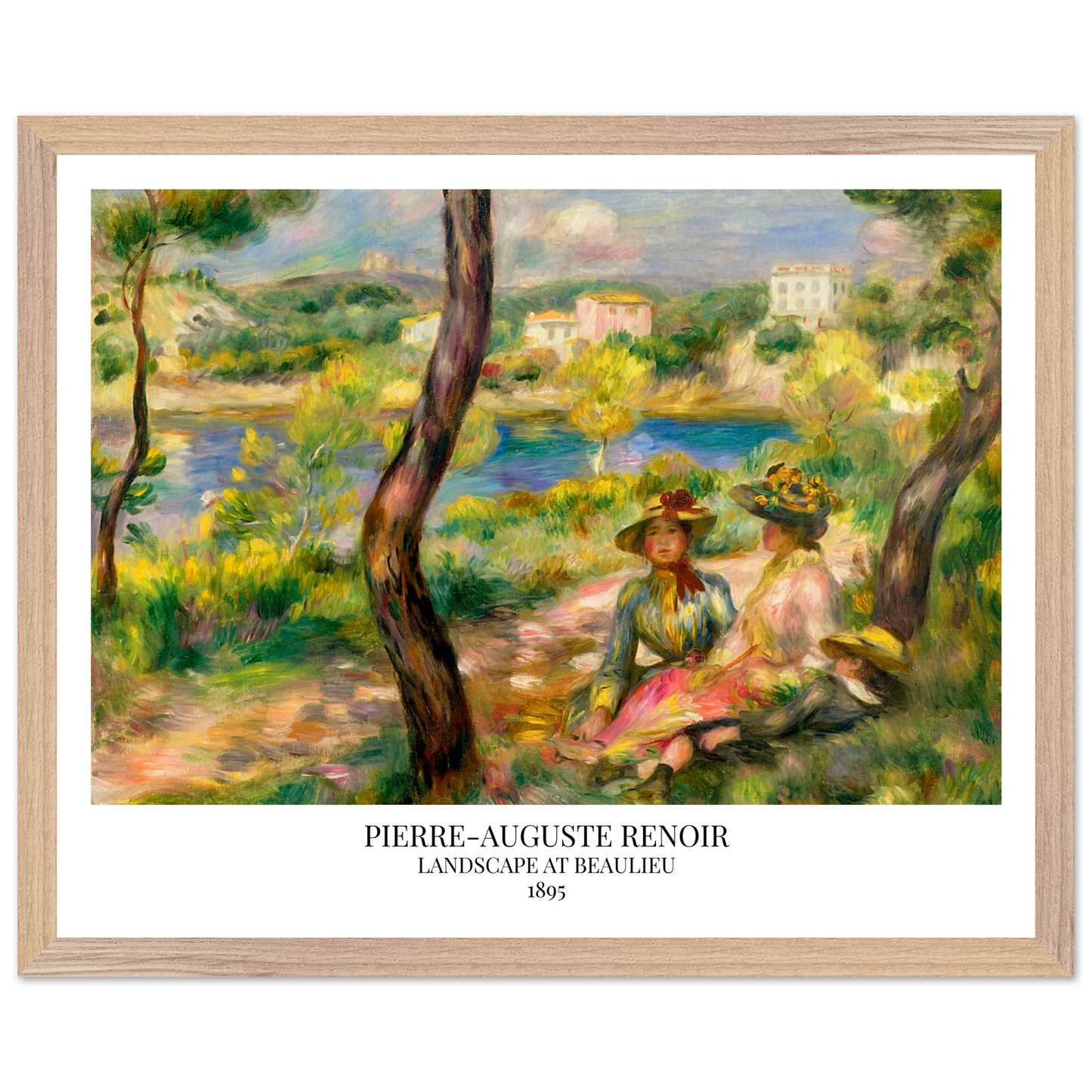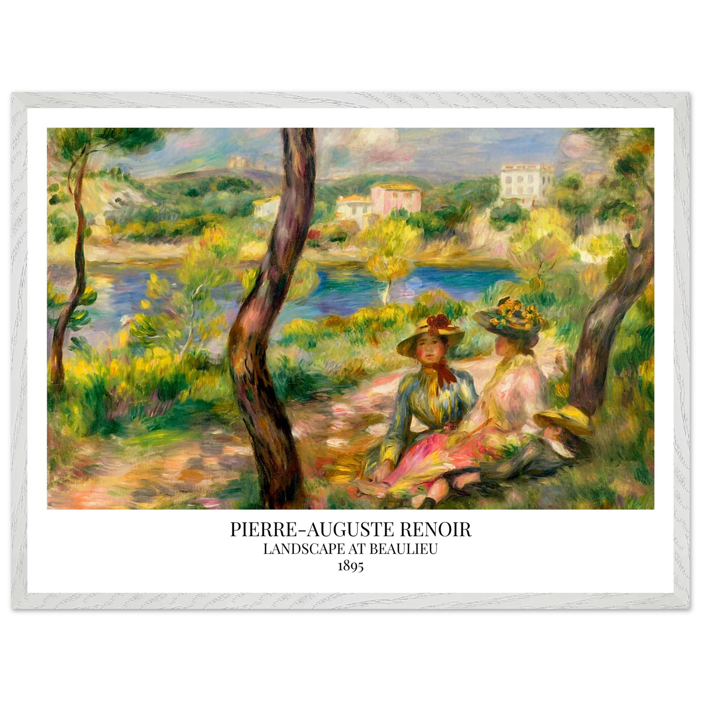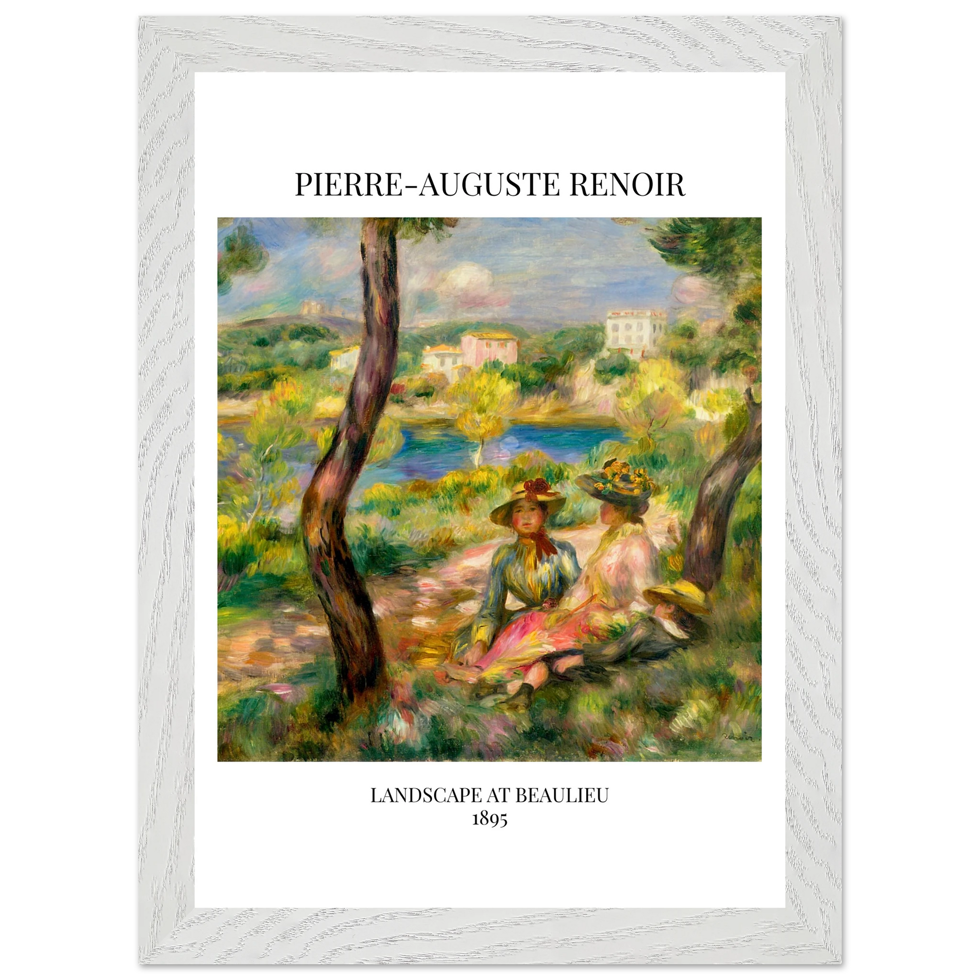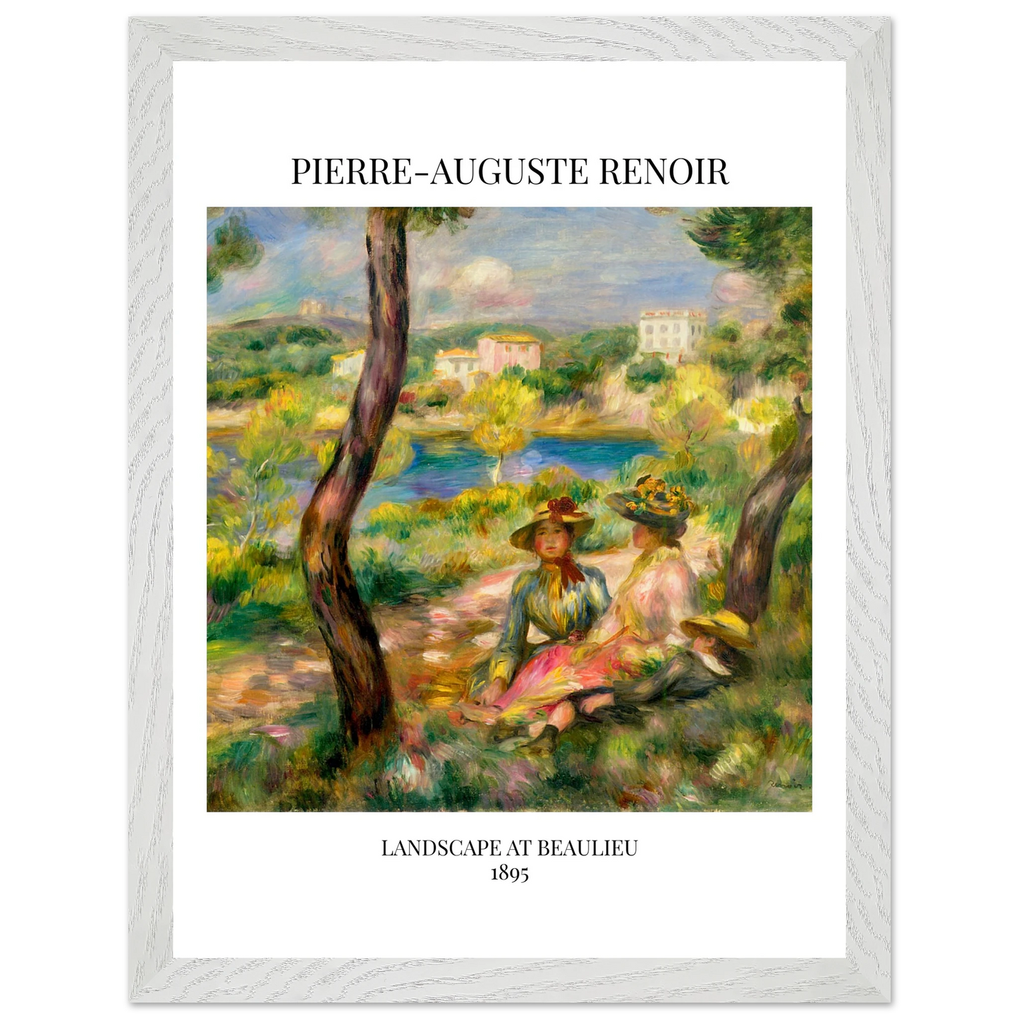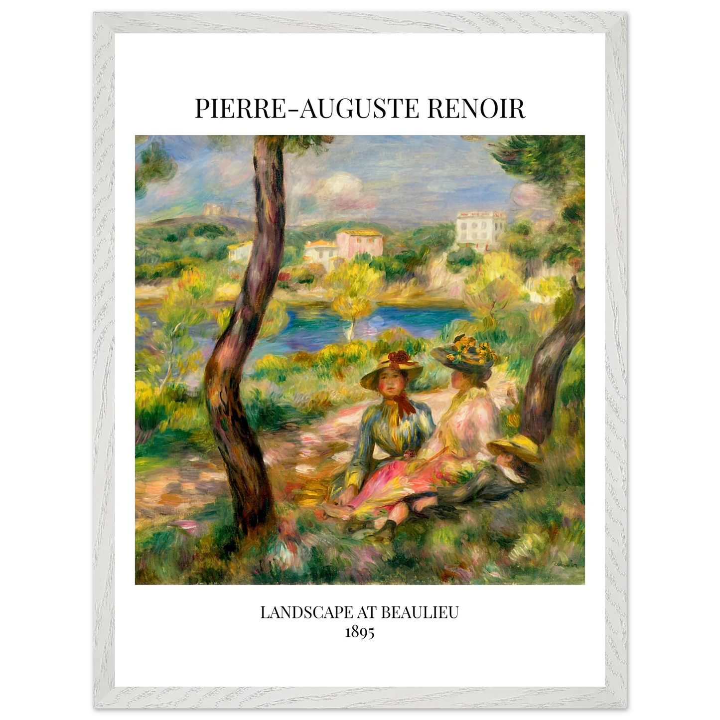 In Landscape at Beaulieu (1895) verbindet Pierre-Auguste Renoir meisterhaft Landschaft und Figurenmalerei. Zwei elegant gekleidete Frauen und ein Kind ruhen im Schatten eines Baumes am Ufer eines ruhigen Gewässers, eingebettet in die mediterrane Landschaft der Côte d’Azur. Die weichen Pinselstriche, das leuchtende Licht und die warme Farbpalette verleihen dem Gemälde eine träumerische, fast zeitlose Atmosphäre. Es spiegelt Renoirs Spätstil wider, in dem Natur und Mensch in harmonischer Einheit erscheinen.