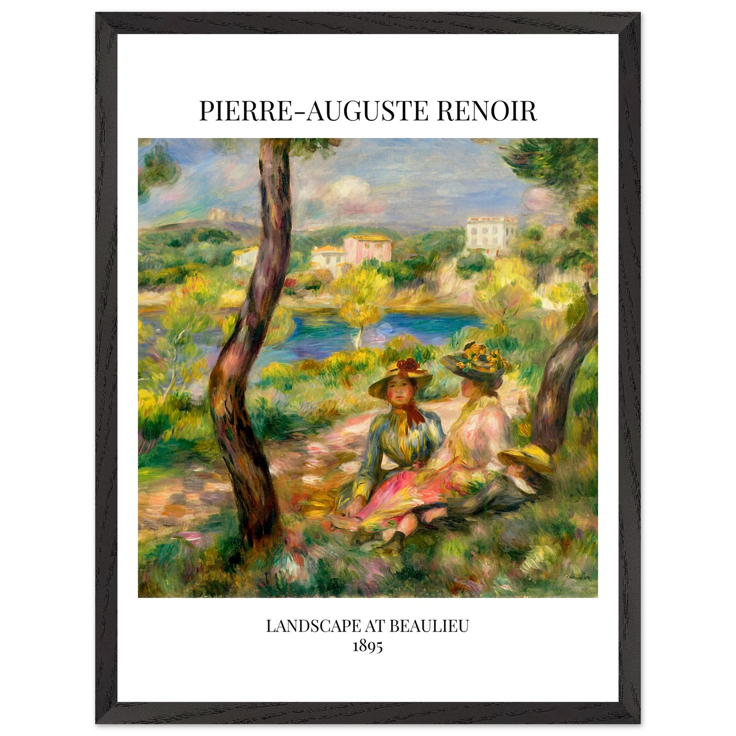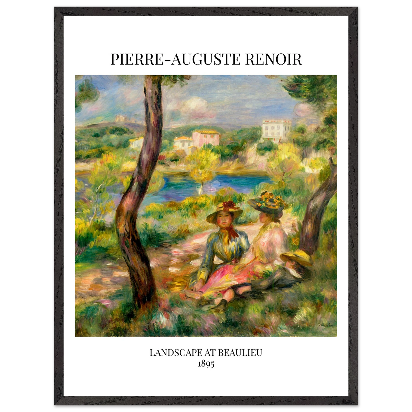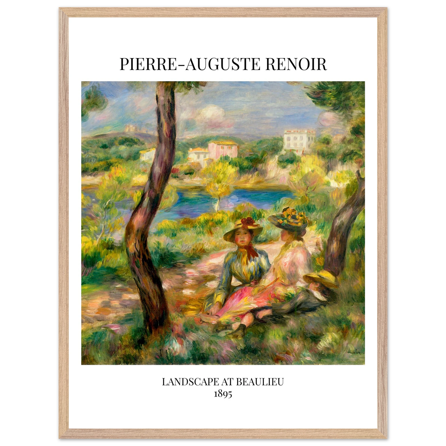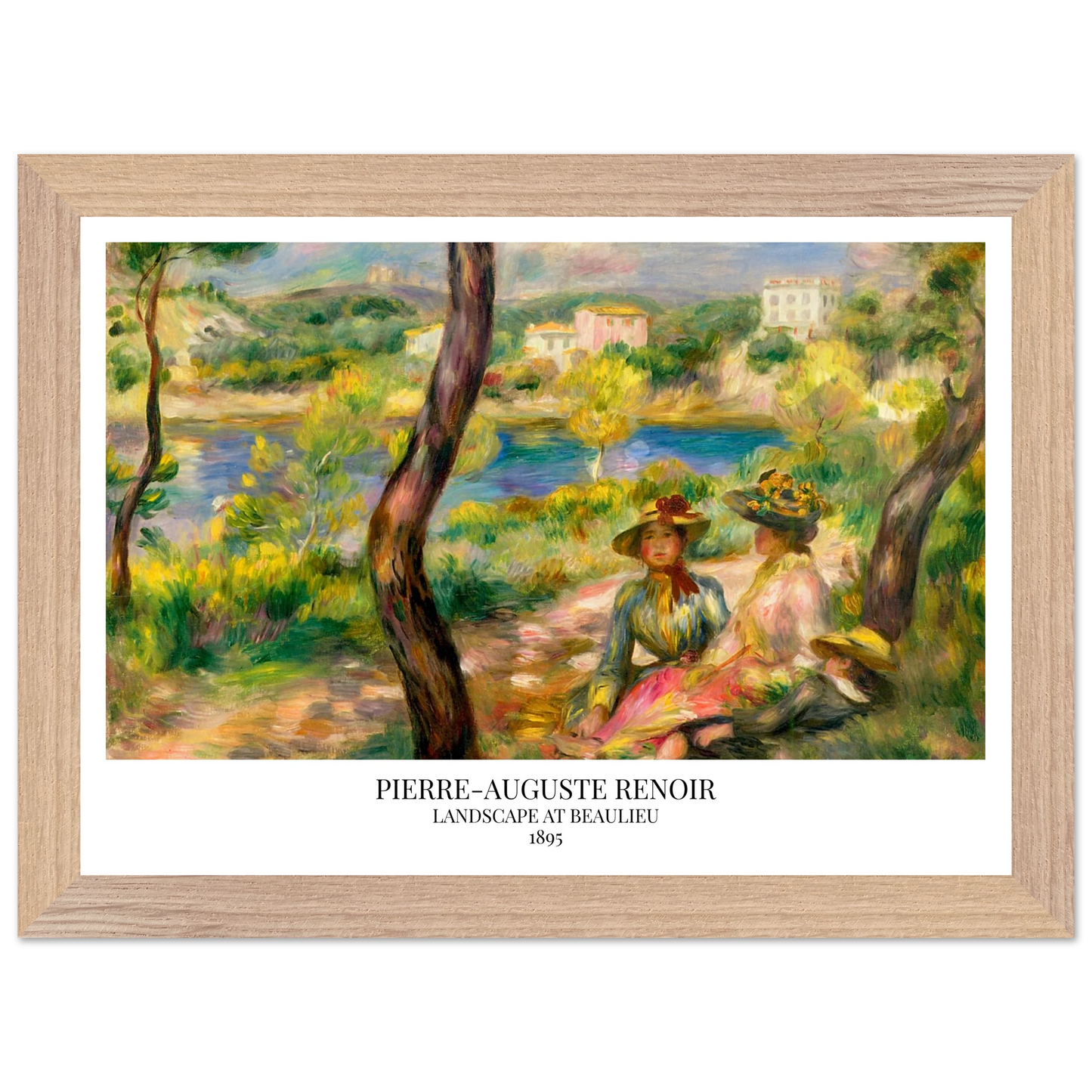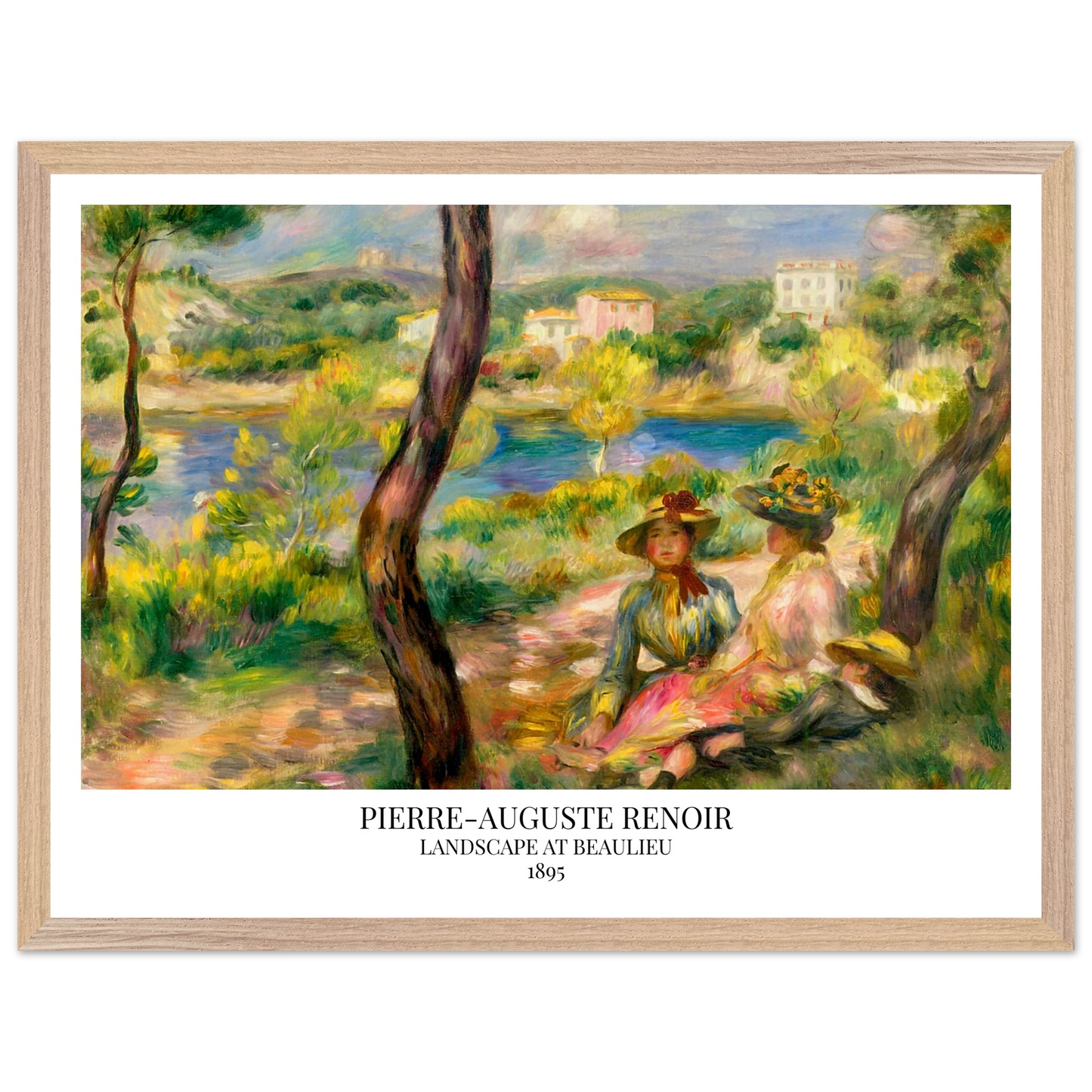 In Landscape at Beaulieu (1895) verbindet Pierre-Auguste Renoir meisterhaft Landschaft und Figurenmalerei. Zwei elegant gekleidete Frauen und ein Kind ruhen im Schatten eines Baumes am Ufer eines ruhigen Gewässers, eingebettet in die mediterrane Landschaft der Côte d’Azur. Die weichen Pinselstriche, das leuchtende Licht und die warme Farbpalette verleihen dem Gemälde eine träumerische, fast zeitlose Atmosphäre. Es spiegelt Renoirs Spätstil wider, in dem Natur und Mensch in harmonischer Einheit erscheinen.