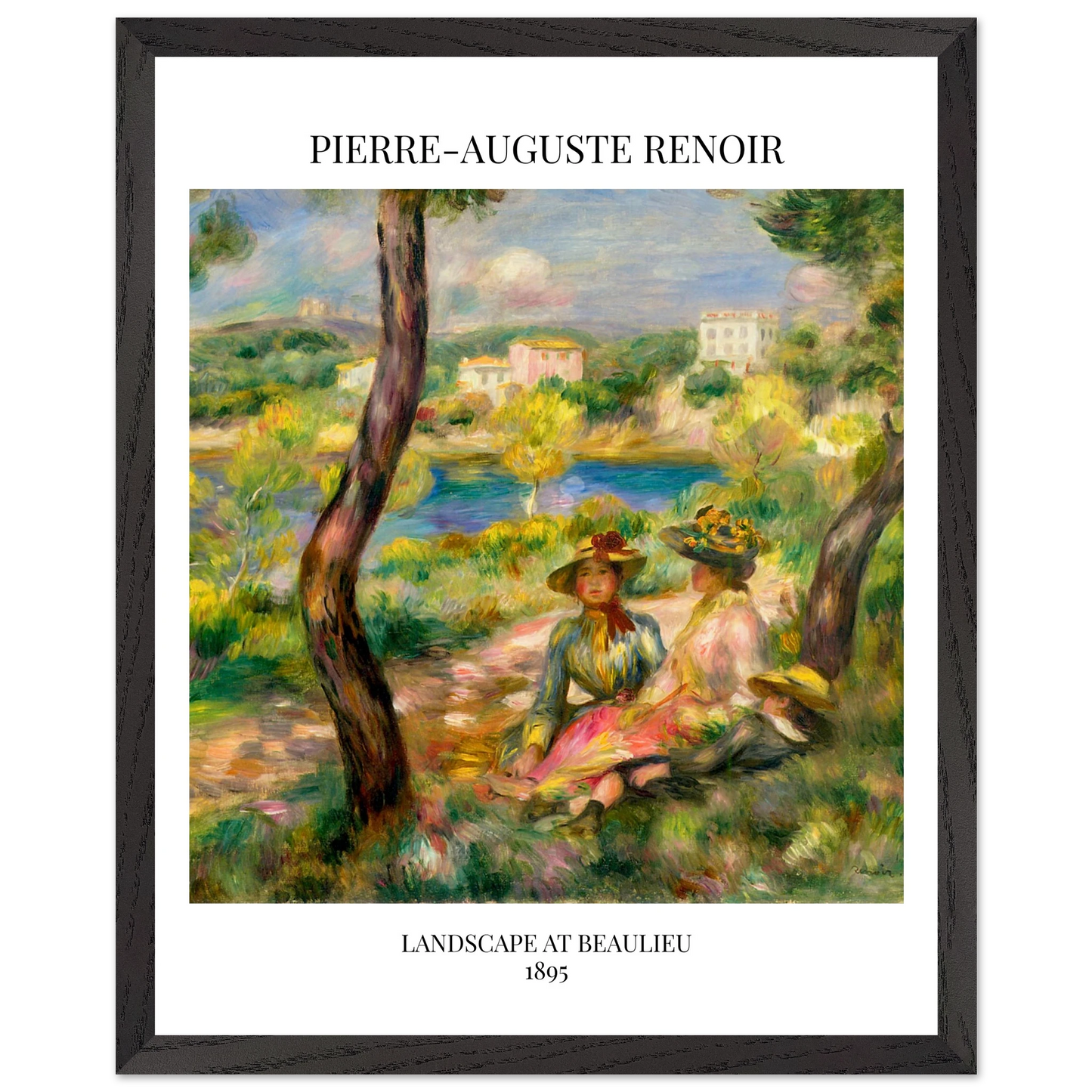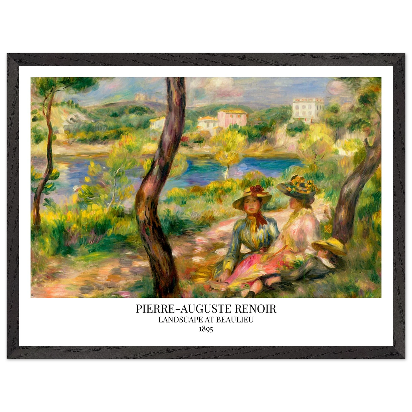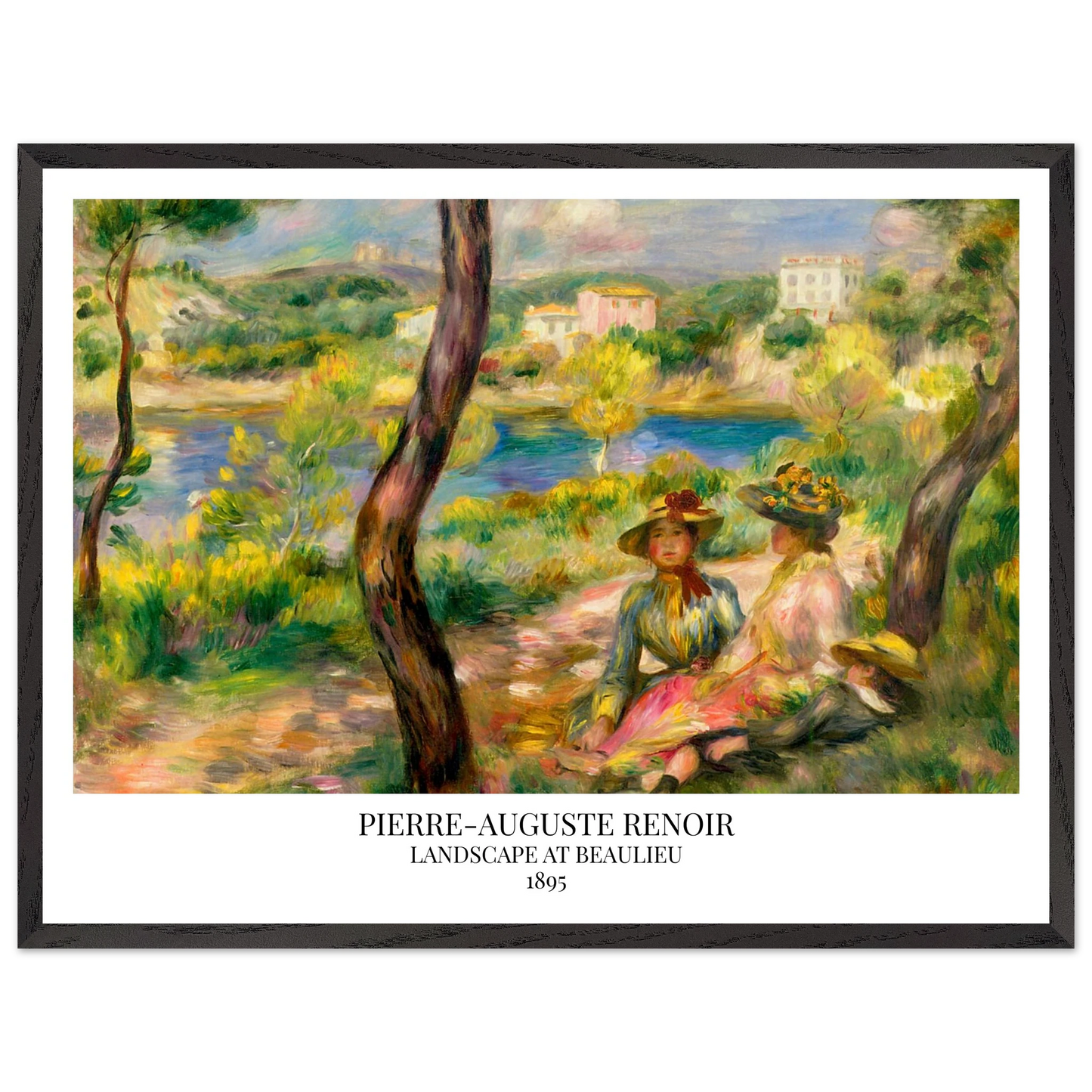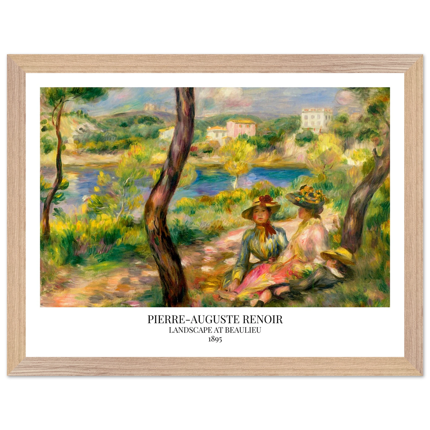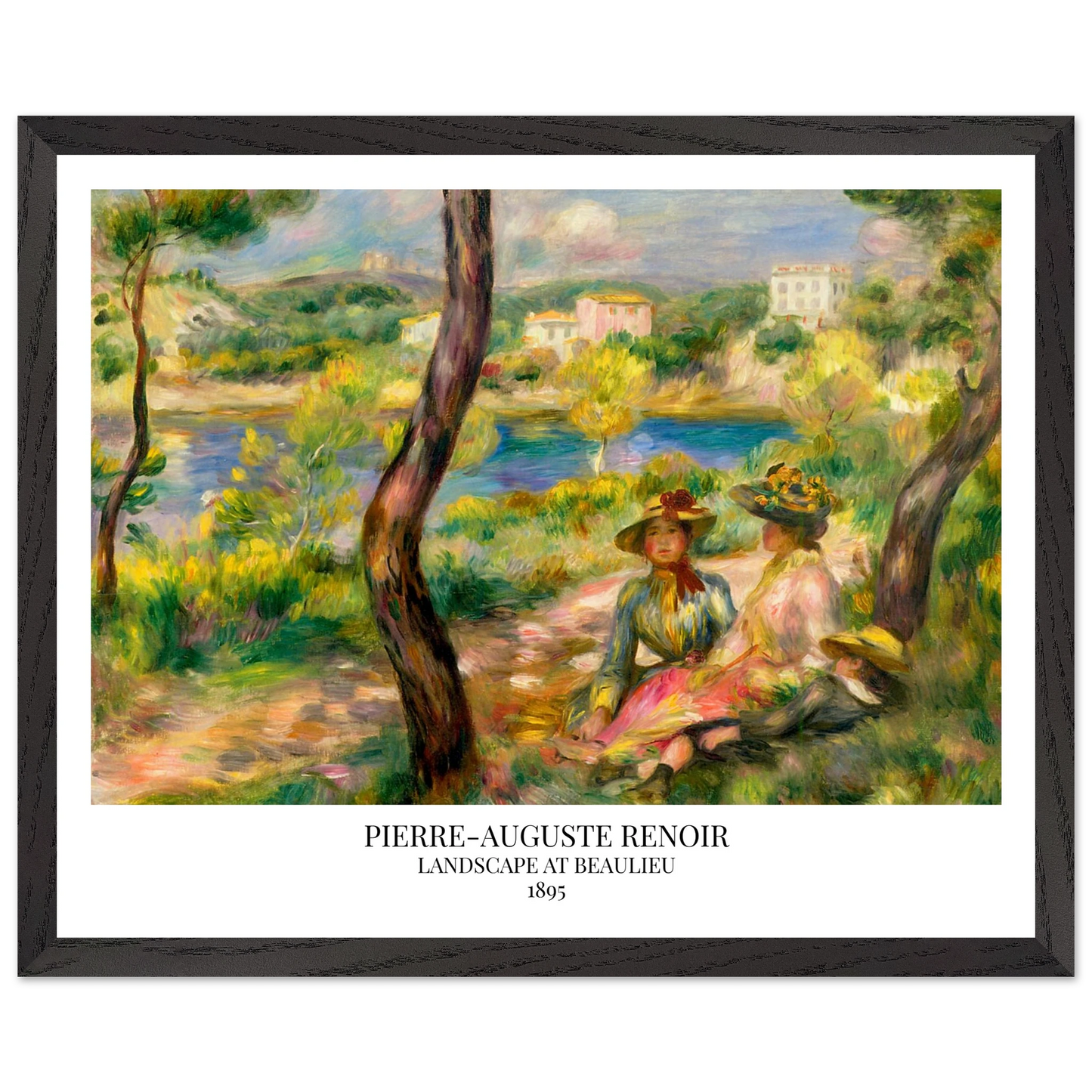 In Landscape at Beaulieu (1895) verbindet Pierre-Auguste Renoir meisterhaft Landschaft und Figurenmalerei. Zwei elegant gekleidete Frauen und ein Kind ruhen im Schatten eines Baumes am Ufer eines ruhigen Gewässers, eingebettet in die mediterrane Landschaft der Côte d’Azur. Die weichen Pinselstriche, das leuchtende Licht und die warme Farbpalette verleihen dem Gemälde eine träumerische, fast zeitlose Atmosphäre. Es spiegelt Renoirs Spätstil wider, in dem Natur und Mensch in harmonischer Einheit erscheinen.