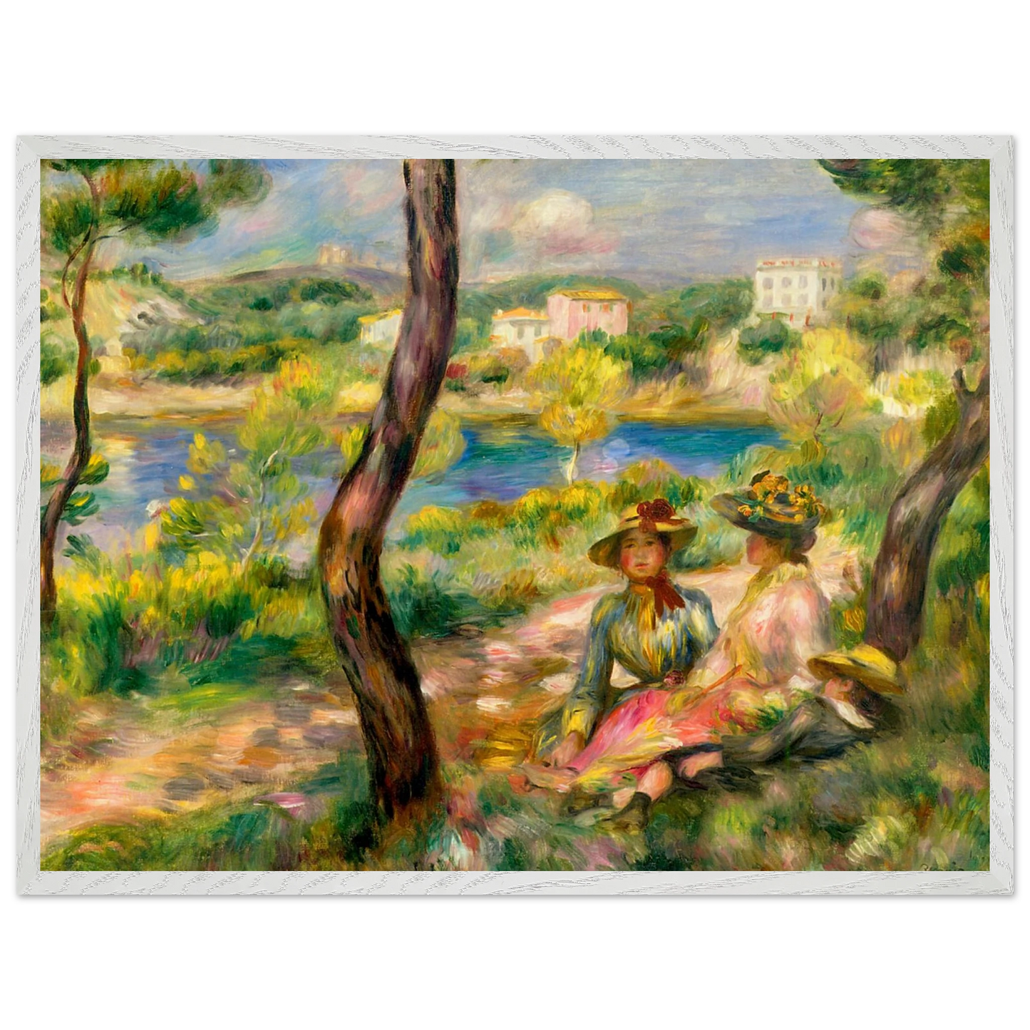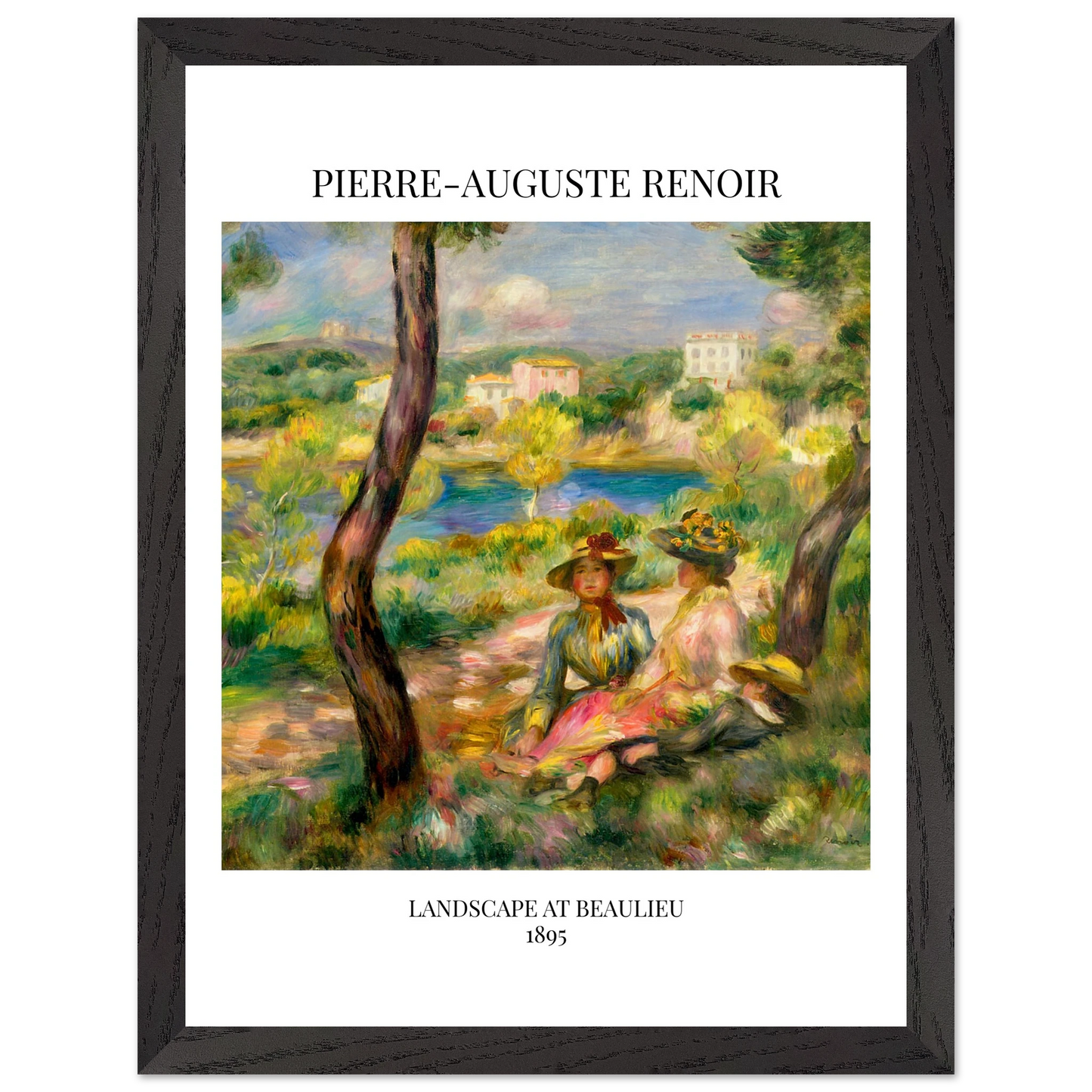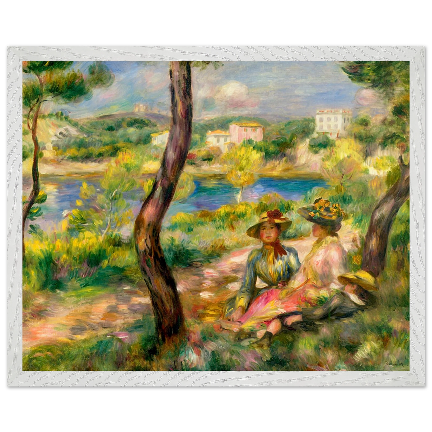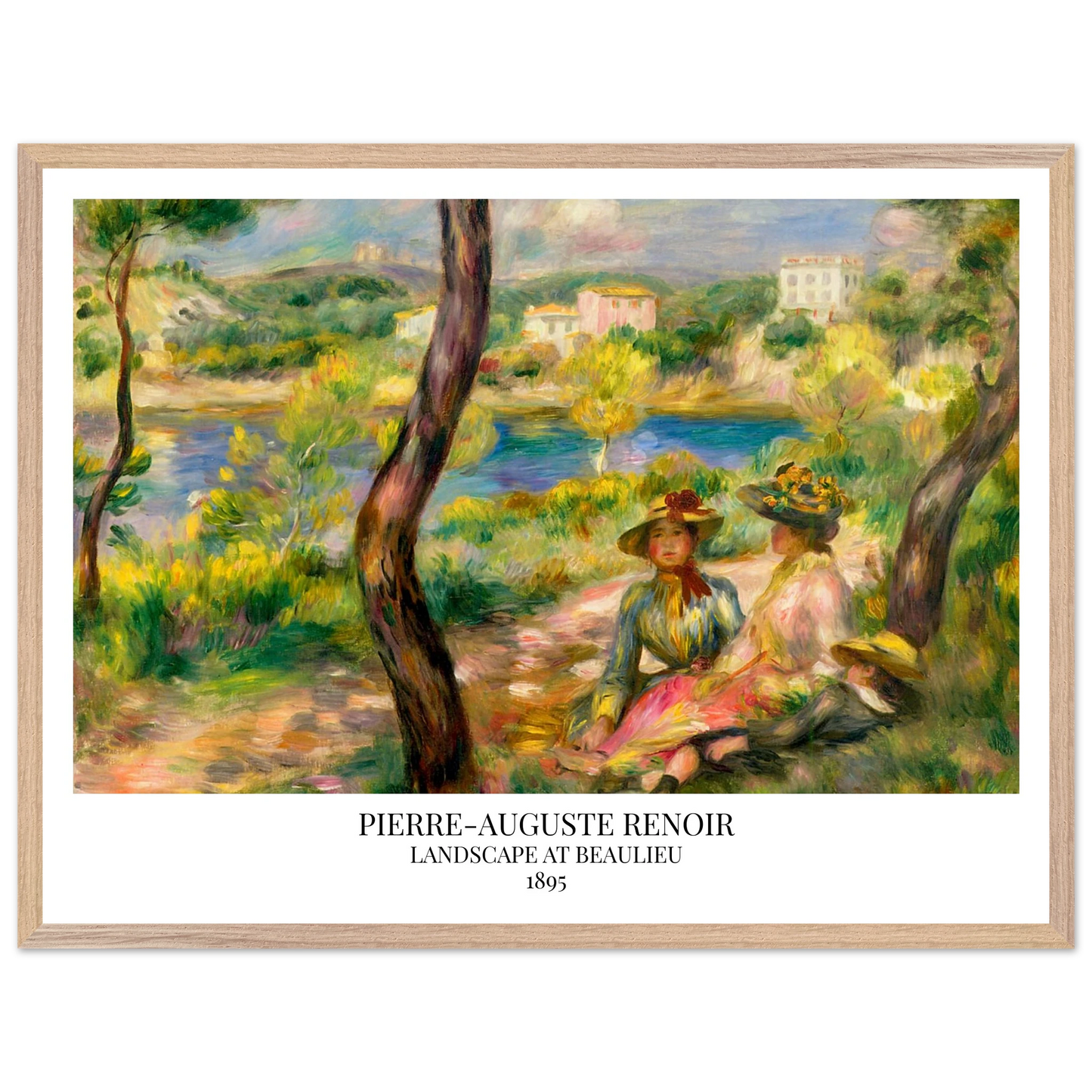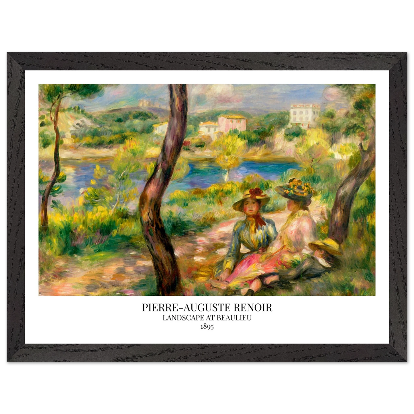 In Landscape at Beaulieu (1895) verbindet Pierre-Auguste Renoir meisterhaft Landschaft und Figurenmalerei. Zwei elegant gekleidete Frauen und ein Kind ruhen im Schatten eines Baumes am Ufer eines ruhigen Gewässers, eingebettet in die mediterrane Landschaft der Côte d’Azur. Die weichen Pinselstriche, das leuchtende Licht und die warme Farbpalette verleihen dem Gemälde eine träumerische, fast zeitlose Atmosphäre. Es spiegelt Renoirs Spätstil wider, in dem Natur und Mensch in harmonischer Einheit erscheinen.