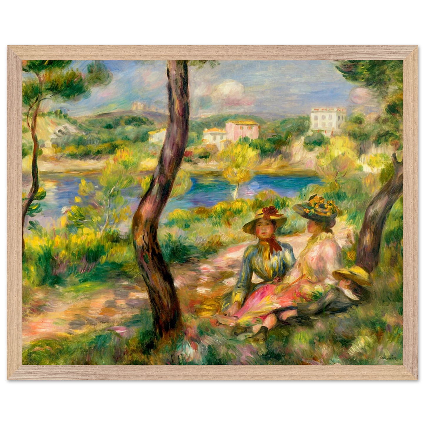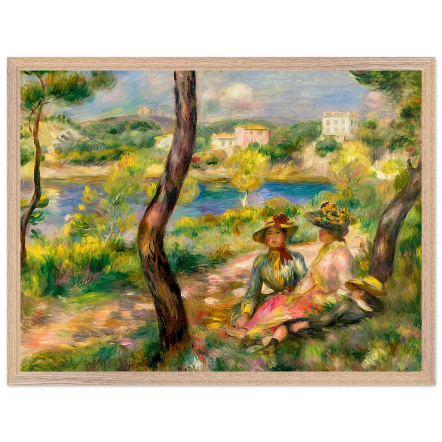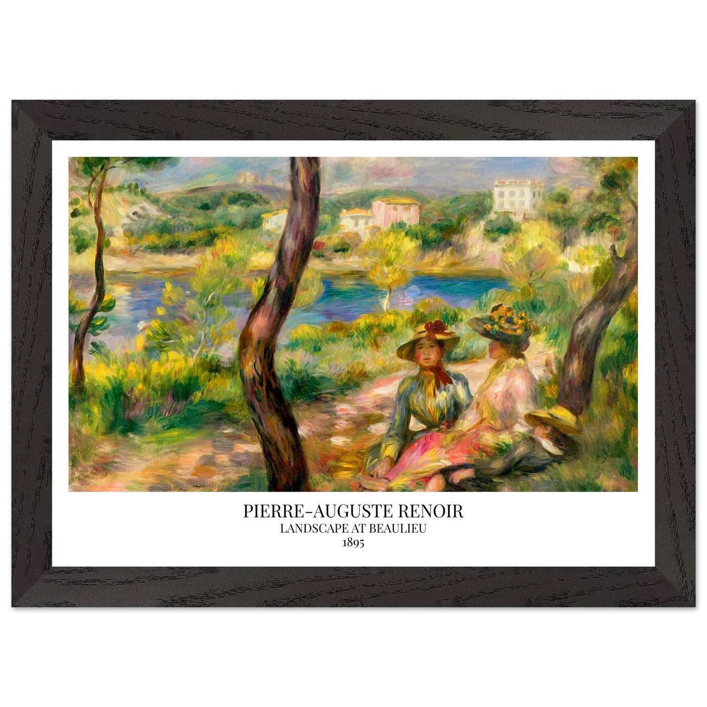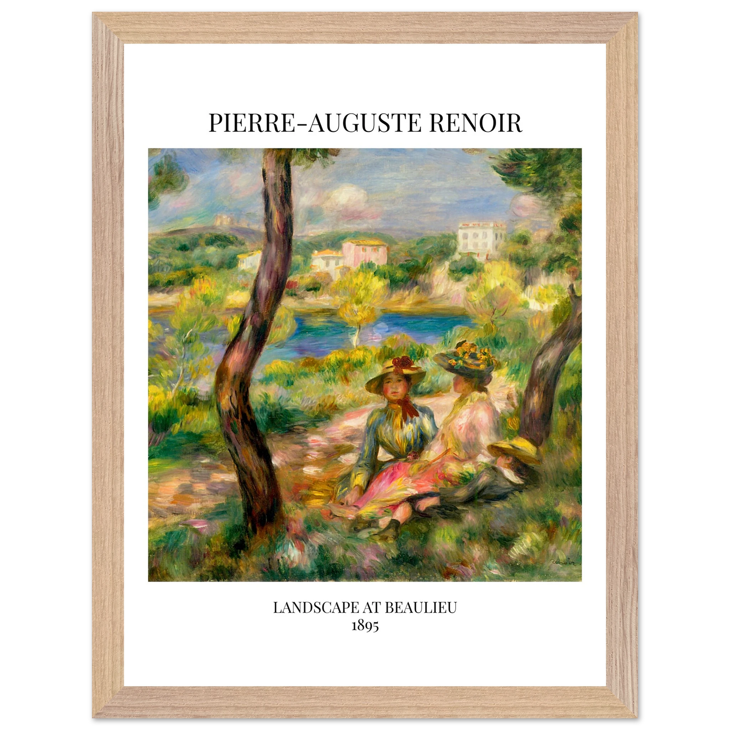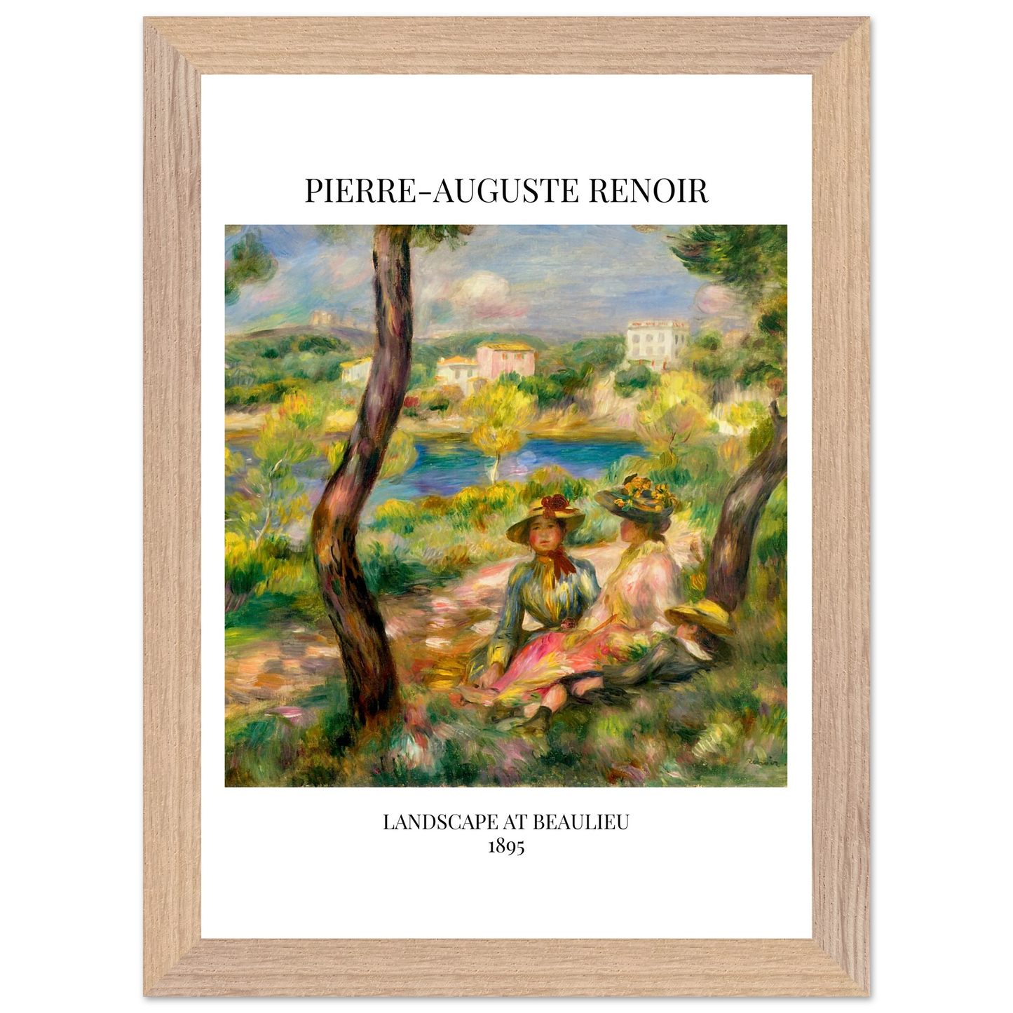 In Landscape at Beaulieu (1895) verbindet Pierre-Auguste Renoir meisterhaft Landschaft und Figurenmalerei. Zwei elegant gekleidete Frauen und ein Kind ruhen im Schatten eines Baumes am Ufer eines ruhigen Gewässers, eingebettet in die mediterrane Landschaft der Côte d’Azur. Die weichen Pinselstriche, das leuchtende Licht und die warme Farbpalette verleihen dem Gemälde eine träumerische, fast zeitlose Atmosphäre. Es spiegelt Renoirs Spätstil wider, in dem Natur und Mensch in harmonischer Einheit erscheinen.