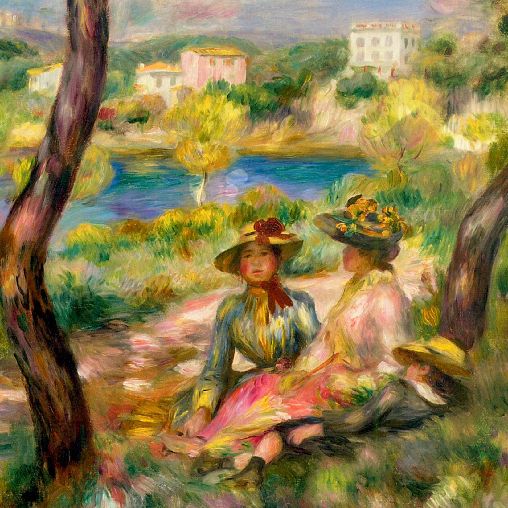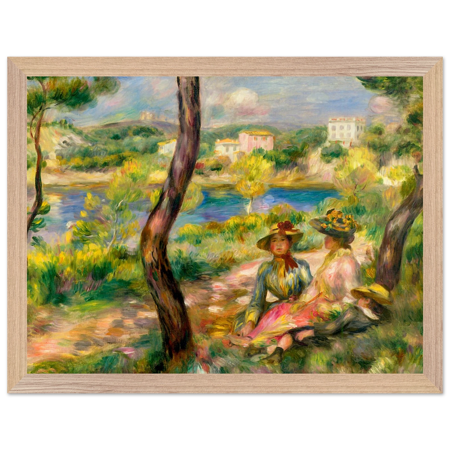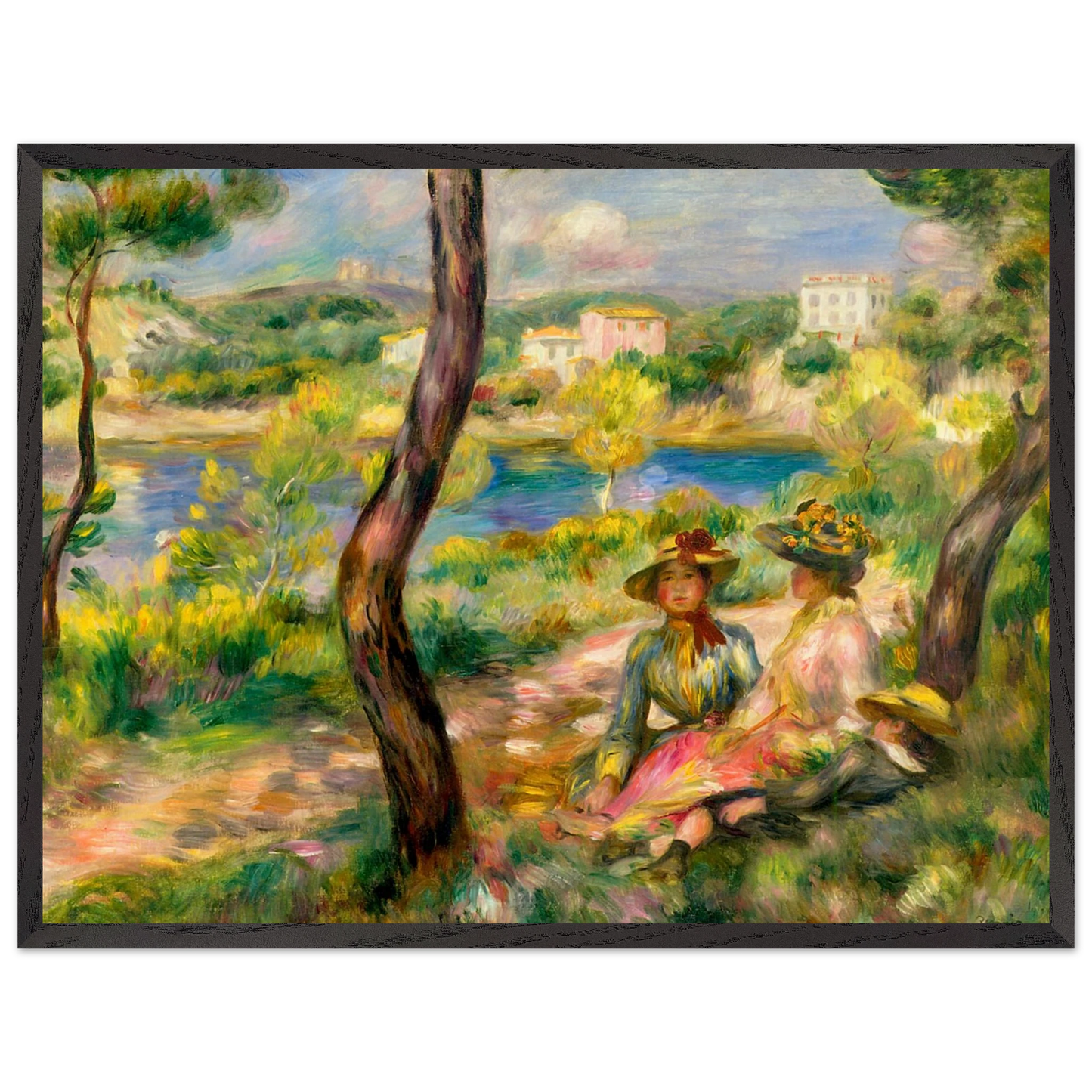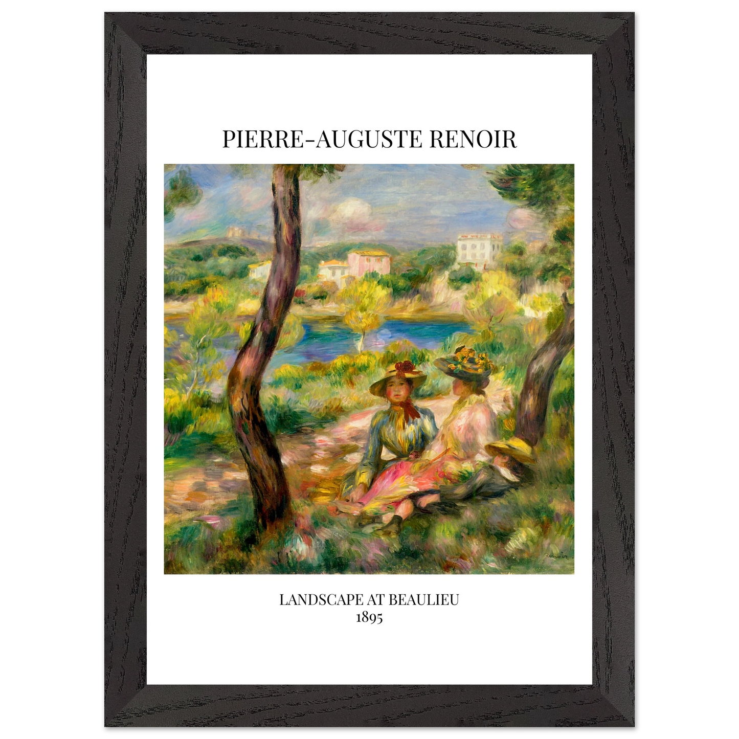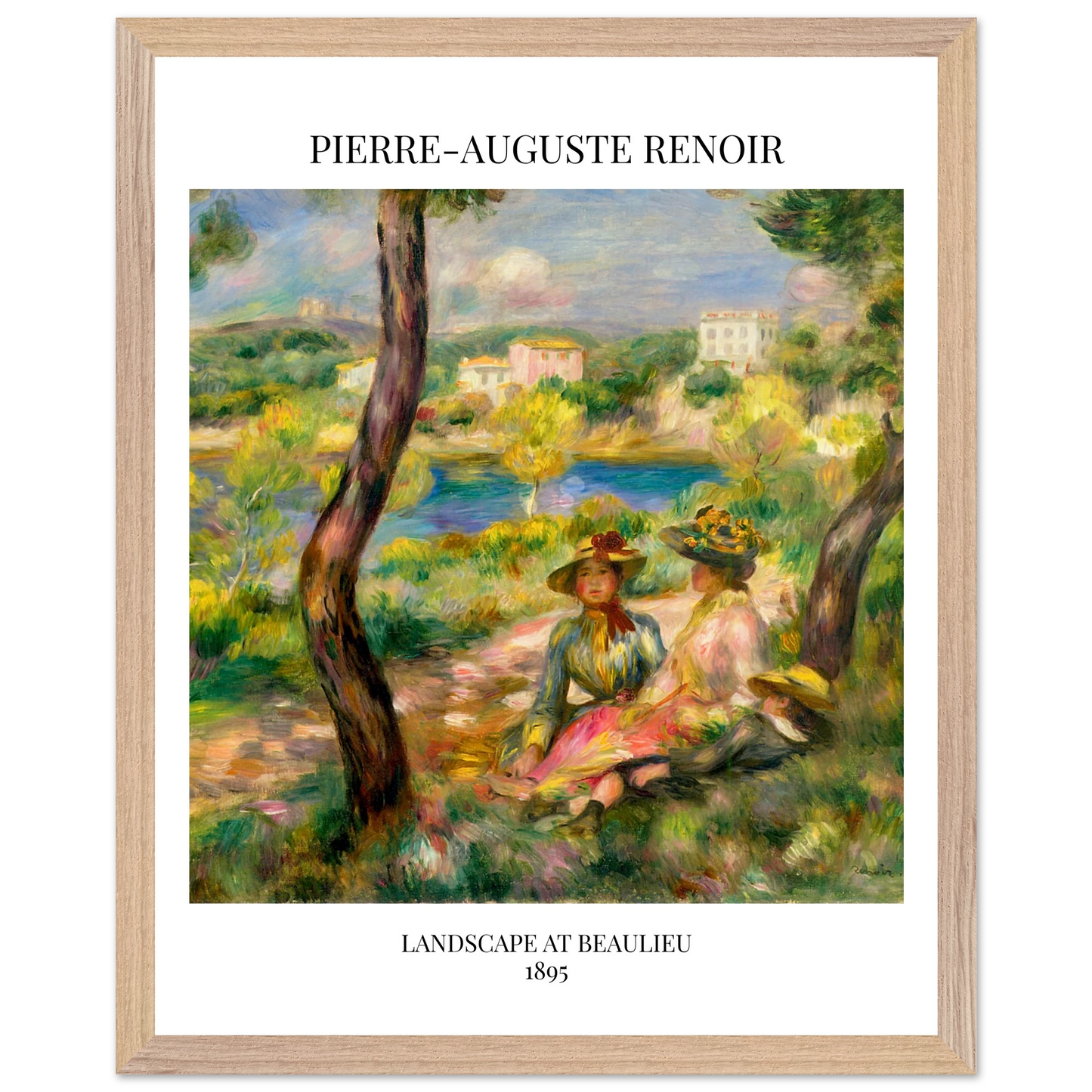 In Landscape at Beaulieu (1895) verbindet Pierre-Auguste Renoir meisterhaft Landschaft und Figurenmalerei. Zwei elegant gekleidete Frauen und ein Kind ruhen im Schatten eines Baumes am Ufer eines ruhigen Gewässers, eingebettet in die mediterrane Landschaft der Côte d’Azur. Die weichen Pinselstriche, das leuchtende Licht und die warme Farbpalette verleihen dem Gemälde eine träumerische, fast zeitlose Atmosphäre. Es spiegelt Renoirs Spätstil wider, in dem Natur und Mensch in harmonischer Einheit erscheinen.