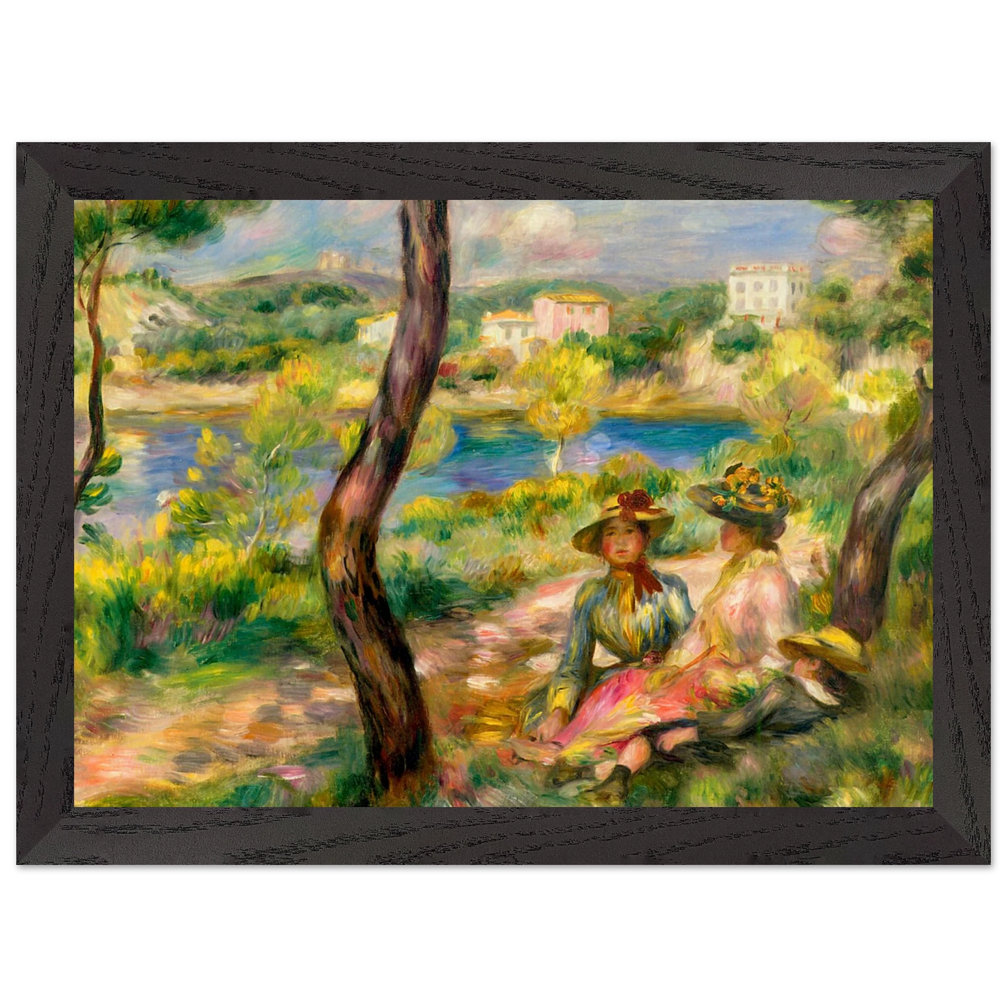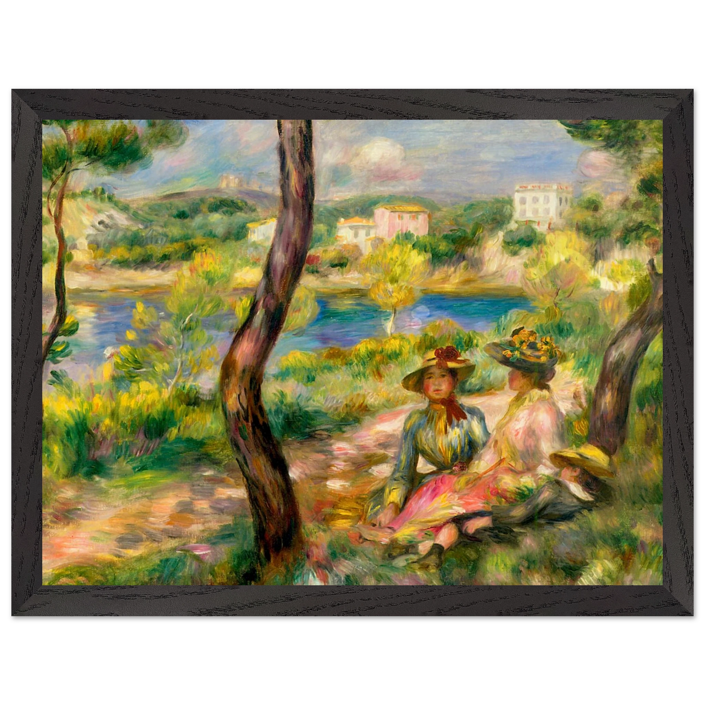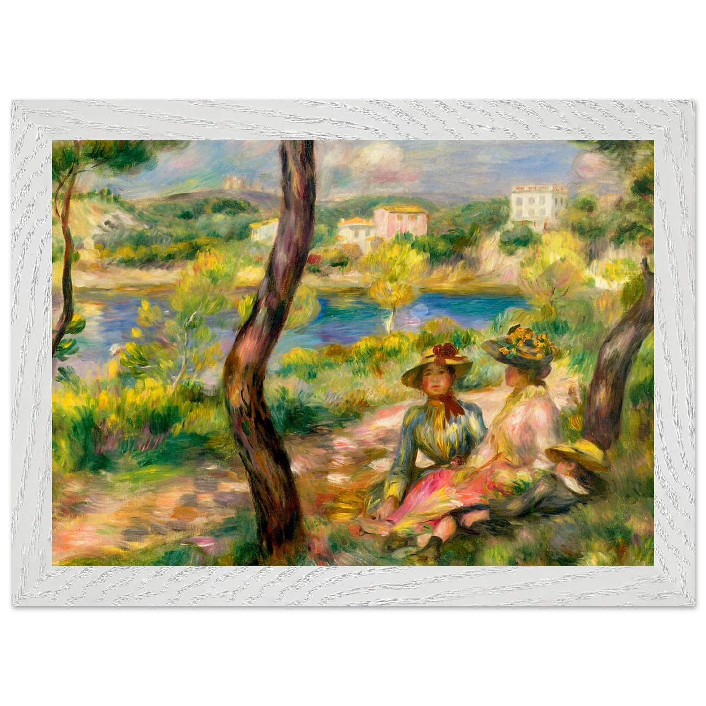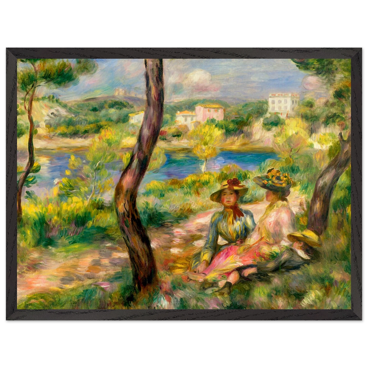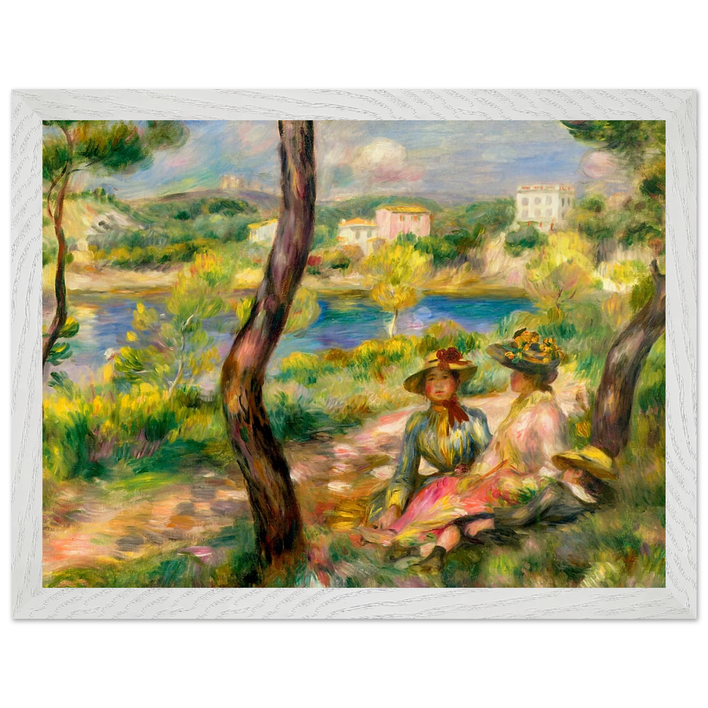 In Landscape at Beaulieu (1895) verbindet Pierre-Auguste Renoir meisterhaft Landschaft und Figurenmalerei. Zwei elegant gekleidete Frauen und ein Kind ruhen im Schatten eines Baumes am Ufer eines ruhigen Gewässers, eingebettet in die mediterrane Landschaft der Côte d’Azur. Die weichen Pinselstriche, das leuchtende Licht und die warme Farbpalette verleihen dem Gemälde eine träumerische, fast zeitlose Atmosphäre. Es spiegelt Renoirs Spätstil wider, in dem Natur und Mensch in harmonischer Einheit erscheinen.