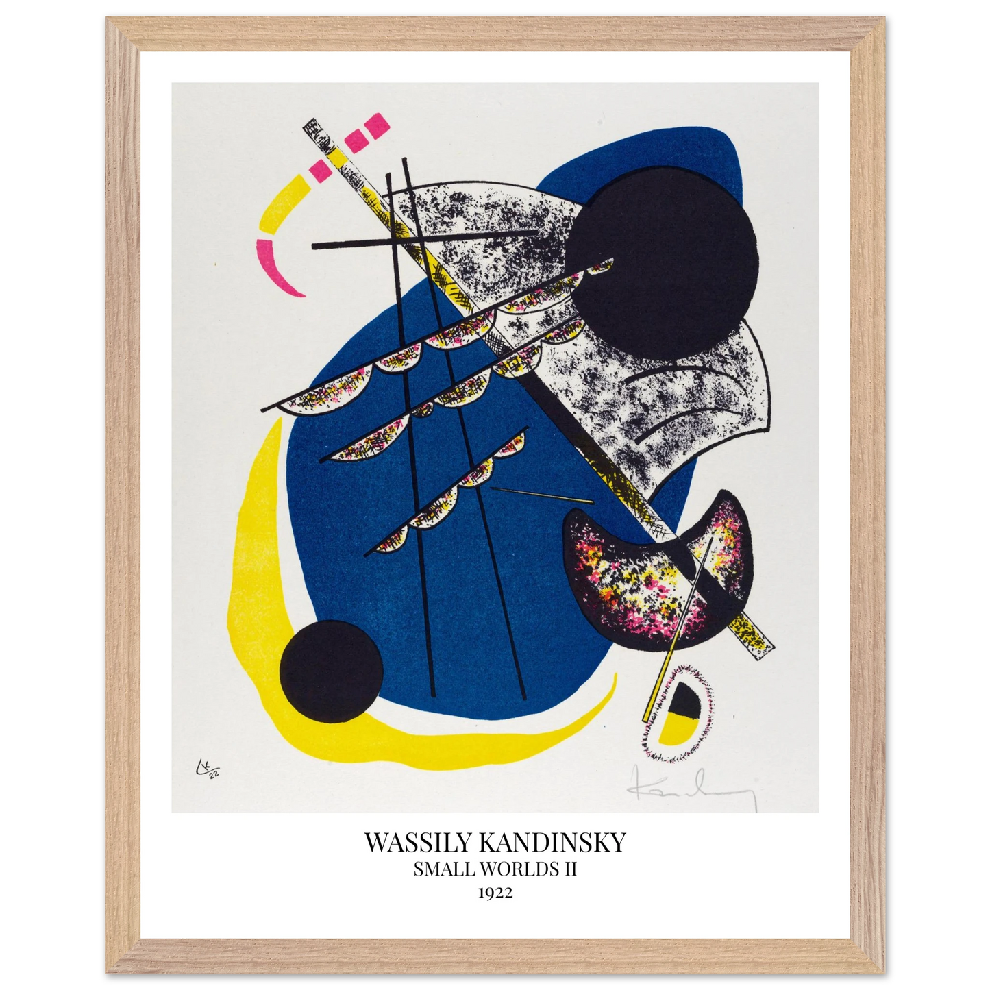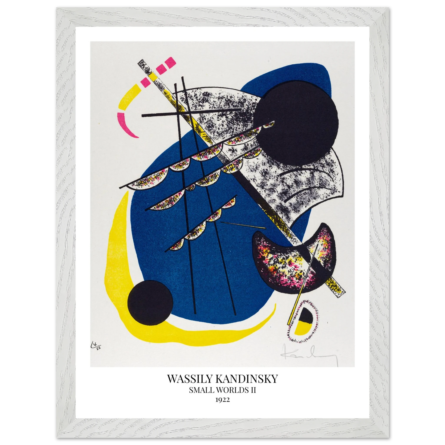Small Worlds II (1922) von Wassily Kandinsky ist die zweite Arbeit der zwölfteiligen Serie Kleine Welten und zeigt eine dichte, kreisförmig aufgebaute Komposition aus geometrischen und organischen Elementen. In dieser Lithografie verbindet Kandinsky Bewegung, Raum und musikalische Struktur zu einer abstrakten Bildwelt voller Spannung und Harmonie.