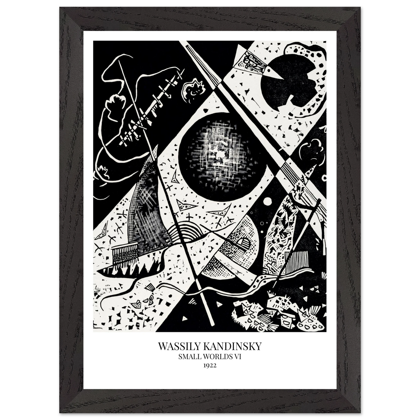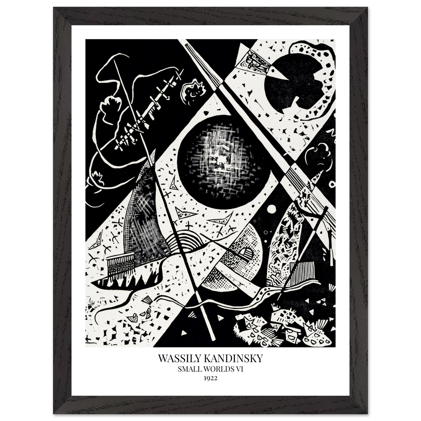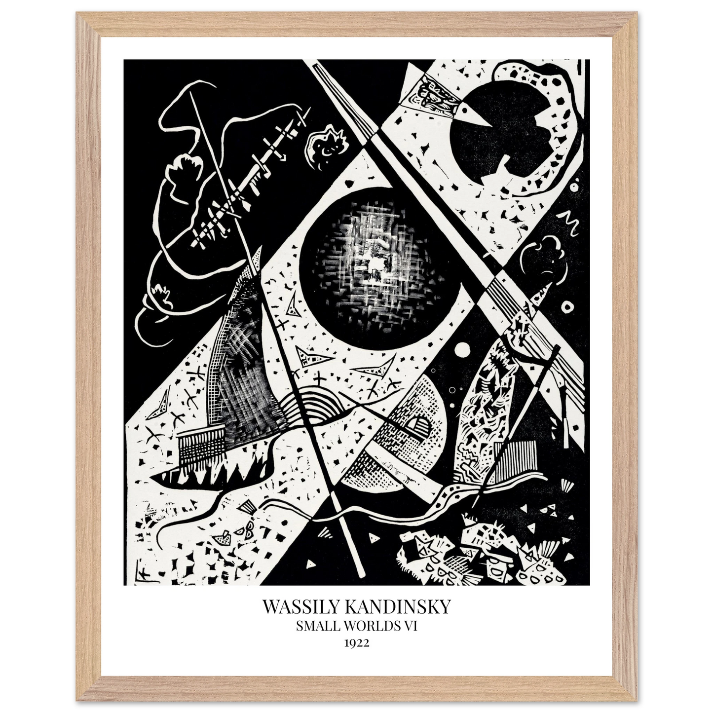 Small Worlds VI (1922) von Wassily Kandinsky ist der sechste Druck der zwölfteiligen Serie Kleine Welten und gehört zu den Holzschnitten der Reihe. In dieser Arbeit kombiniert Kandinsky kantige, architektonisch anmutende Formen mit flächigen Elementen und reduzierter Farbigkeit. Das Werk vermittelt eine strukturierte, fast monumentale Bildwirkung – abstrakt, klar und zugleich symbolisch aufgeladen.
