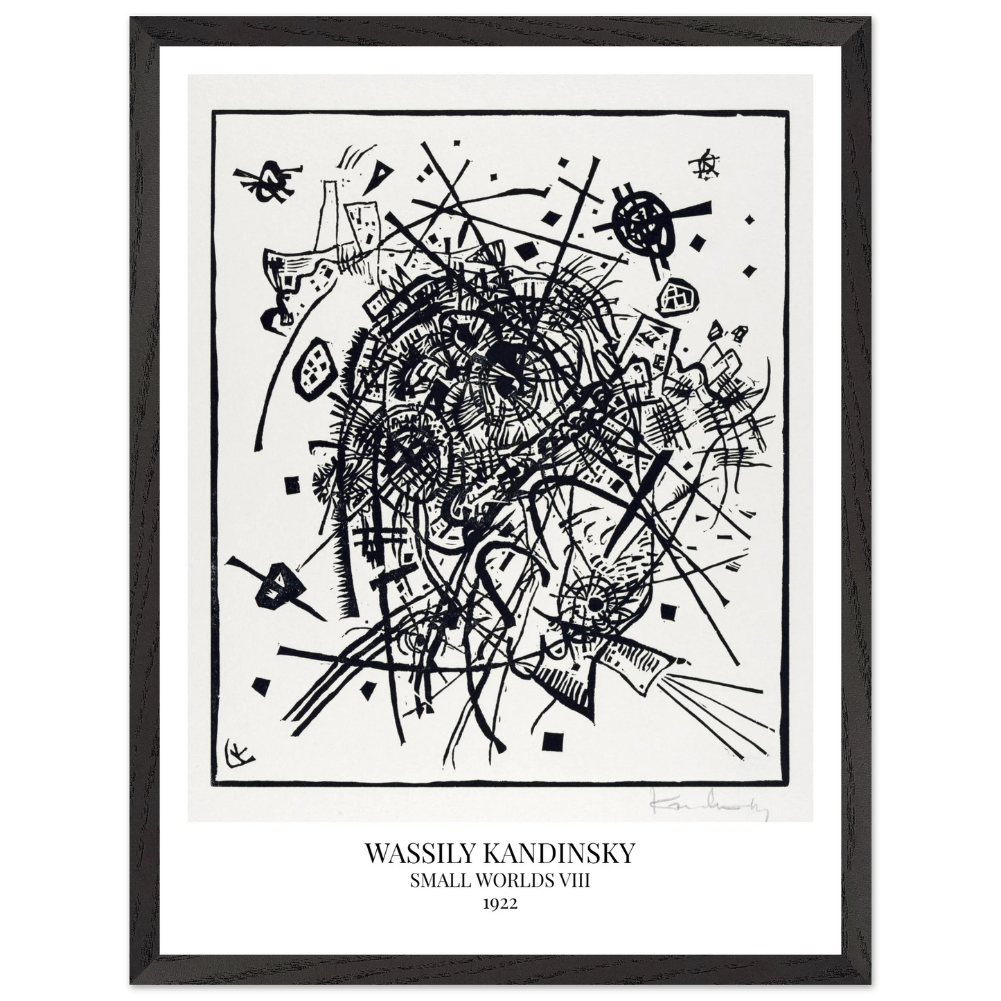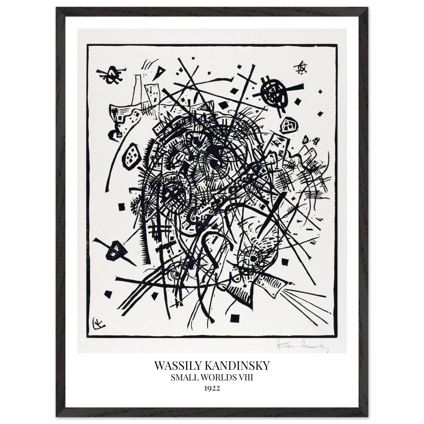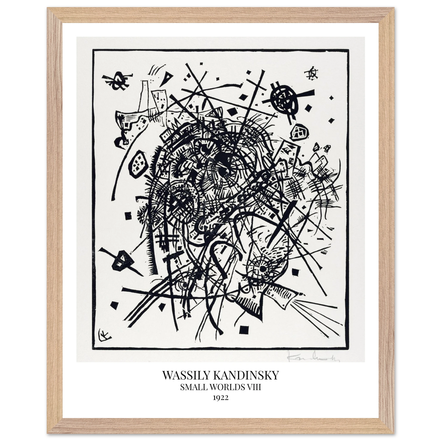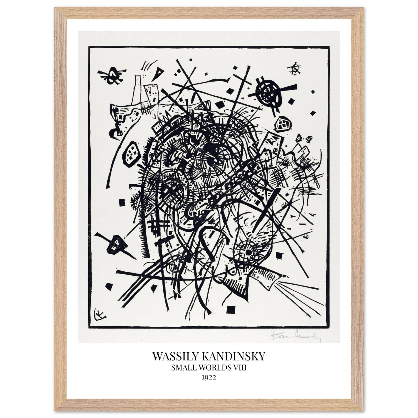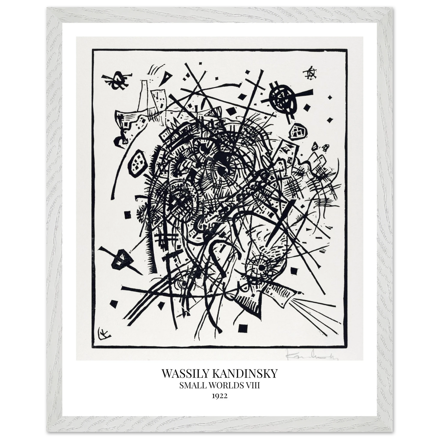 Small Worlds VIII (1922) von Wassily Kandinsky ist der achte Druck der zwölfteiligen Serie Kleine Welten und zählt zu den Radierungen der Reihe. Die Komposition besteht aus feinen, ineinander verschachtelten Linien und geometrischen Formen, die ein komplexes, fast mechanisch wirkendes Gefüge ergeben. Das Werk vereint technische Präzision mit rhythmischer Bewegung – ein grafisches Spiel aus Raum, Klang und Struktur.